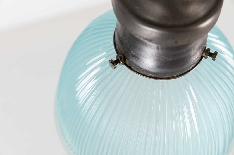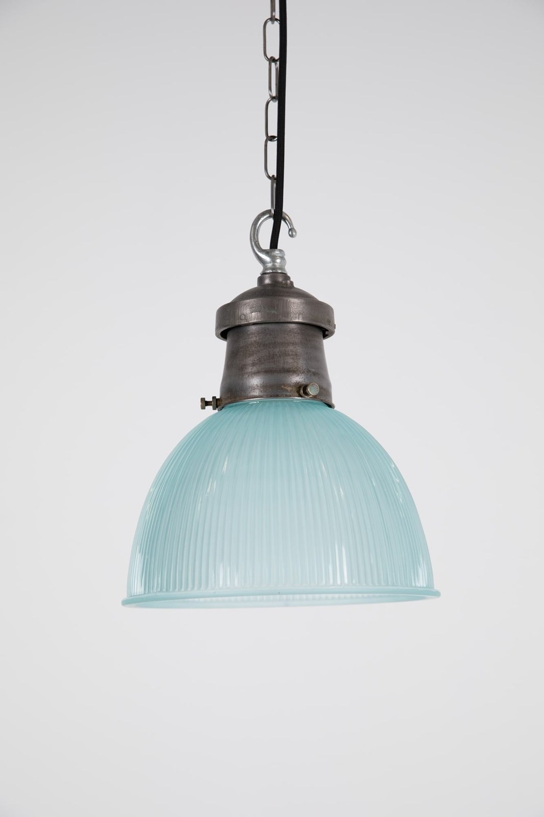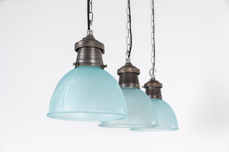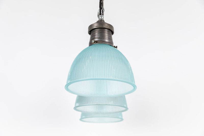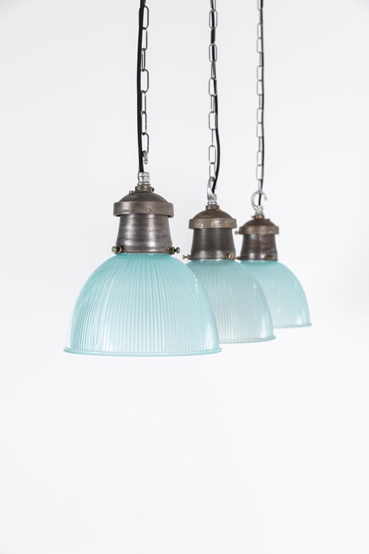 An incredible run of scarcely found blue tinted pendants made in England by Holophane. c.1930