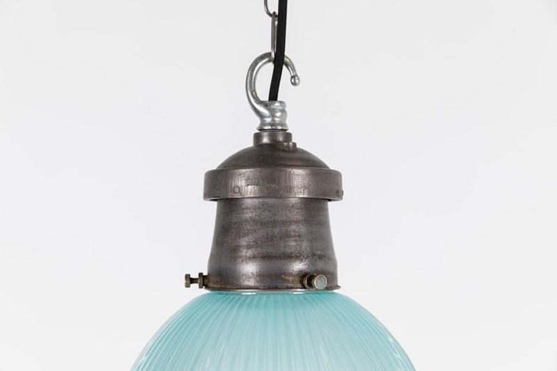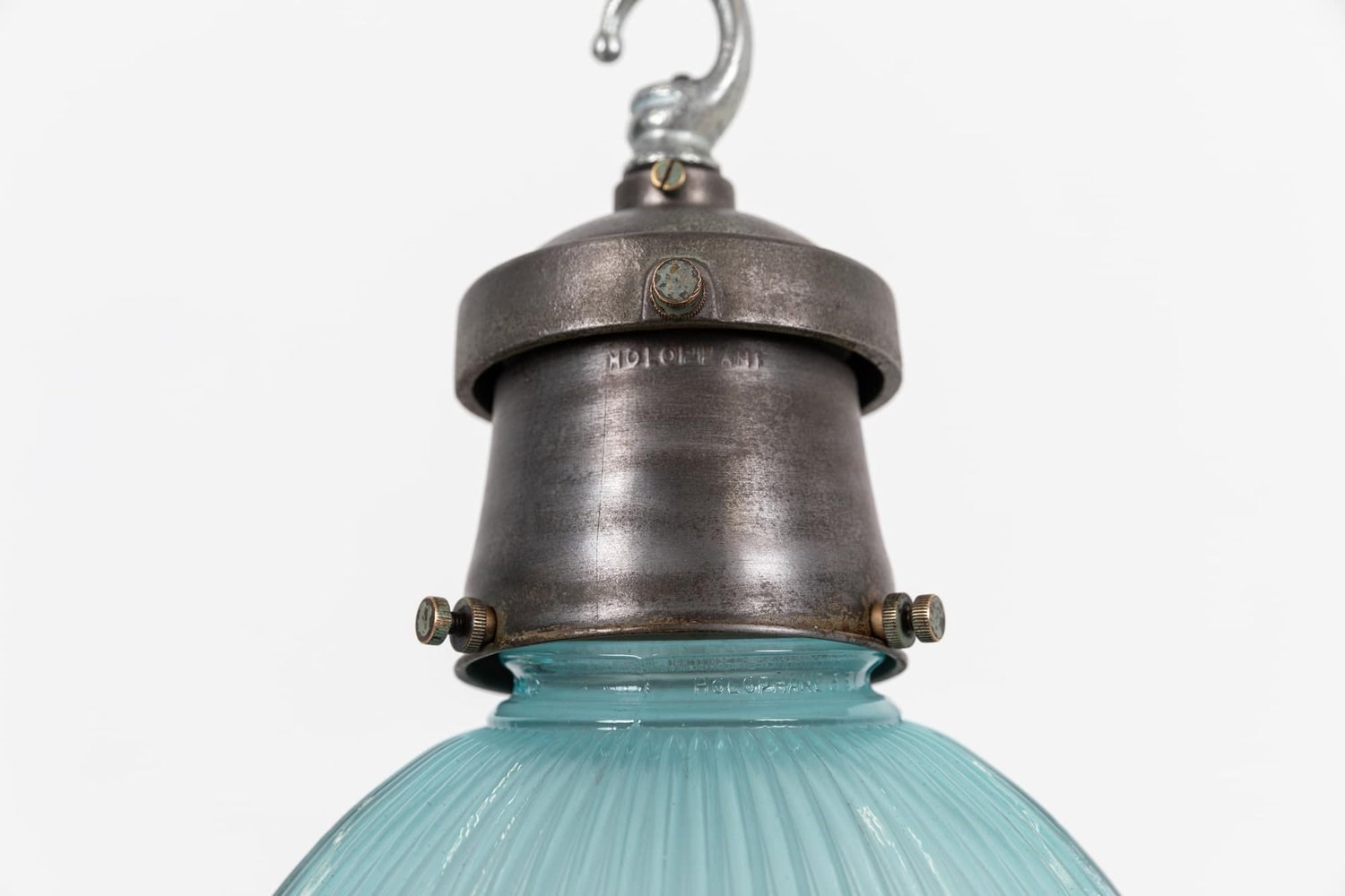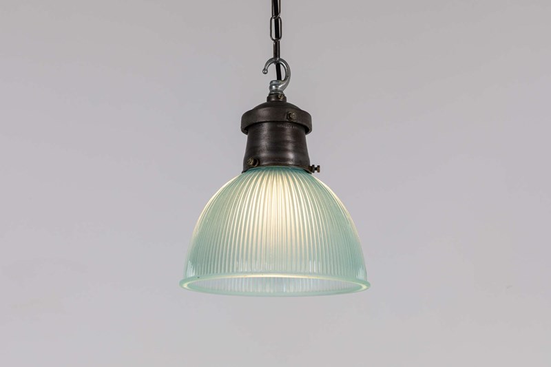 Beauitful crisp prismatic glass reflectors and original industrial cast galleries, both bearing the Holophane makers mark. Salvaged from a textile mill in the south of England where they have hung for the past 8 decades. Price is per light.