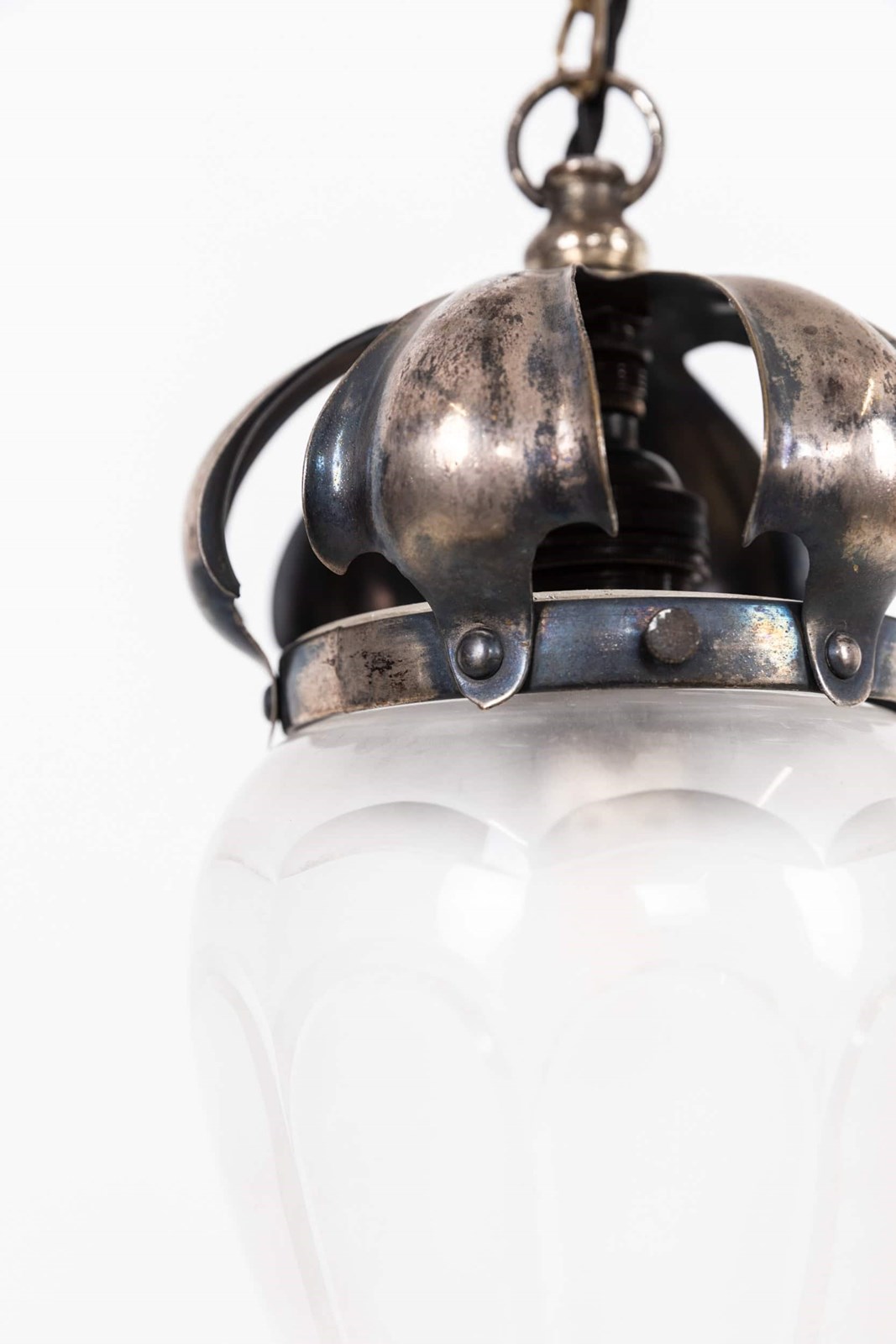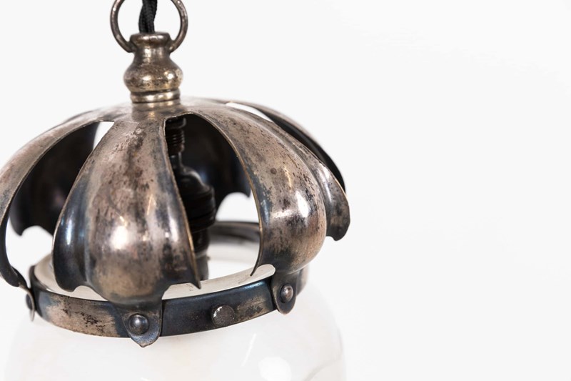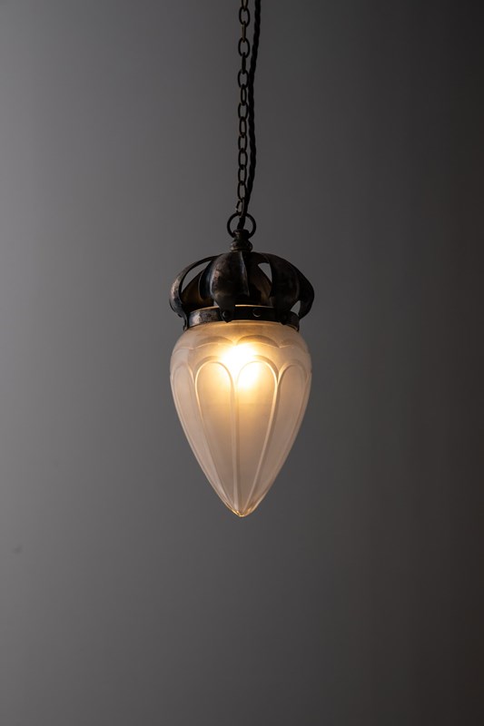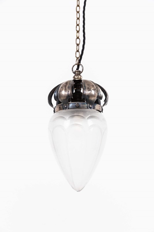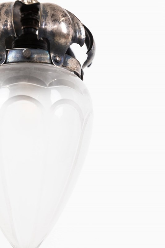 Of beautiful design and form, delicately hand-cut and frosted glass shade supported by its original oxidised silver brass gallery designed and constructed in the typical Arts & Crafts manner.