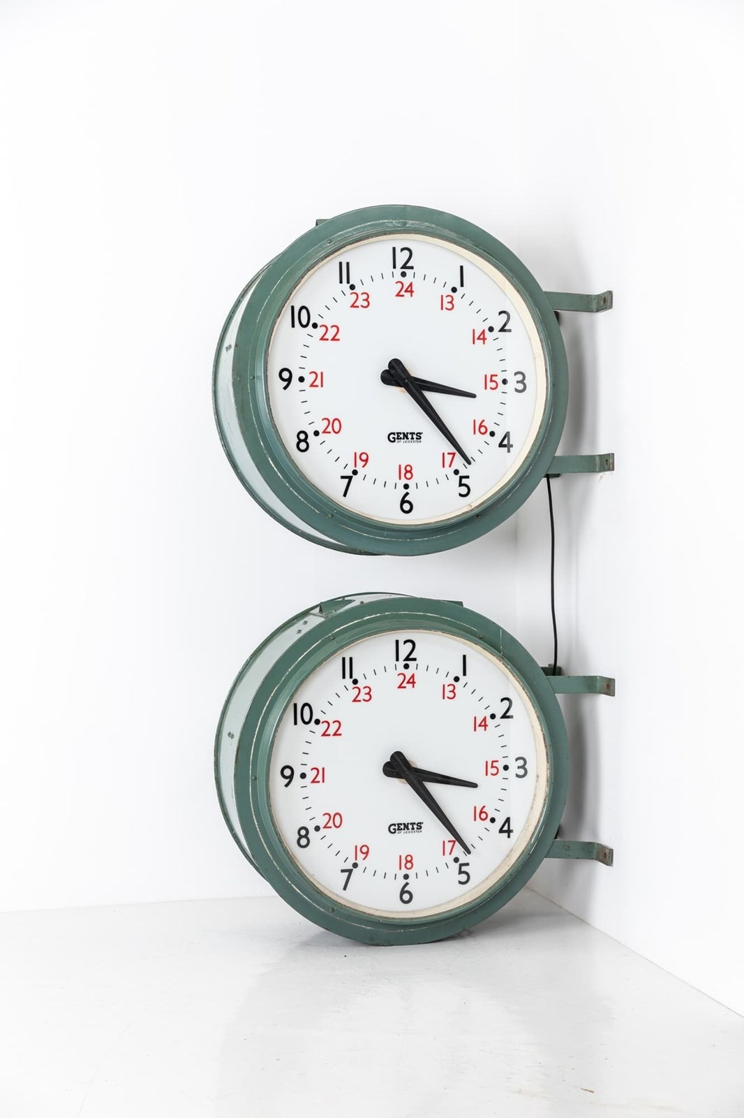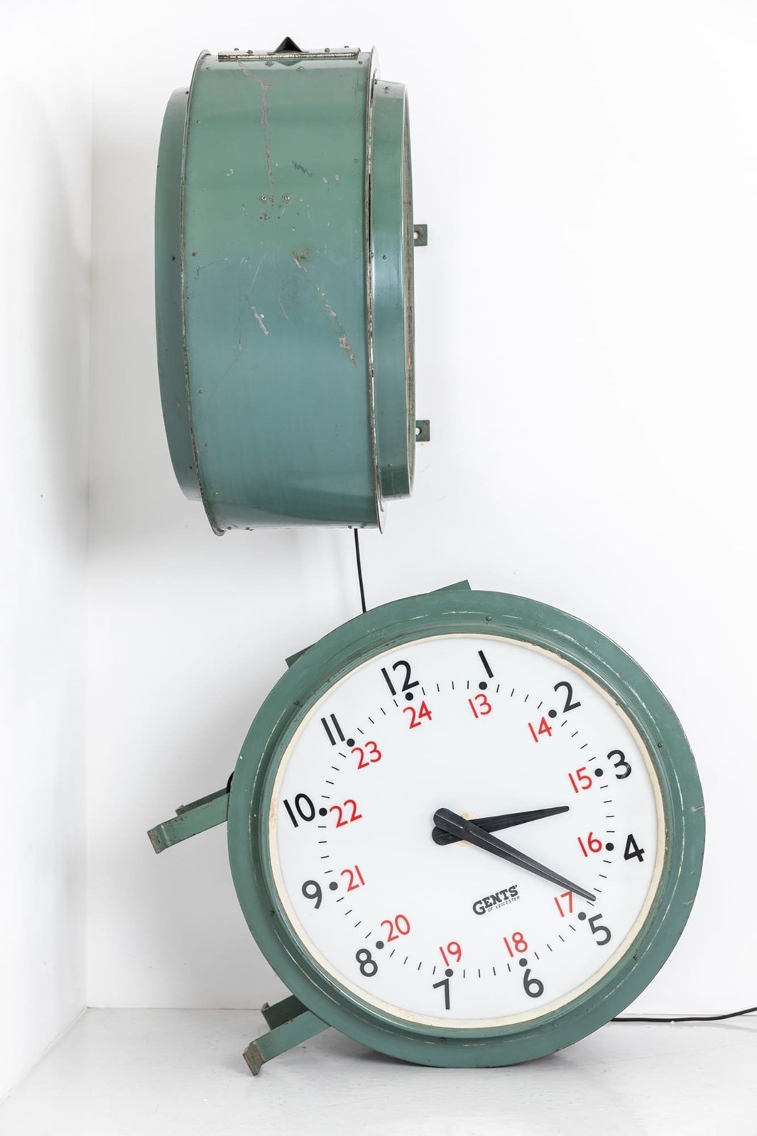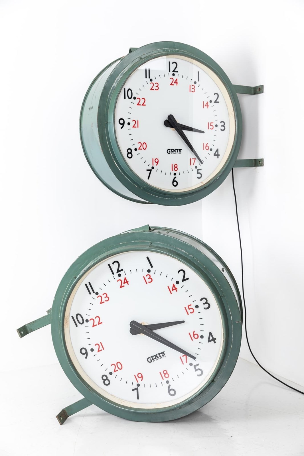 An incredible pair of large illuminated railway clocks made in England by Gents of Leicester. c.1930