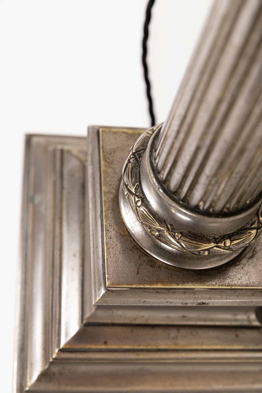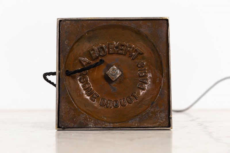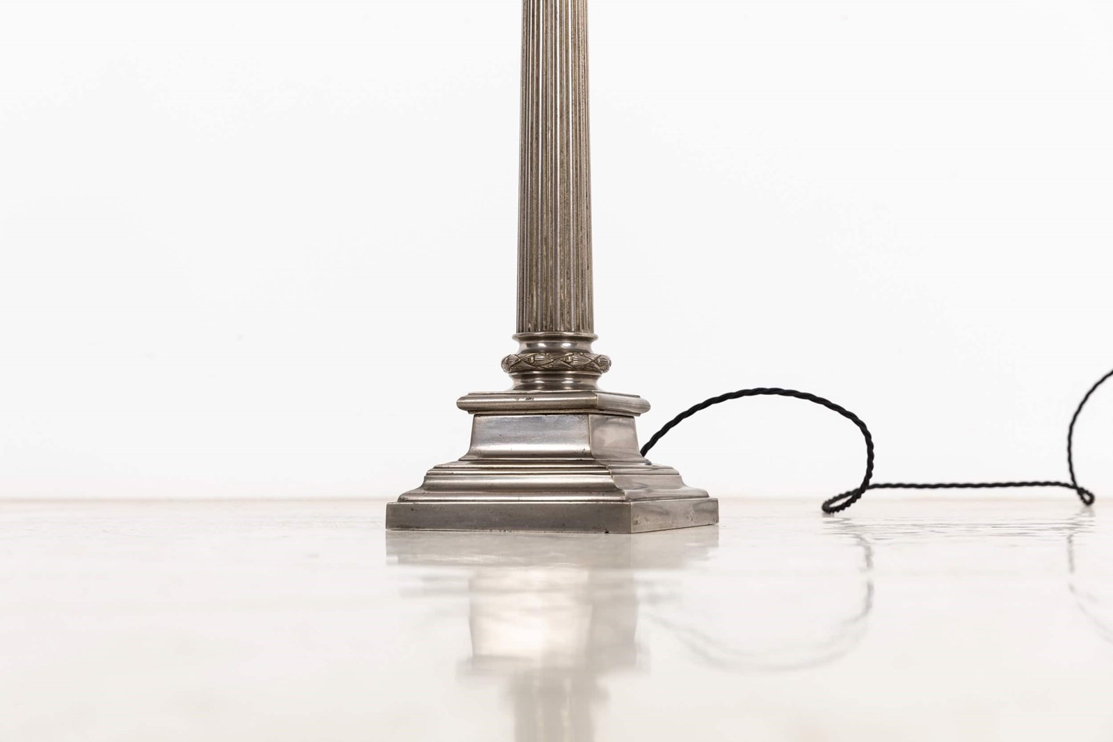 Dating to the early 20th century, very heavy duty with high quality cast details. Central stem perched elegantly above the weighted stepped base. The lamp retains its wonderful original silver plated finish. Stamped to the underside - A ROBERT, 25 RUE DROUOT PARIS