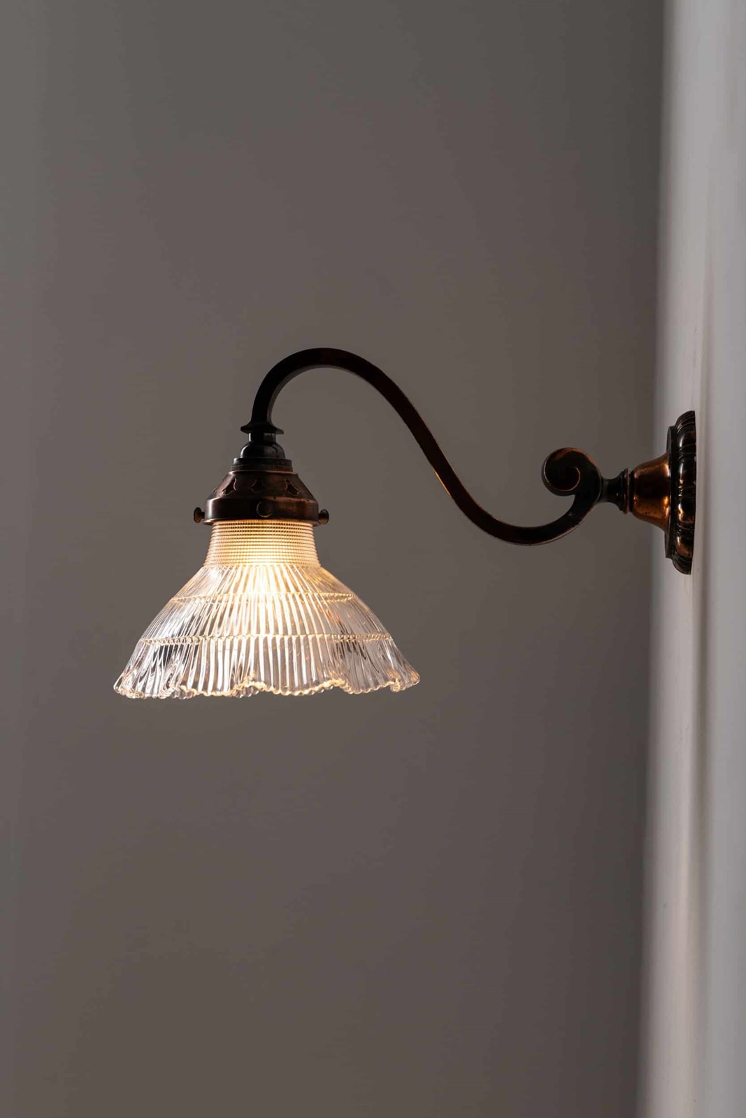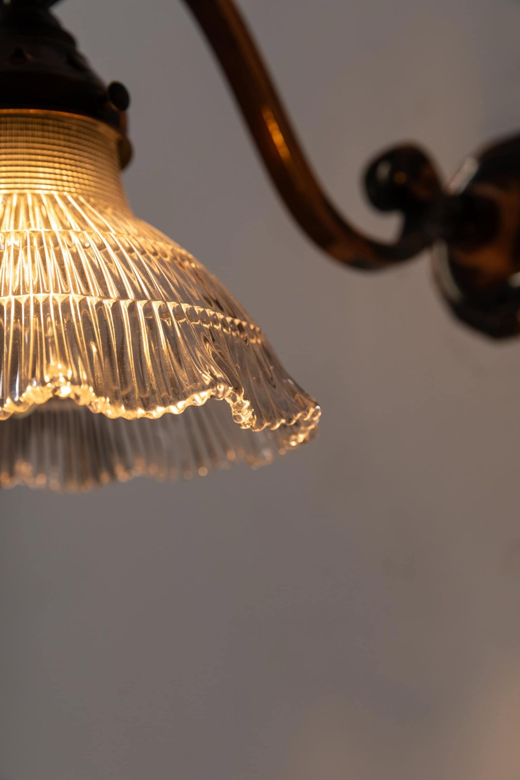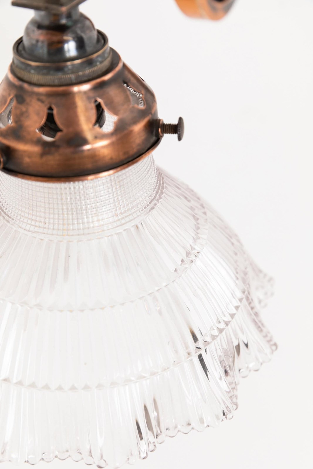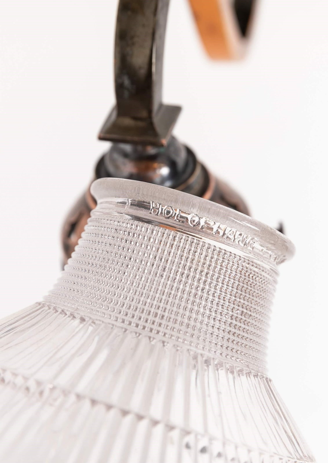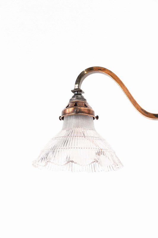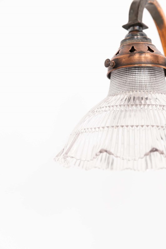 Simply designed brass metalware with its original oxidised copper finish complete with Holophane 'Stiletto' prismatic glass shade - stamped to rim.