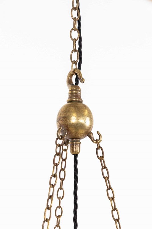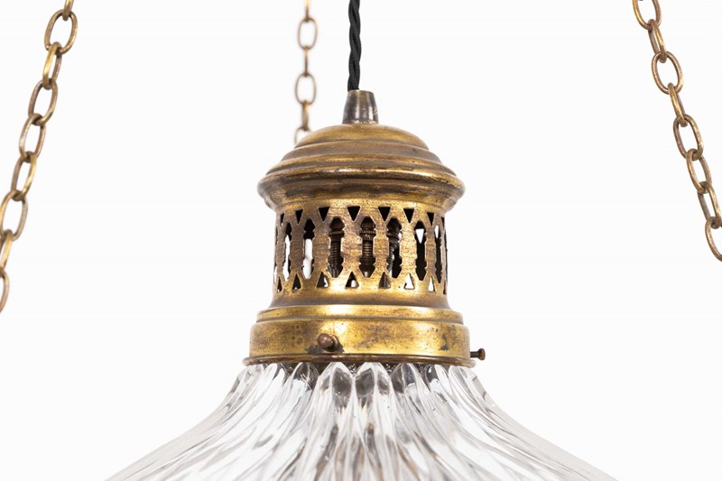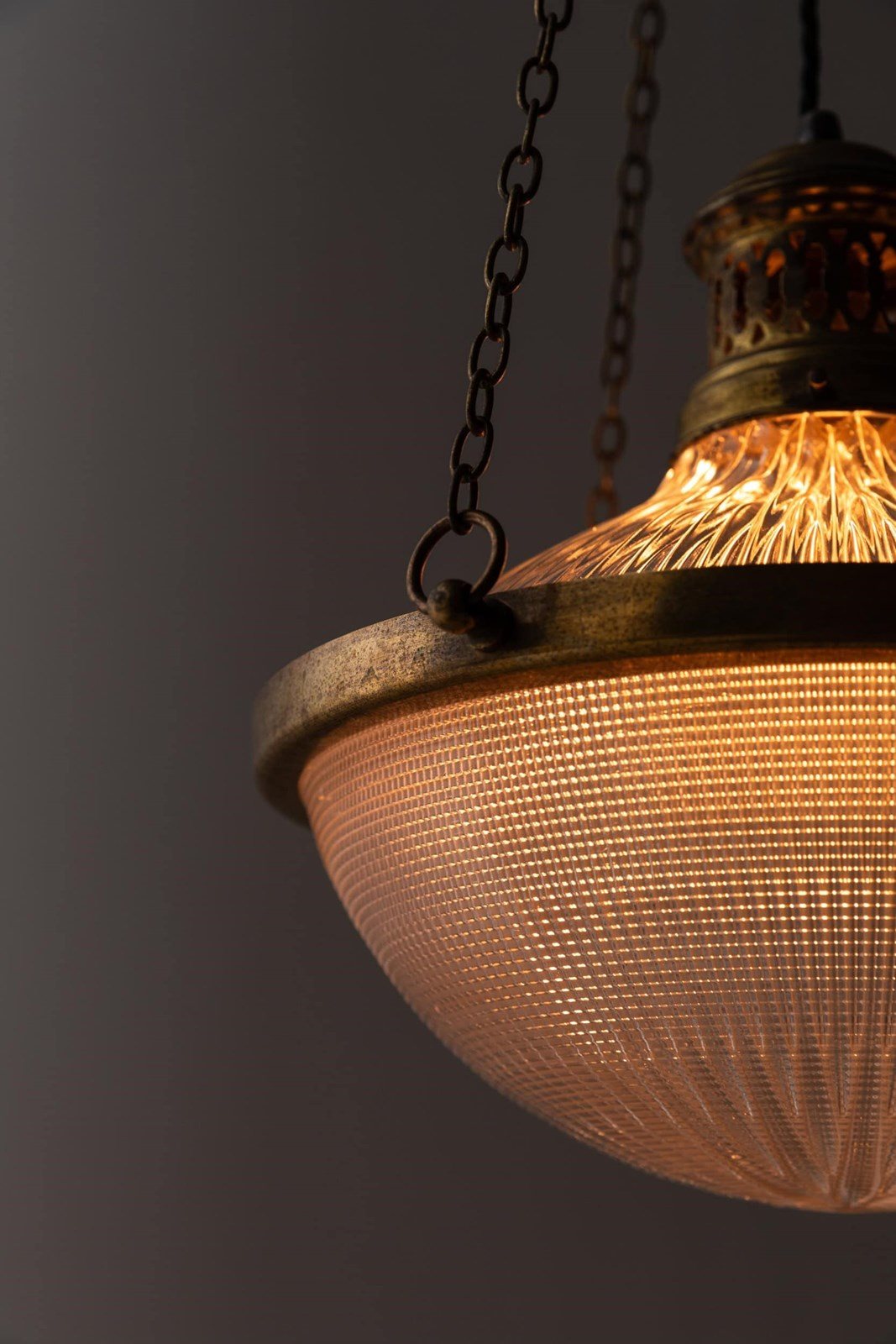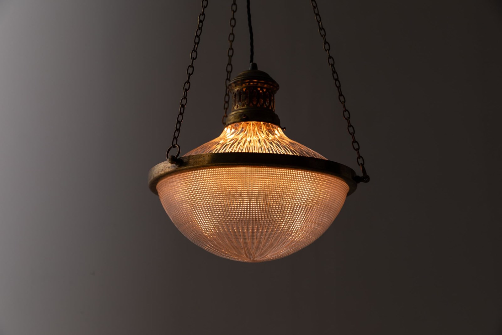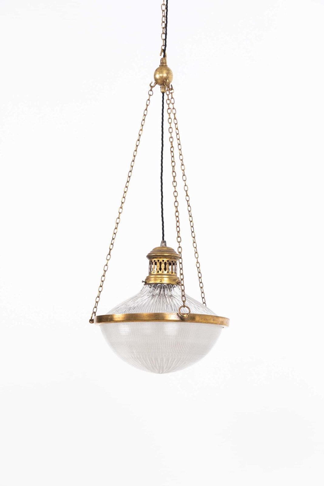 Retained with an elegant brass ring, hanger and gallery, the fitting combines industrial functionality with understated decorative appeal. Chains can be shortened to suit drop, making it adaptable for a range of interiors. A rare survivor in excellent condition, this piece exemplifies Holophane’s reputation for quality and innovation in early 20th-century lighting.