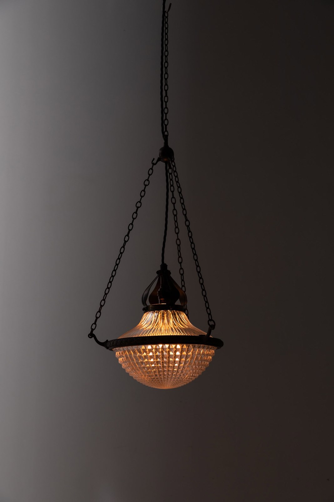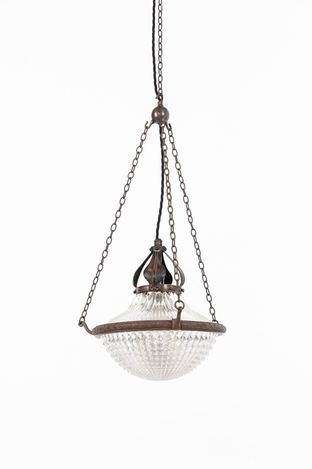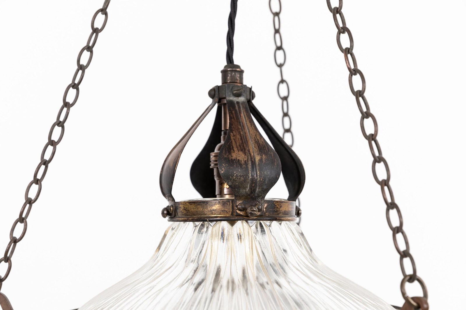 Featuring the lesser seen crystal bowl with top plate both bearing the Holophane stamp to the inside rims. Set in a cast brass decorative ring in its original finish and early arts & crafts style open gallery. Complete with hanger, chains and ceiling rose.