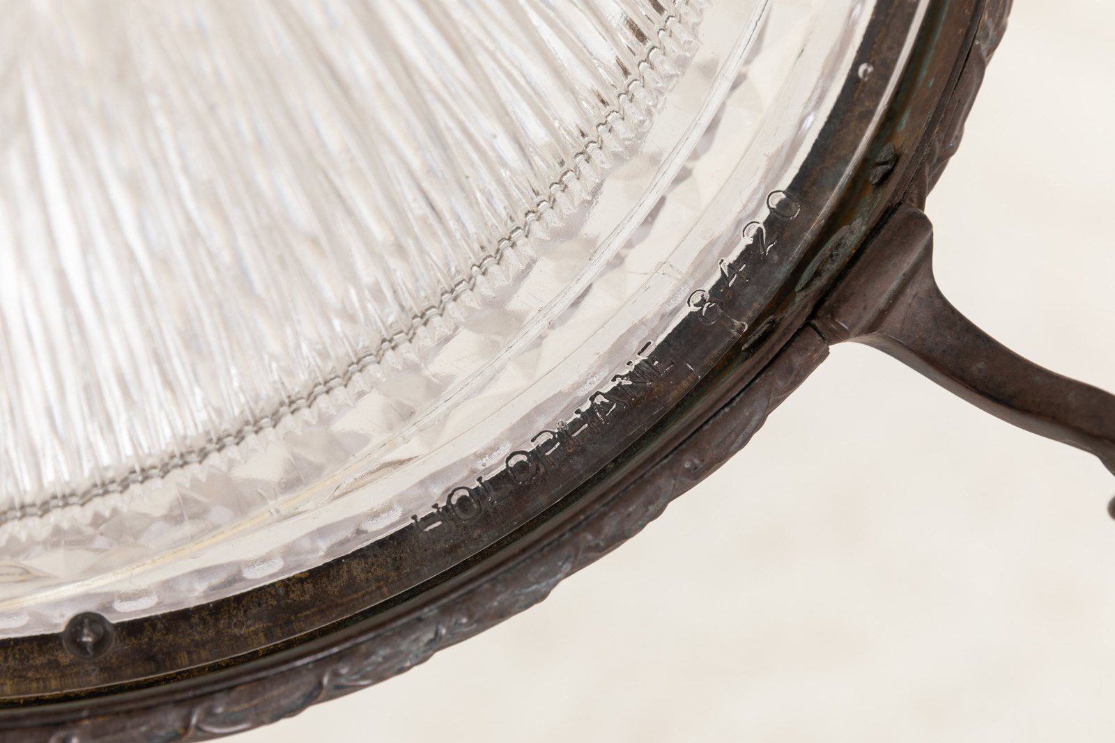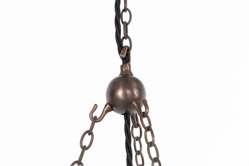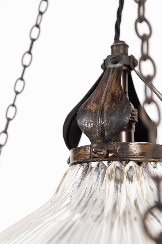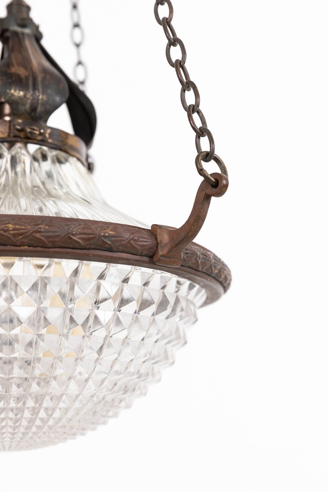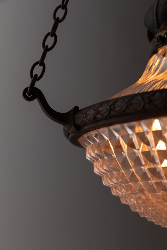 Featuring the lesser seen crystal bowl with top plate both bearing the Holophane stamp to the inside rims. Set in a cast brass decorative ring in its original finish and early arts & crafts style open gallery. Complete with hanger, chains and ceiling rose.