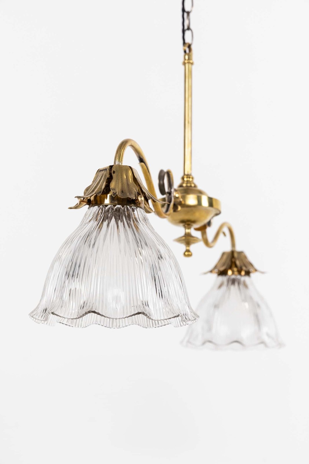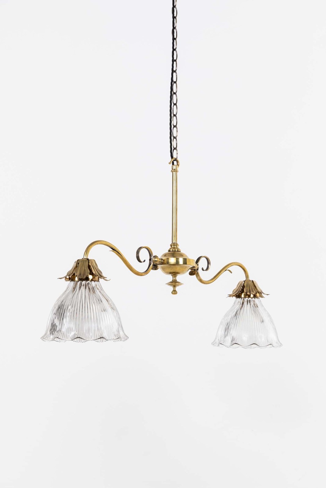 An elegantly formed two-branch brass ceiling light with prismatic glass shades. c.1910
