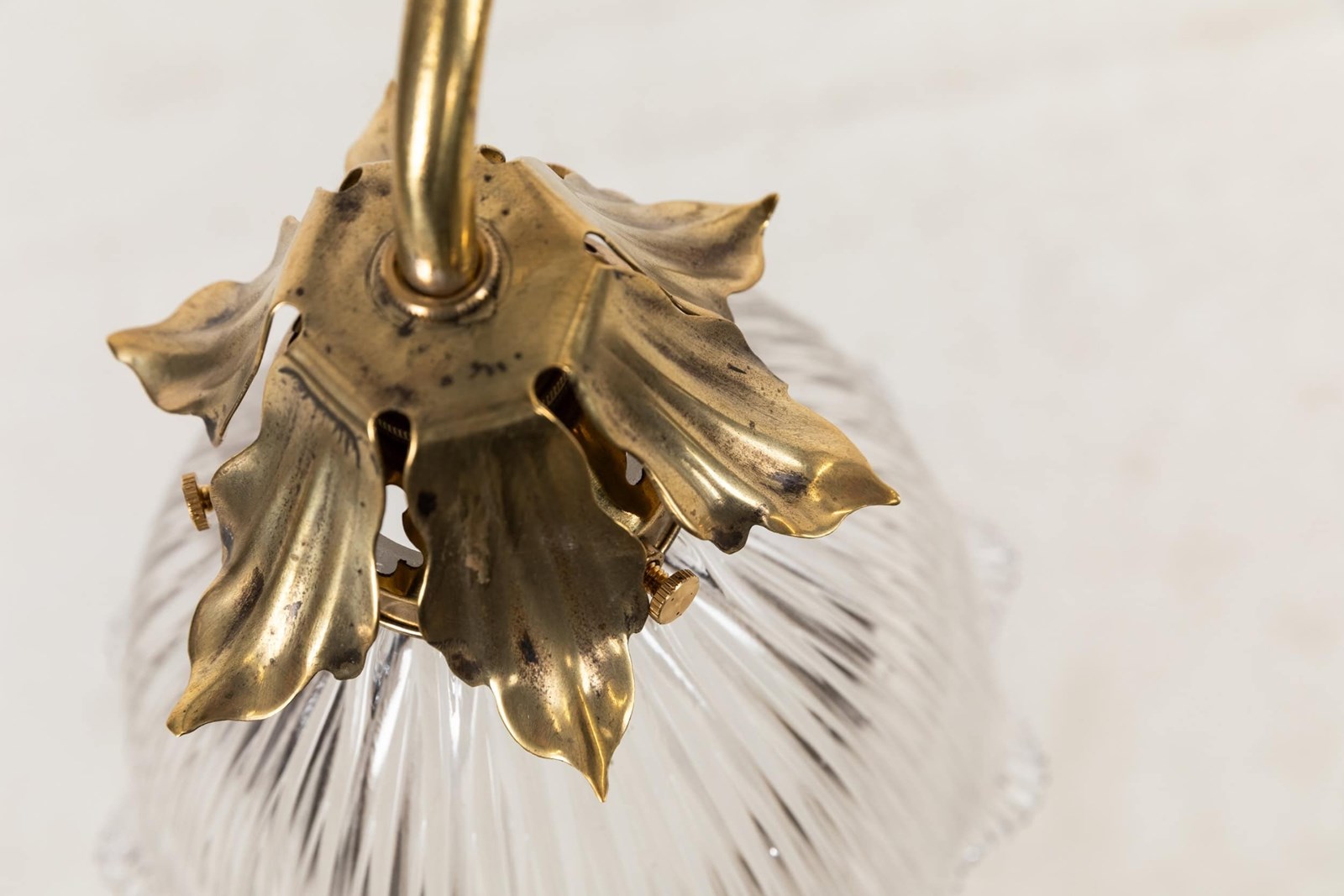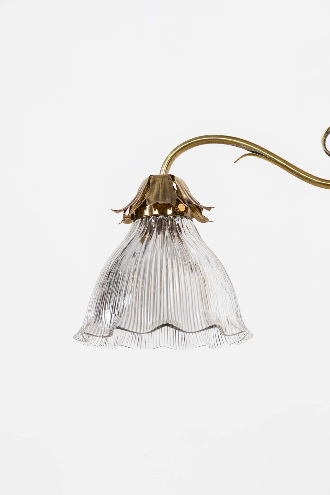 Made by Faraday & Son - stamped to the bottom finial - beautifully designed brass two-branch, former gas light, with matched pair of Holophane glass shades. The shades stamped to the rim.