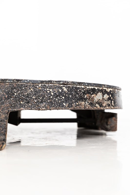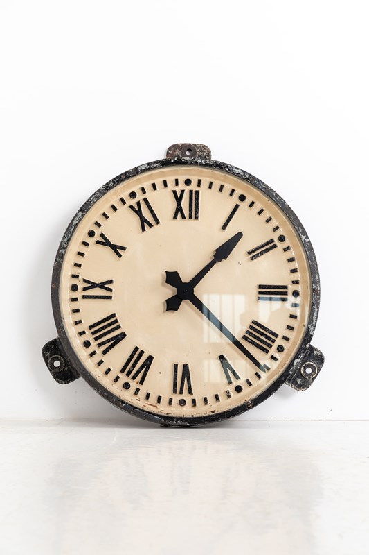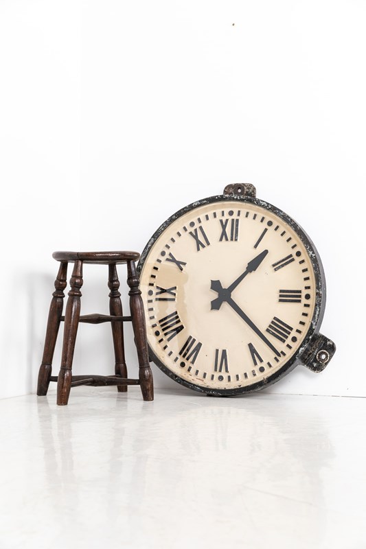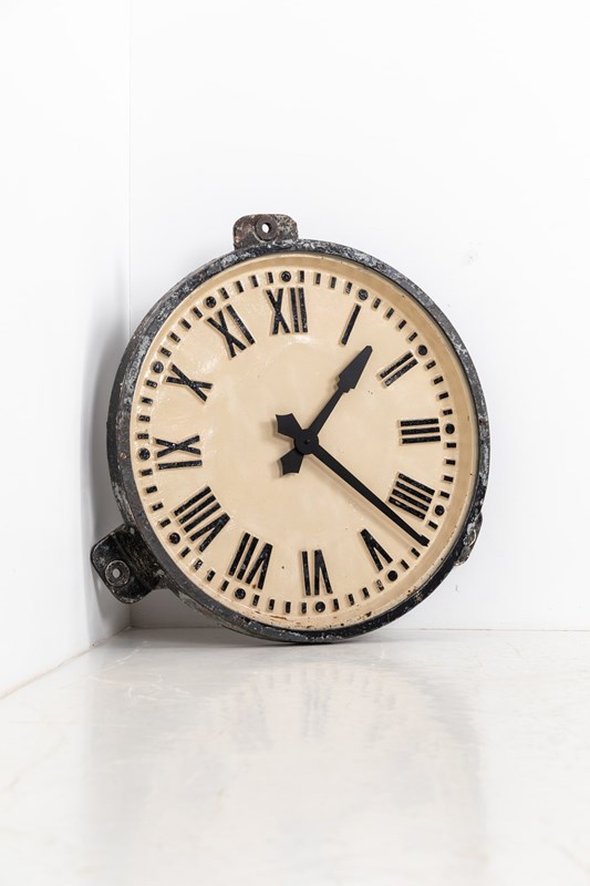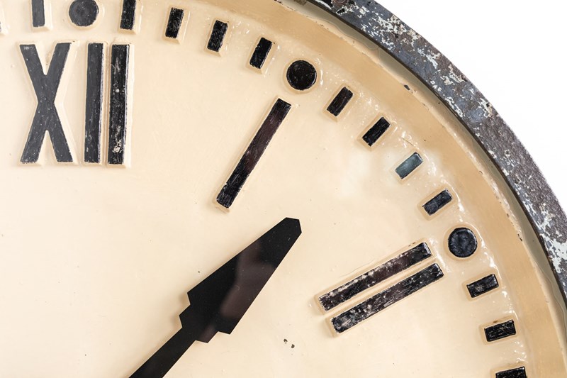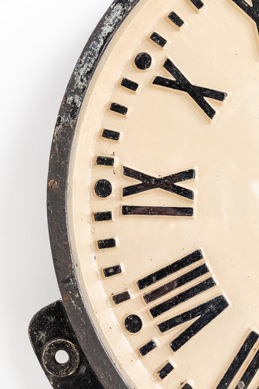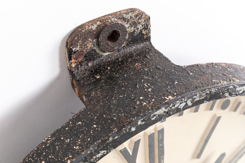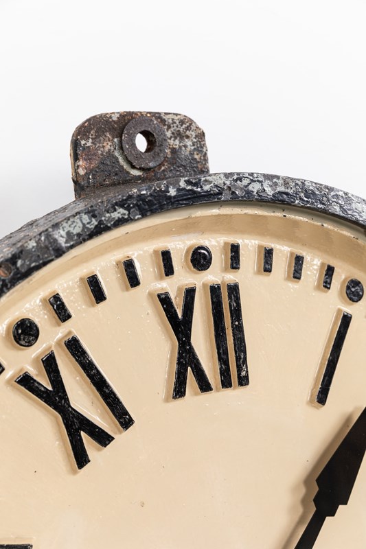 In wonderful time-worn condition, imposing single piece cast iron clock with raised numerals. The large arrowed hands running on a high torque Quartz movement for modern convenience.