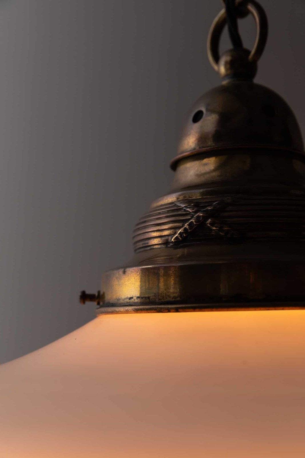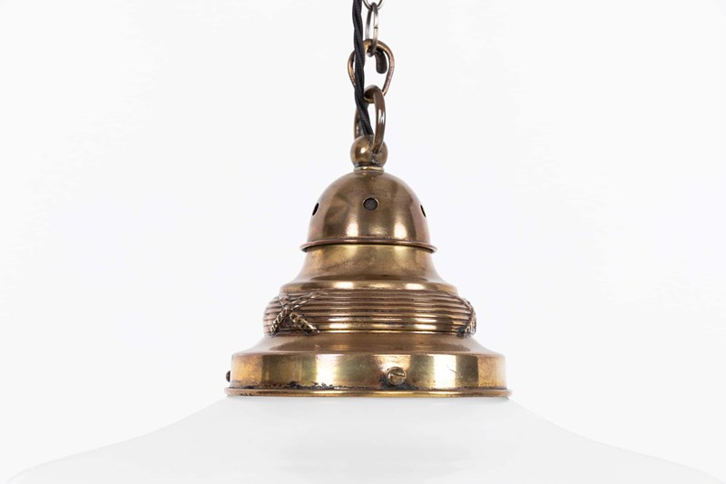 A huge opaline glass pendant light with brass gallery made by GEC. c.1920