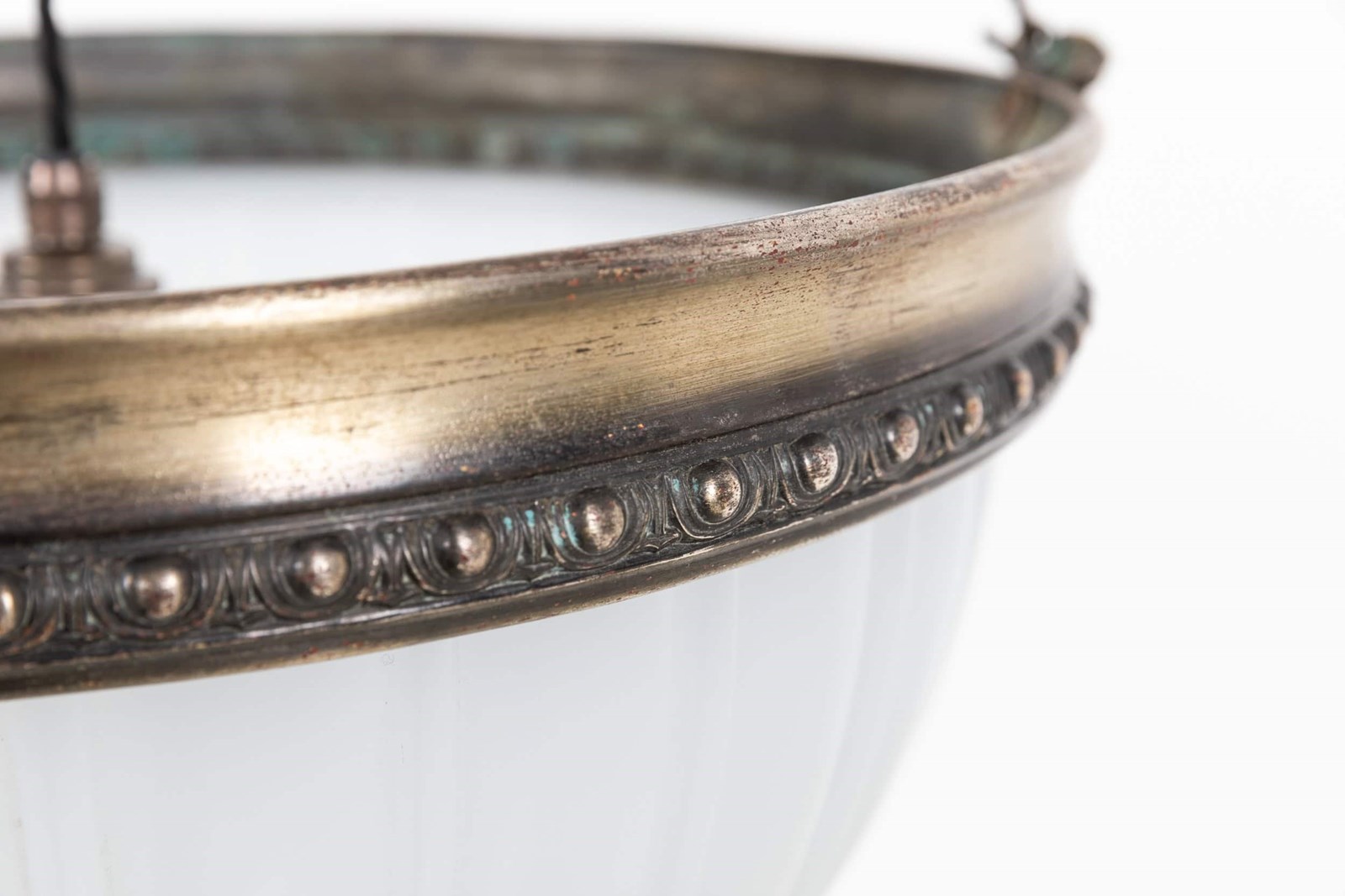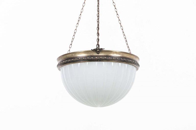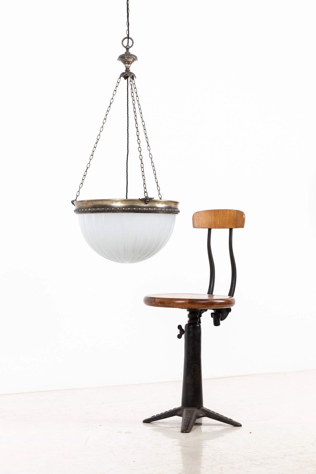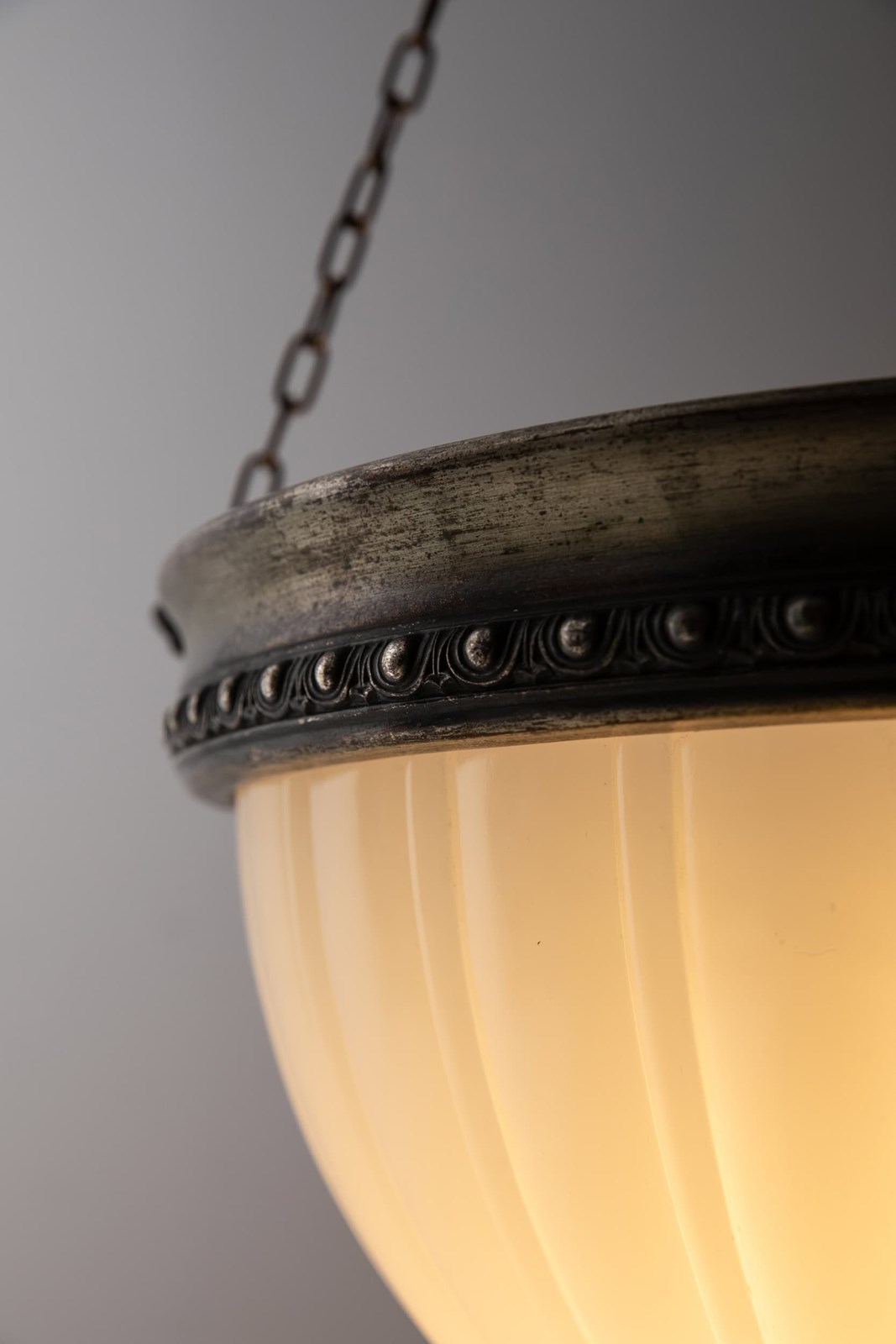 Heavy duty pressed milk glass with a fluted design, supported by a beautiful brass ring and hanger, both in their original silver plated finish which has dulled to a create wonderful patina. Chains can be shortened to suit ceiling height.