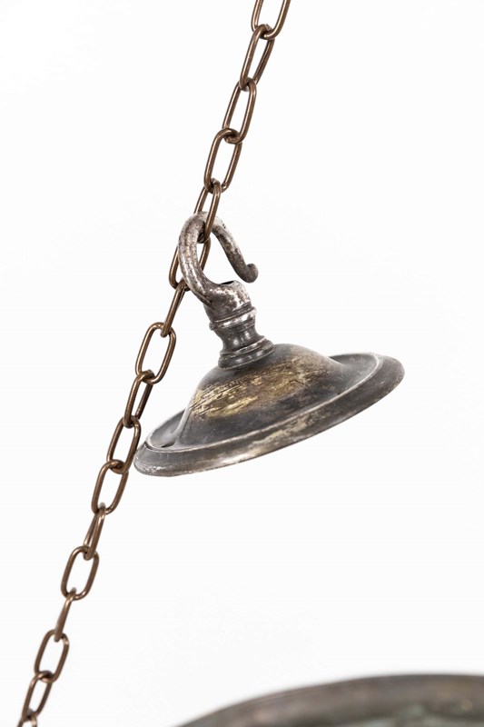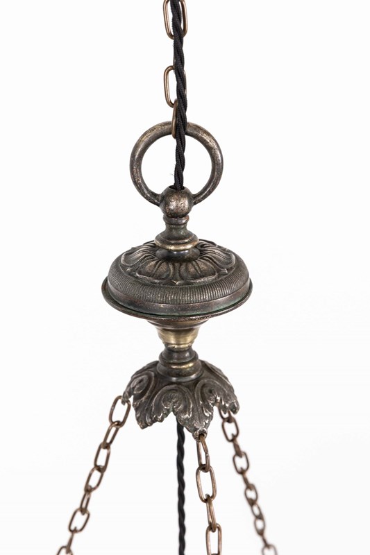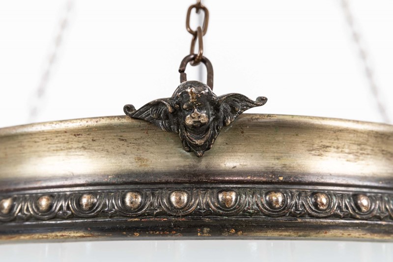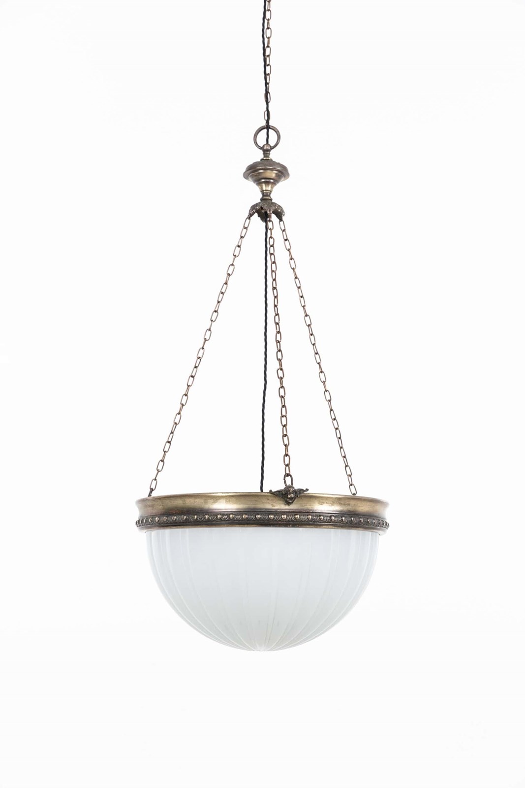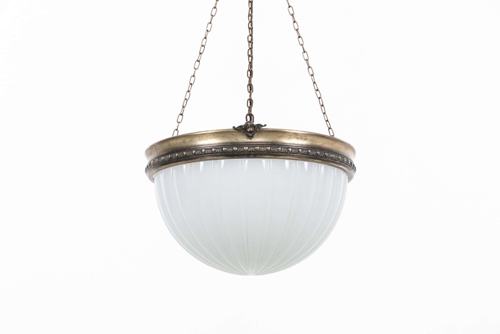 Heavy duty pressed milk glass with a fluted design, supported by a beautiful brass ring and hanger, both in their original silver plated finish which has dulled to a create wonderful patina. Chains can be shortened to suit ceiling height.