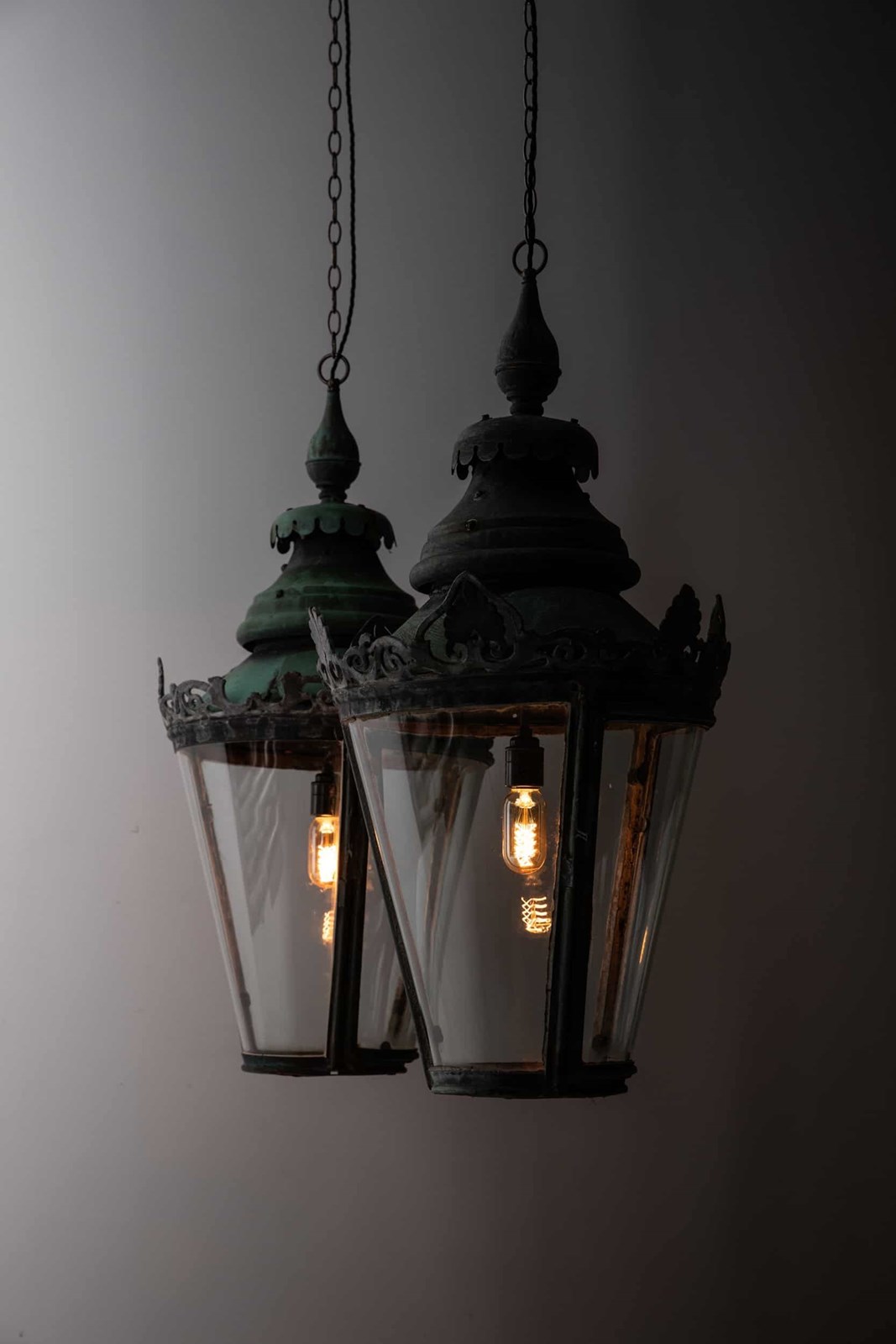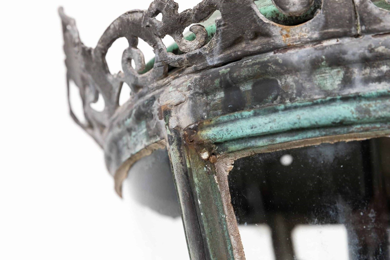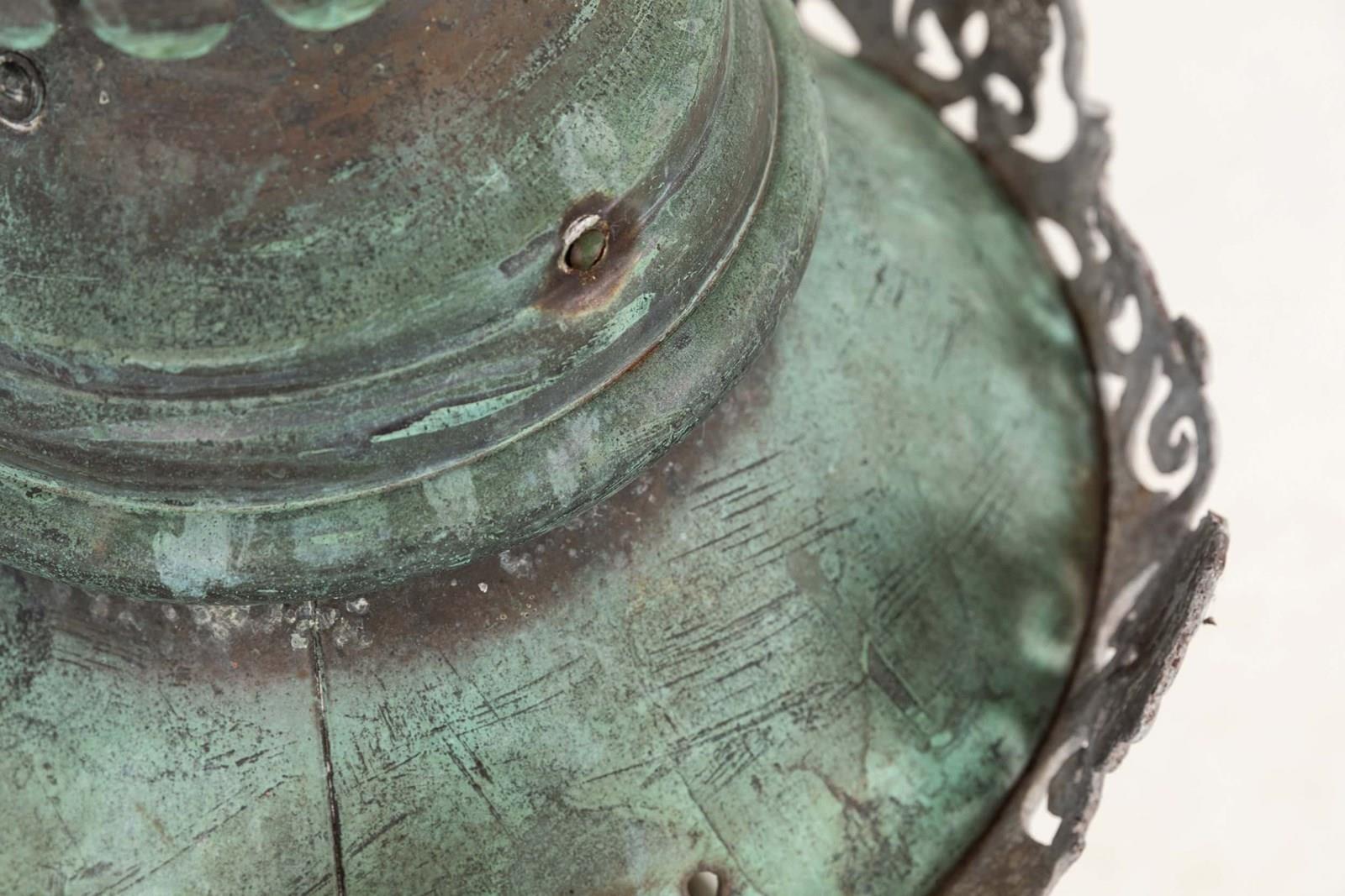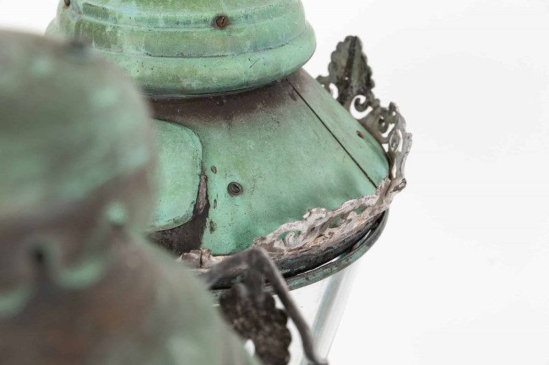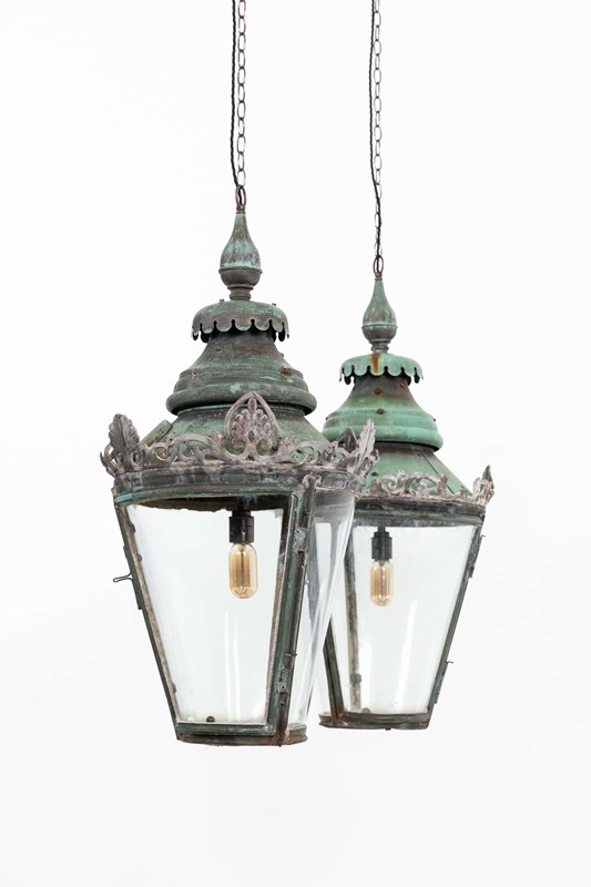 A pair of beautifully formed glazed copper lanterns with natural verdigris. c.1890