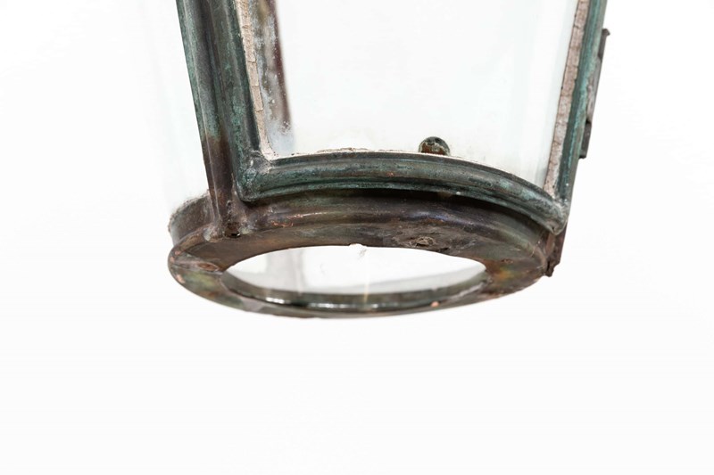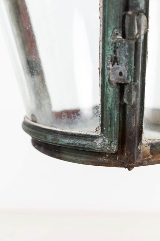 Finely constructed conical lanterns, presented in as found condition. The copper has developed a rich, natural patina through decades of oxidisation. Curved glazing remains intact. A small hatch to the top of each lantern harks back to a time when lamplighters would have walked the streets to manually illuminate each lantern as evening fell. Price is per light.
