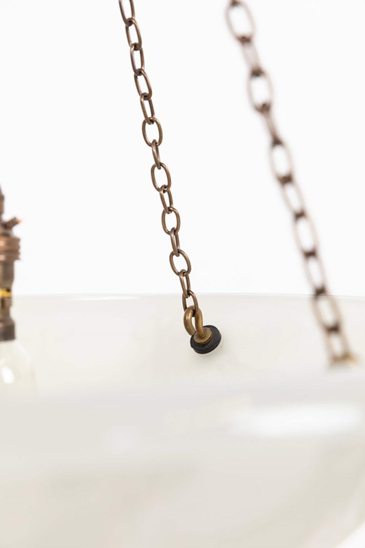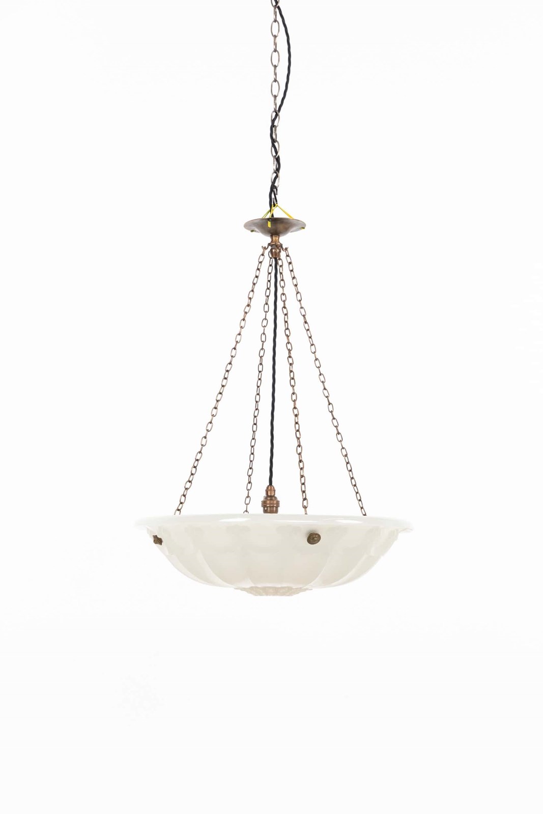 Dating to the late 19th/early 20th century, produced to the same thickness and quality as the more commonly seen 'Moonstone' glass shades. Fluted design with swag decoration. Suspended from four chains terminating to brass ceiling plates. Each bowl is stamped to the inside - Ripley Alabaster. Price is per light.