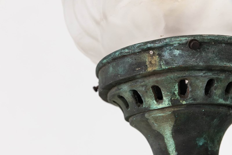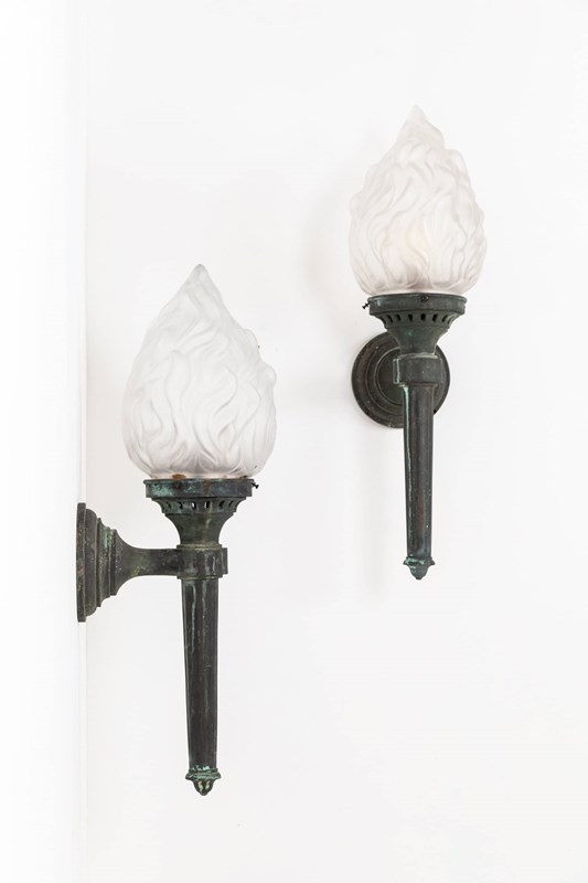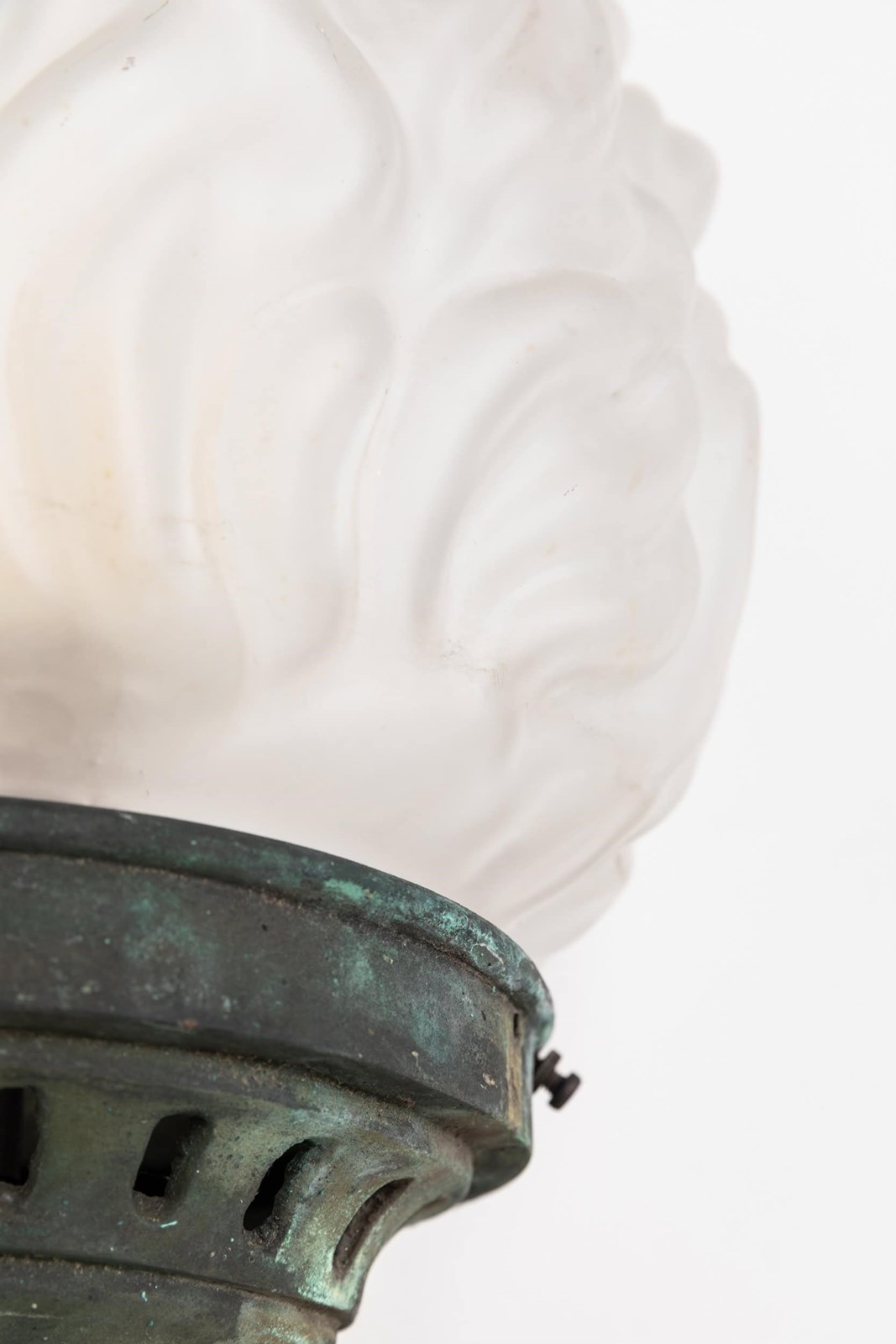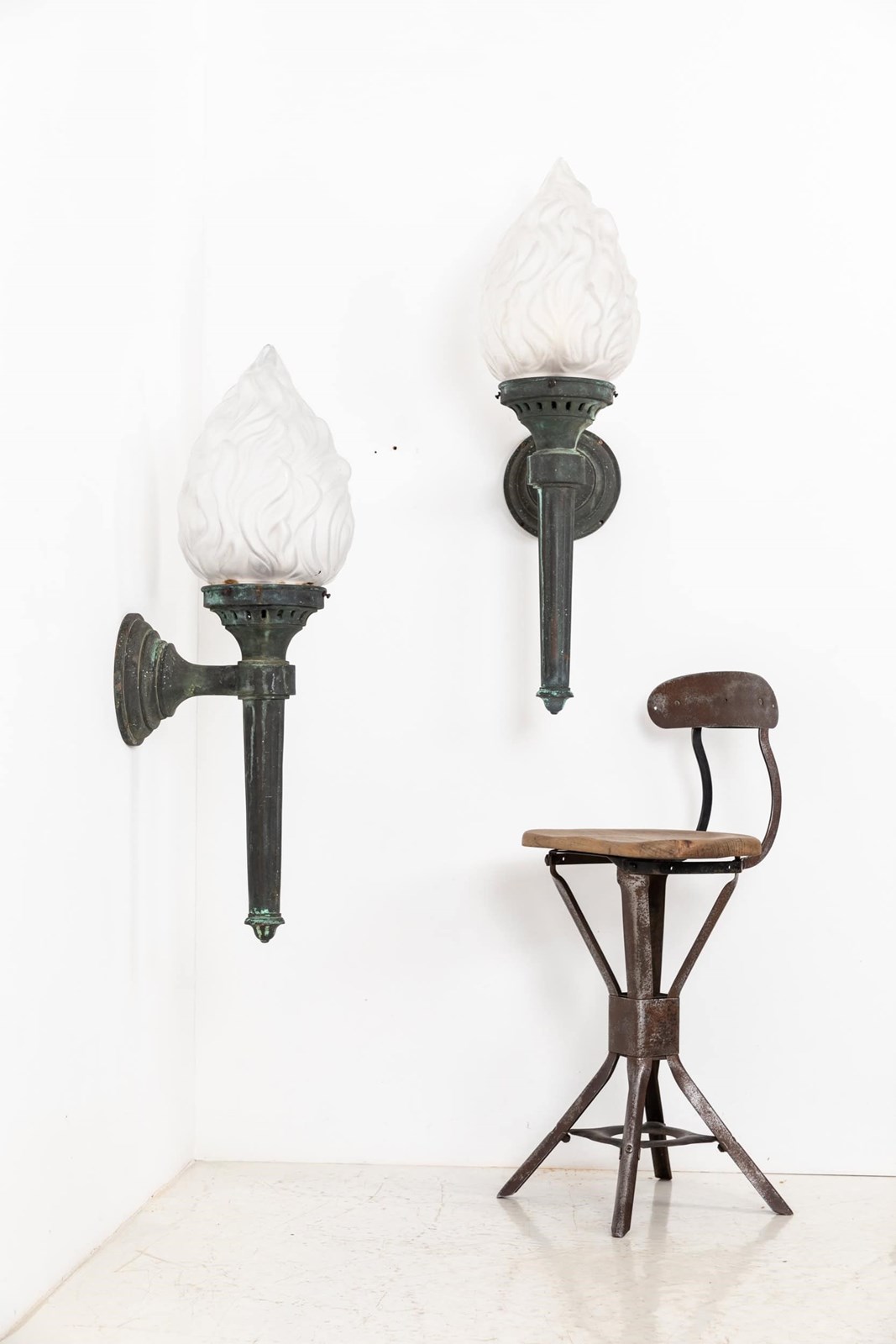 Exceptional pair of antique cast bronze torch lights with original glass flame shades, c.1900