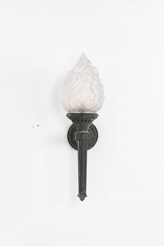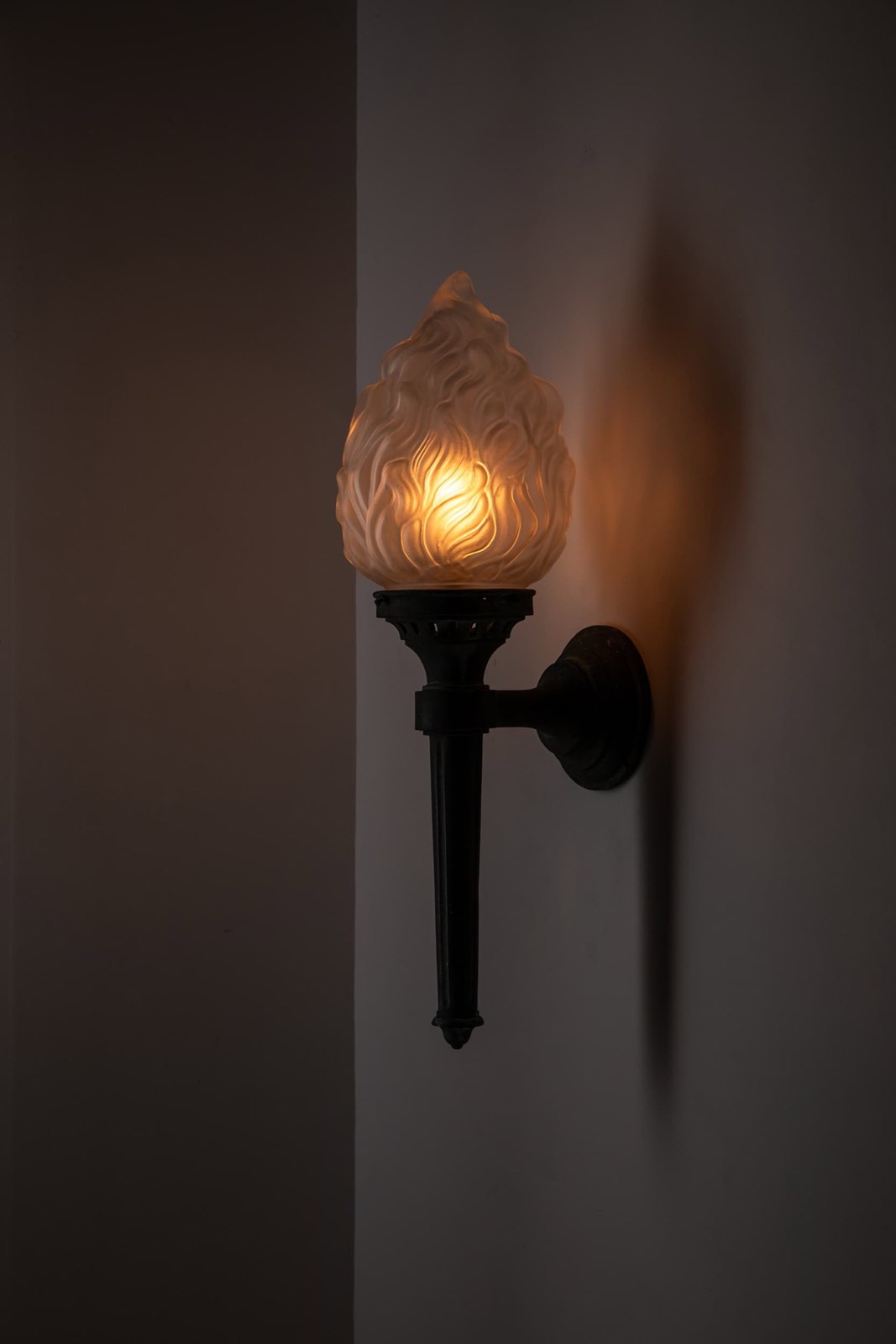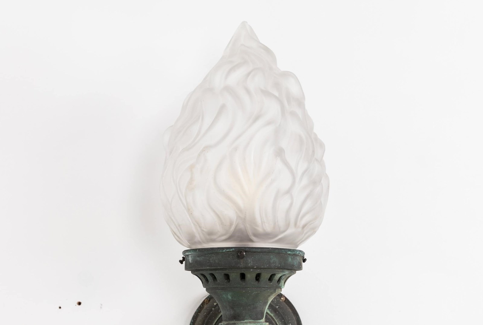 Each light retains its original glass flame-shaped shade, designed to mimic the look of a flickering flame and sitting perfectly atop the bronze torch form. The quality of the casting is excellent, with a solid weight and finely worked detail throughout.
