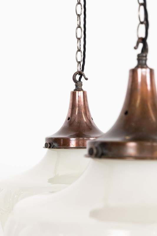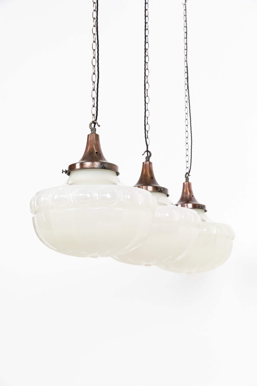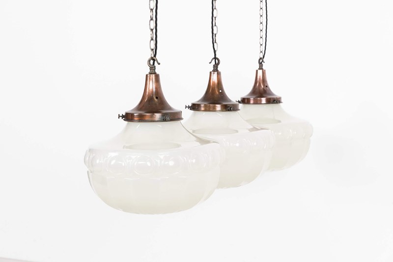 An incredible trio of 16" moulded glass pendant lights made in England. c.1910