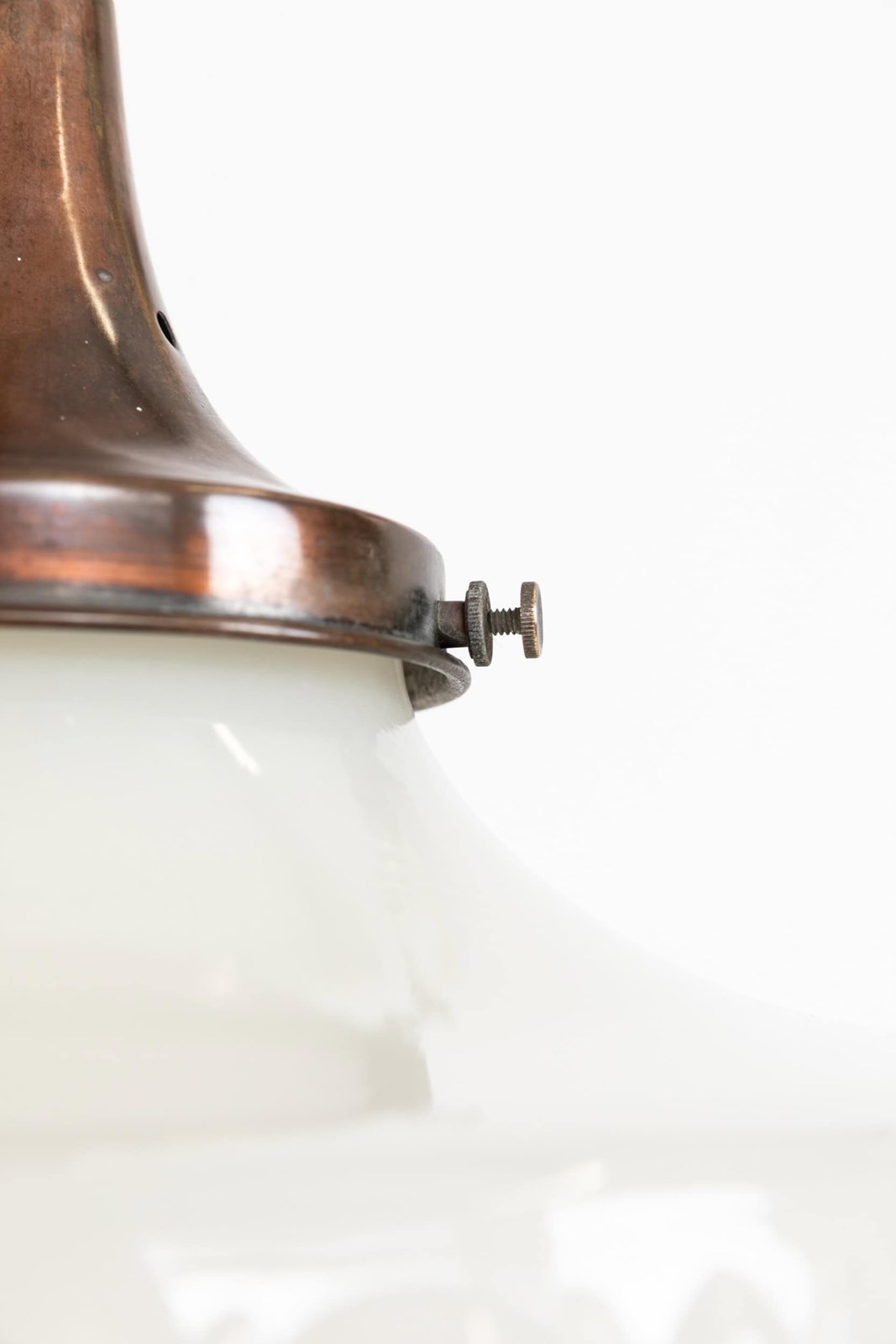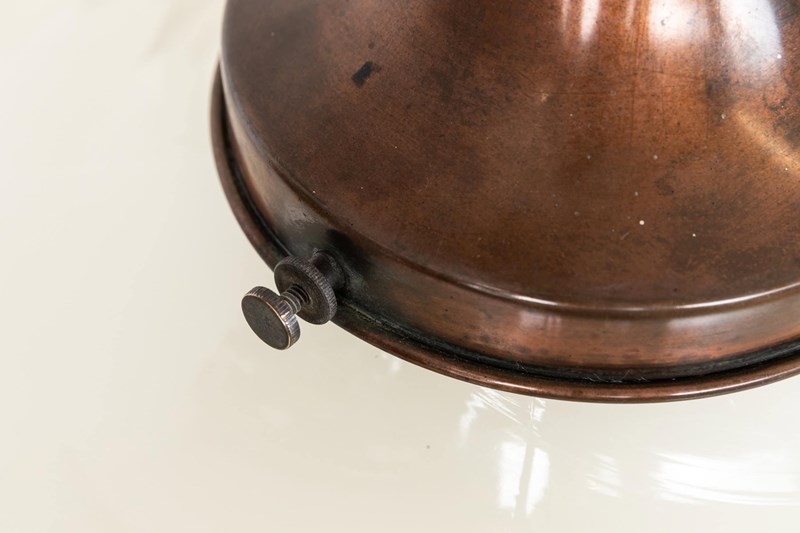 Dating to the early 20th century, this substantial pressed glass shade is of impressive scale, crafted from thick, heavy glass and retaining its original copper gallery. Price is per light.