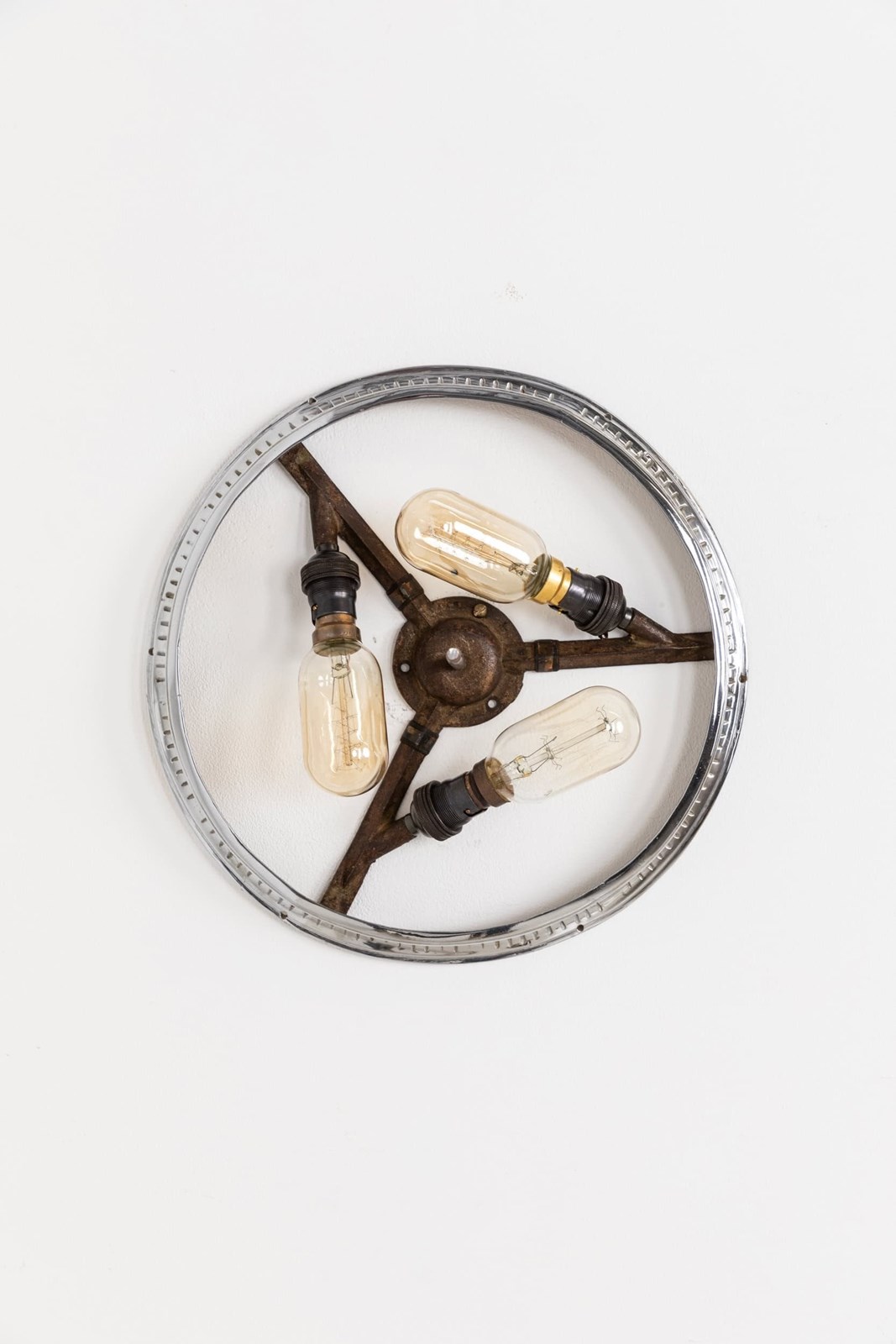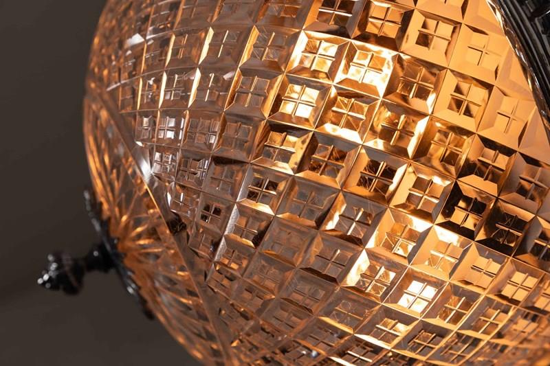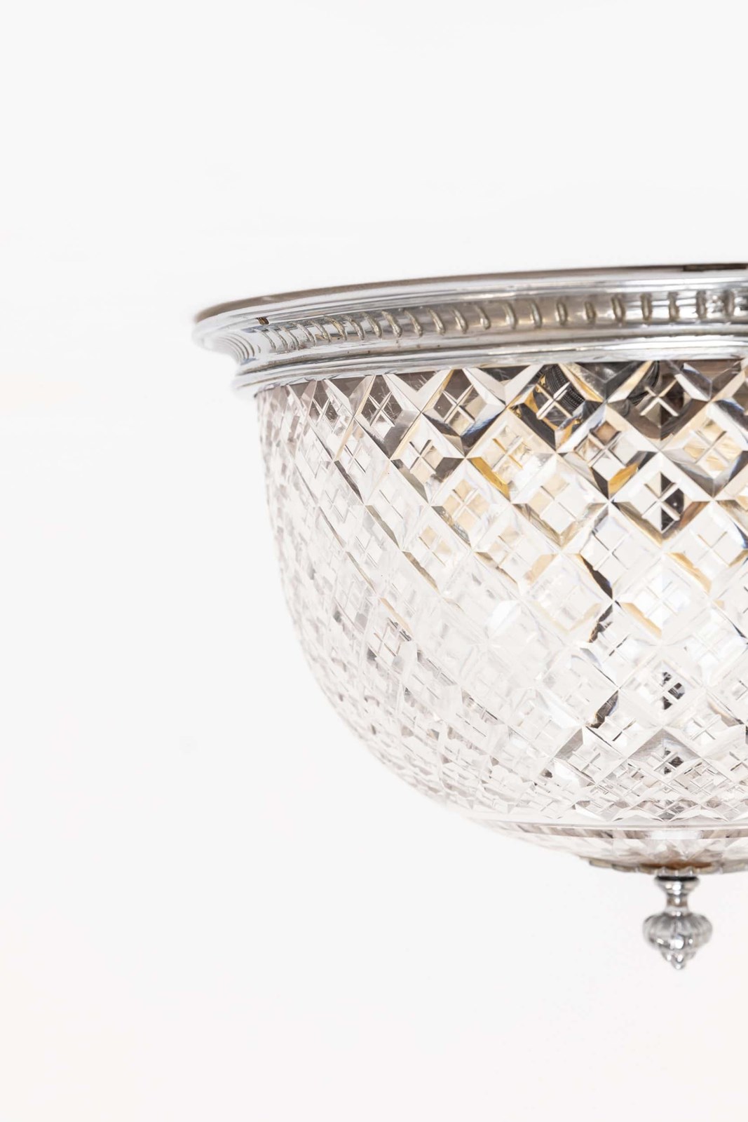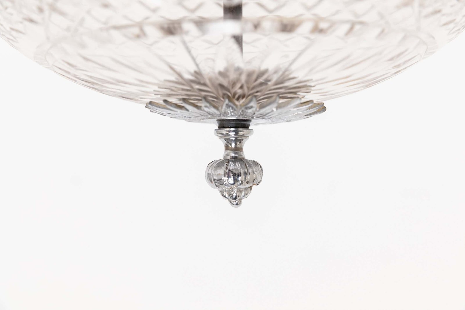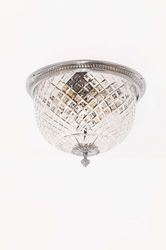 The hand‑cut glass shade is the work of a true master-craftsman and follows a classic, elegant form and set in its original chrome plated cast brass flush mounted ring, secured in place with a finial.