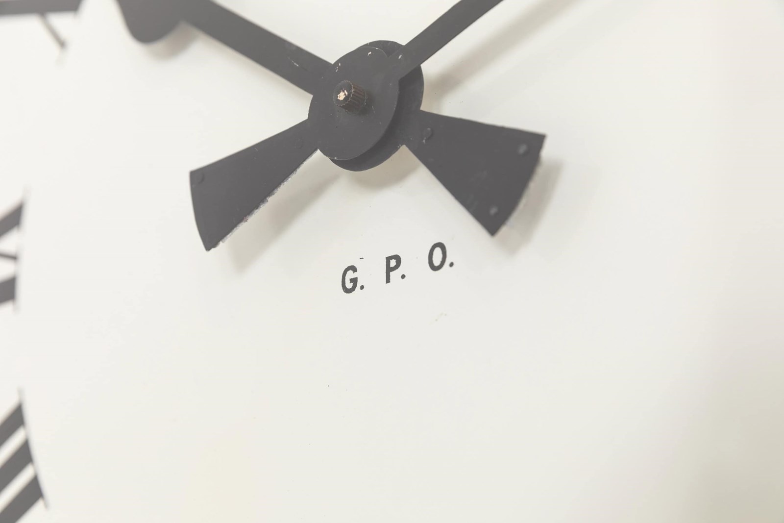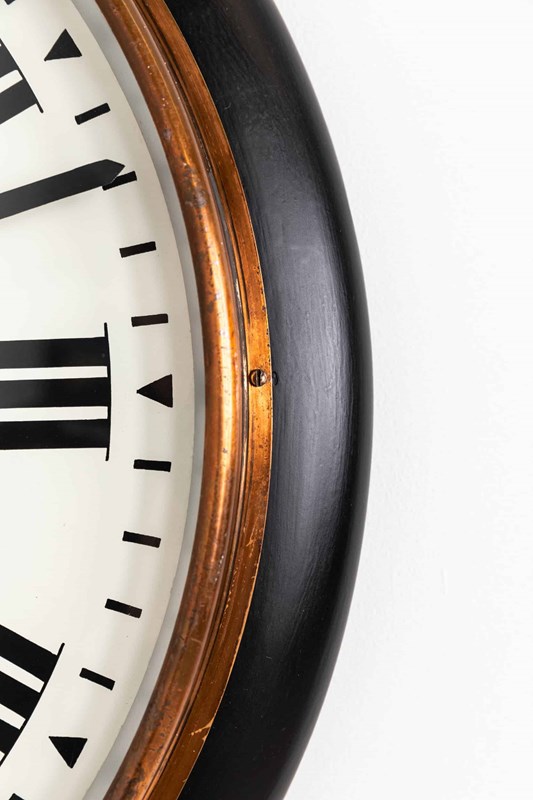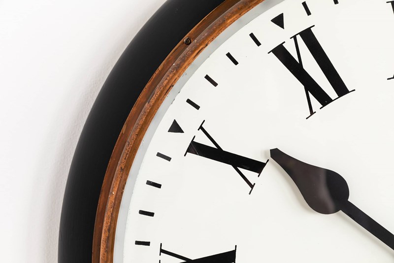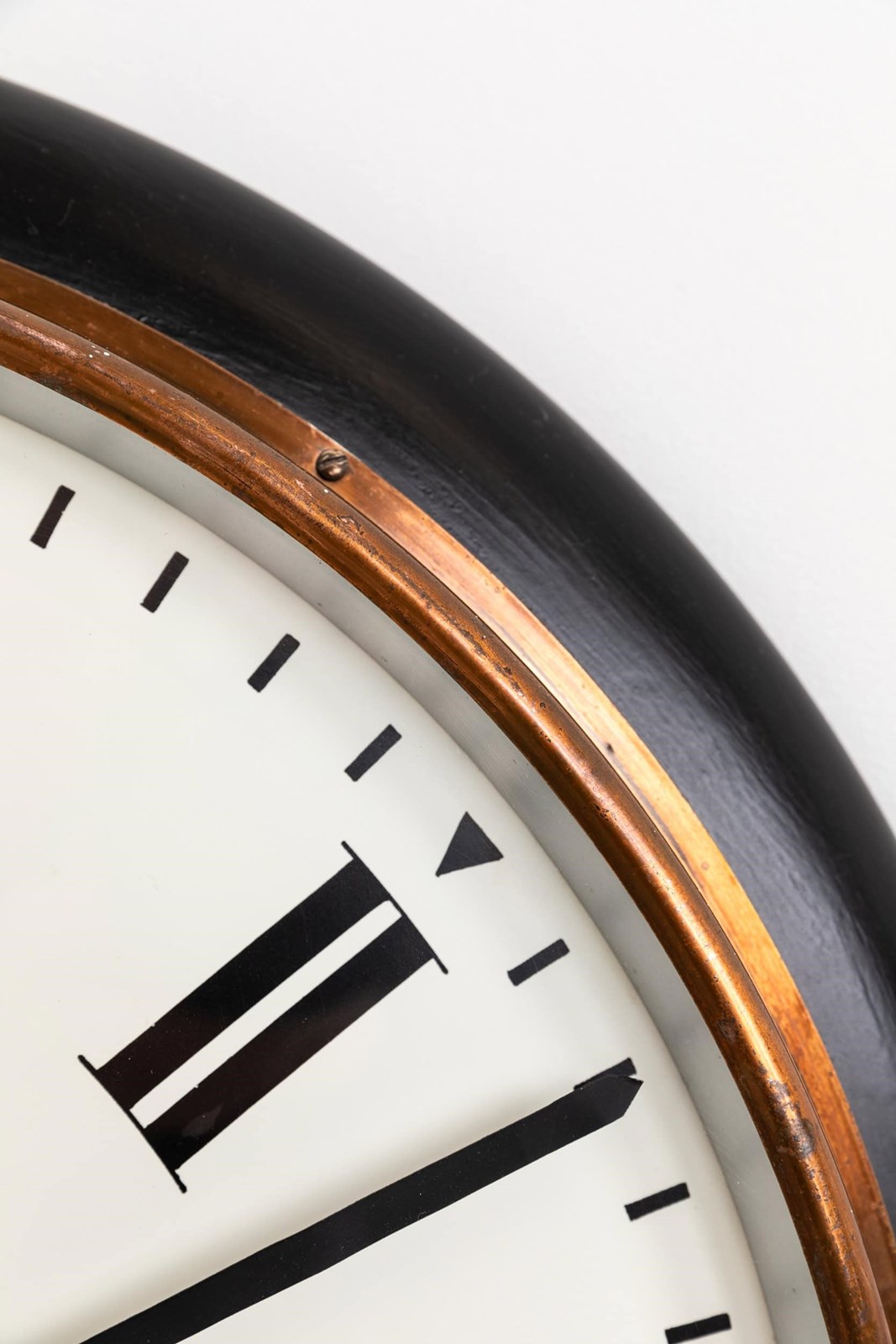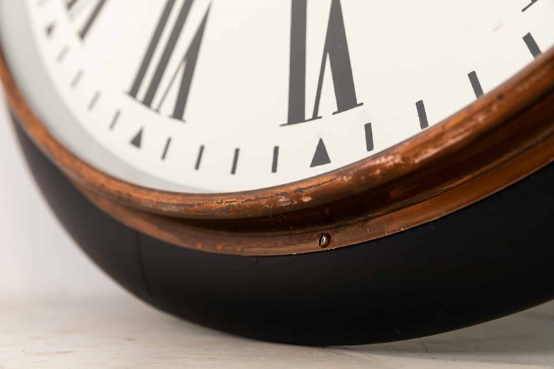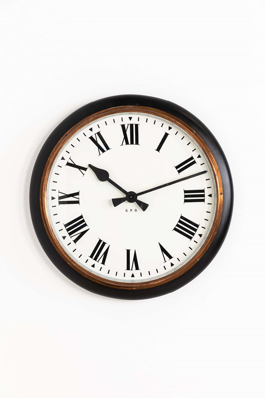 Originally designed for the GPO - General Post Office. Hardwood frame, in an attractive black finish, contrasting beautifully with the raised copper bezel. The 18" dial is bright and clean with the original hands converted to run on a high torque Quartz movement for modern convenience.