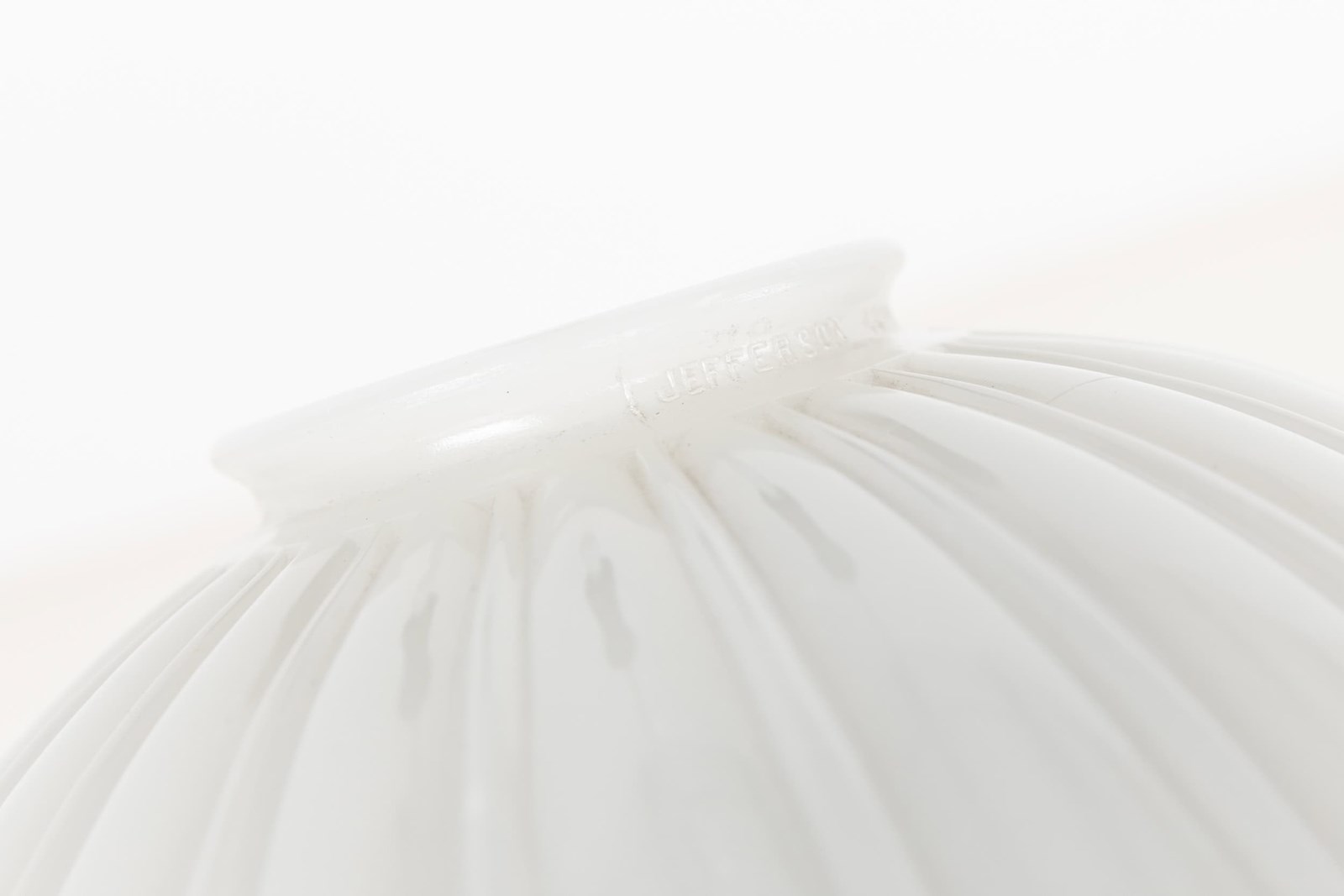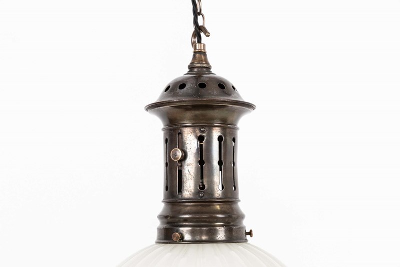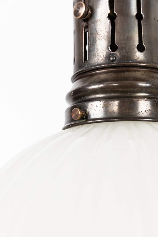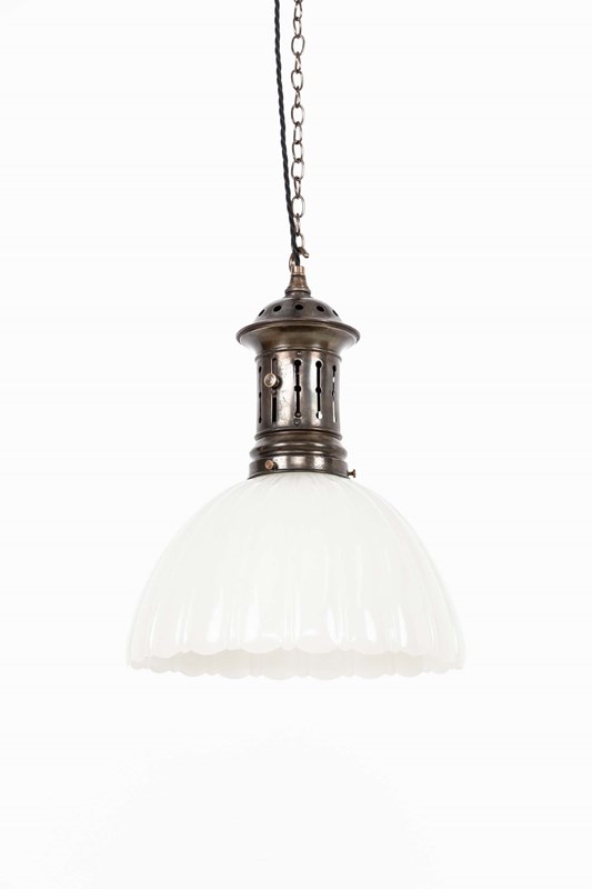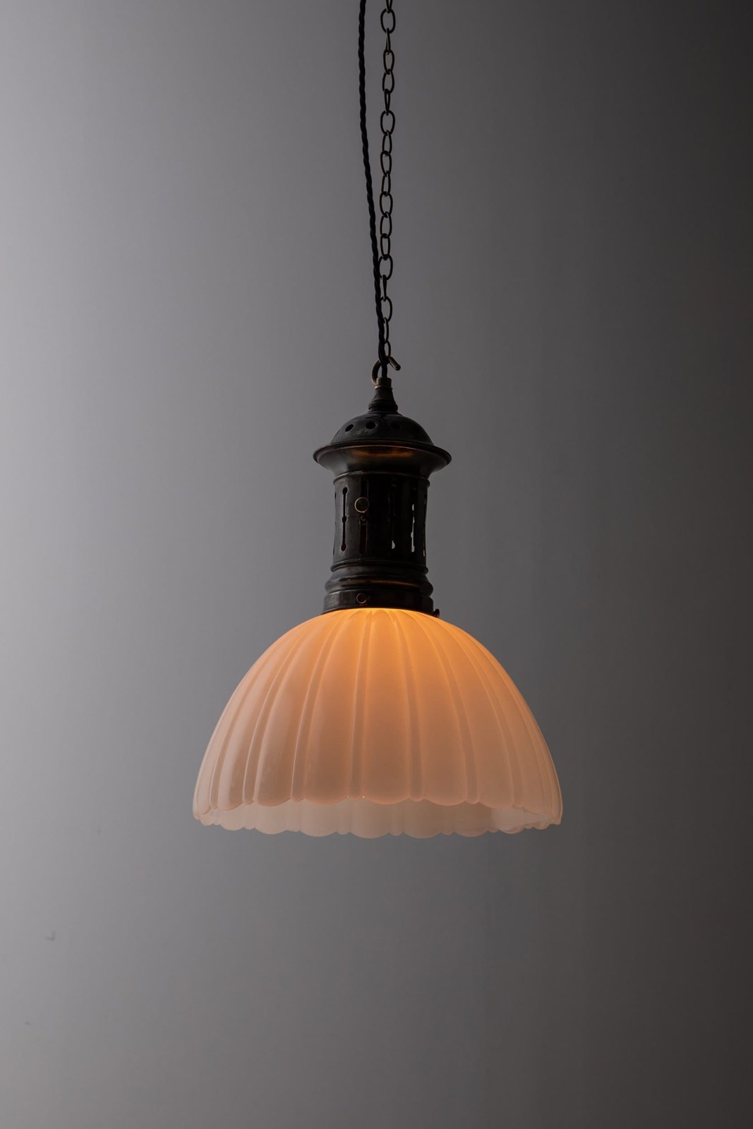 This desirable pendant light features thick pressed moonstone glass in a fluted design, known for its soft, diffused glow and distinctive early 20th-century character. It retains its original elongated faux-bronze brass gallery.