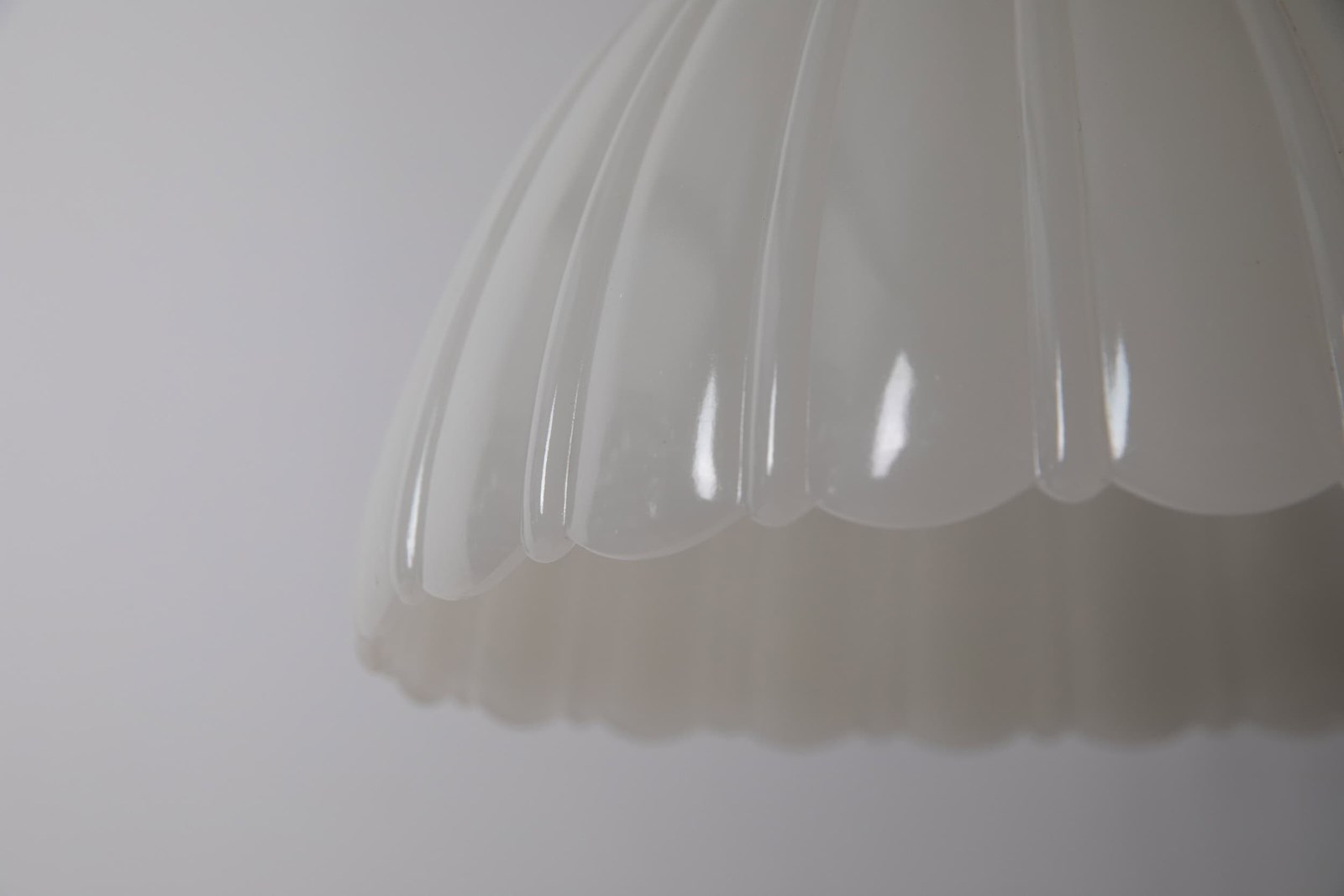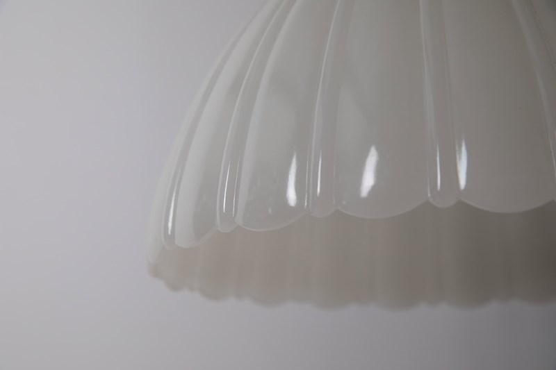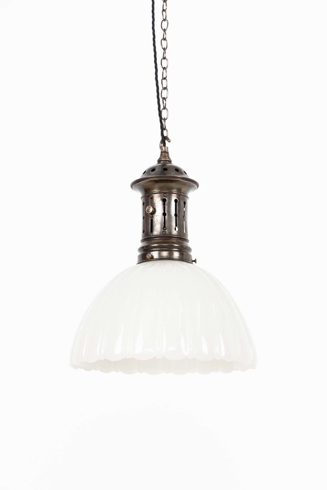 This desirable pendant light features thick pressed moonstone glass in a fluted design, known for its soft, diffused glow and distinctive early 20th-century character. It retains its original elongated faux-bronze brass gallery.