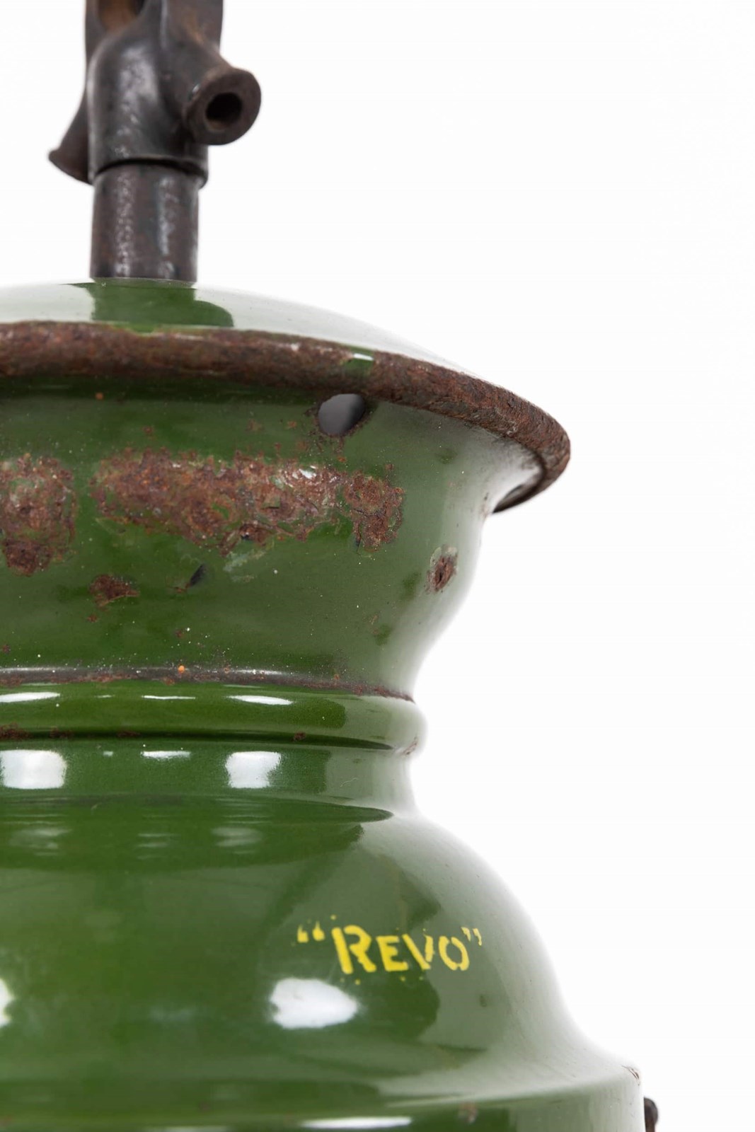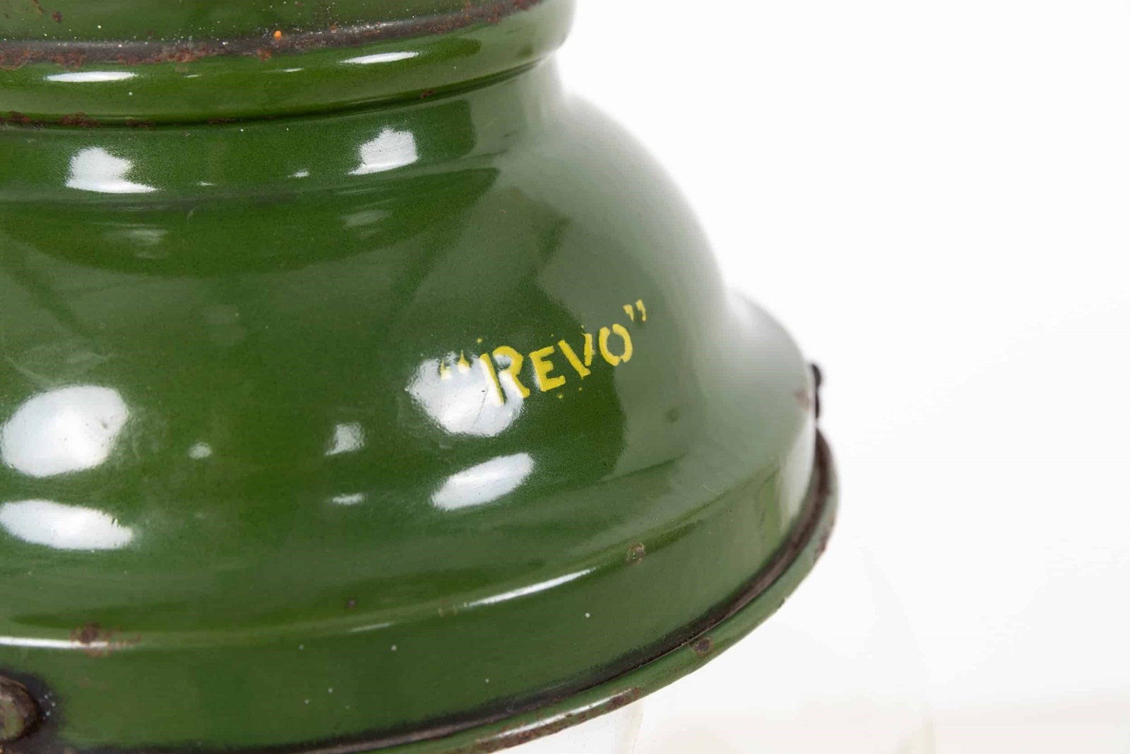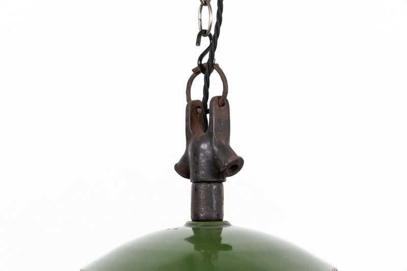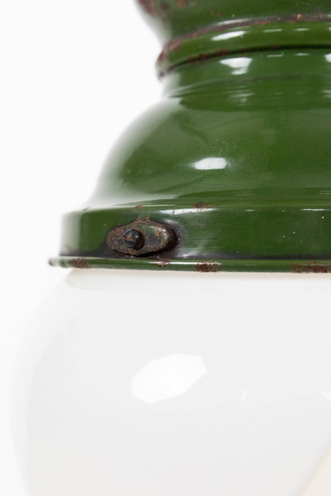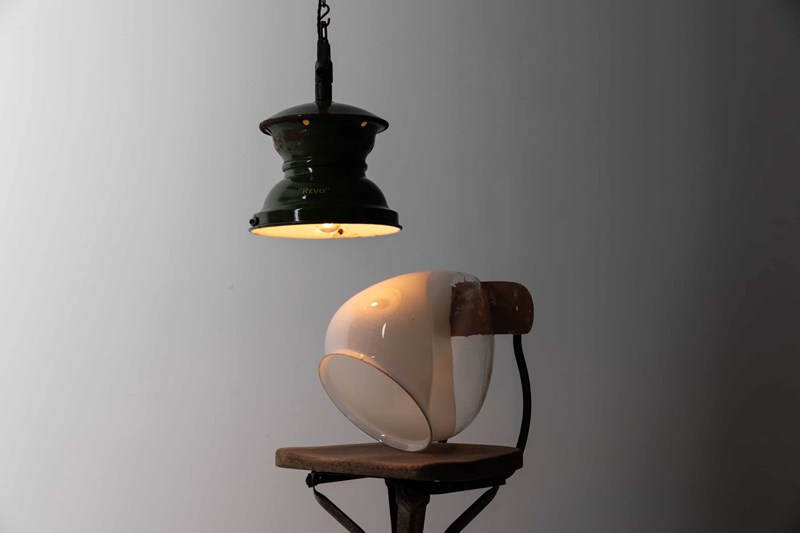 Two-tone blown and rolled glass shade - designed to illuminate a subject, whilst diffusing the bulb from the eye. Large green vitreous enamel gallery with makers mark.