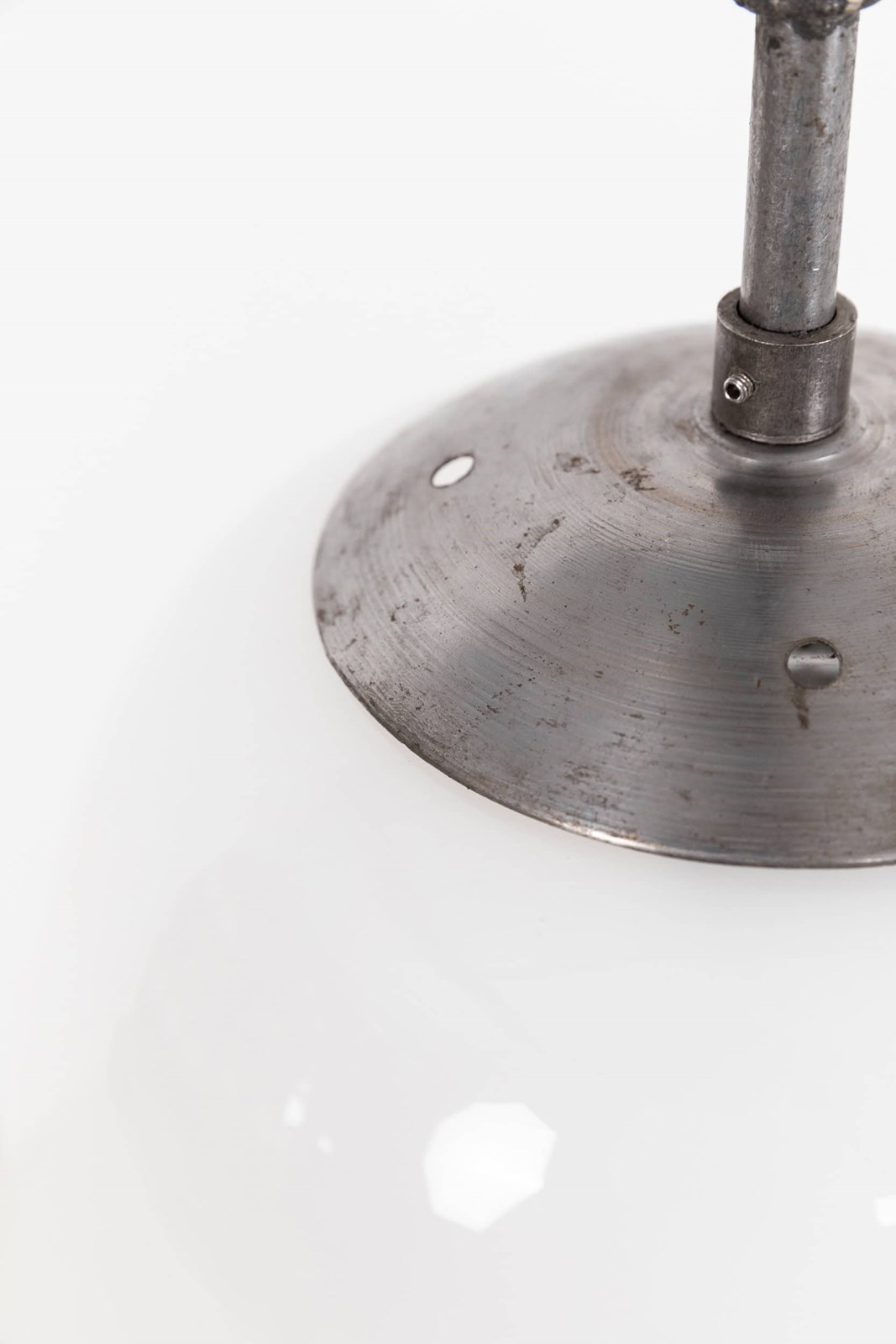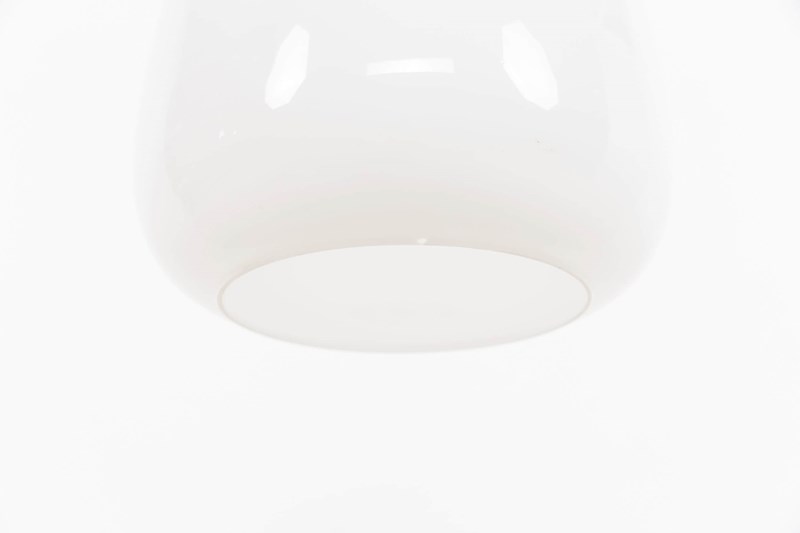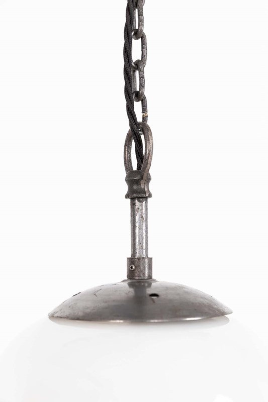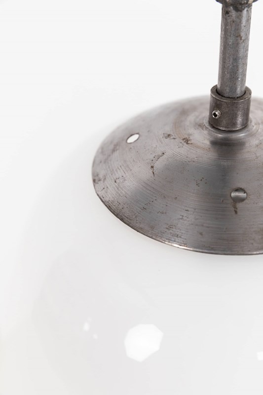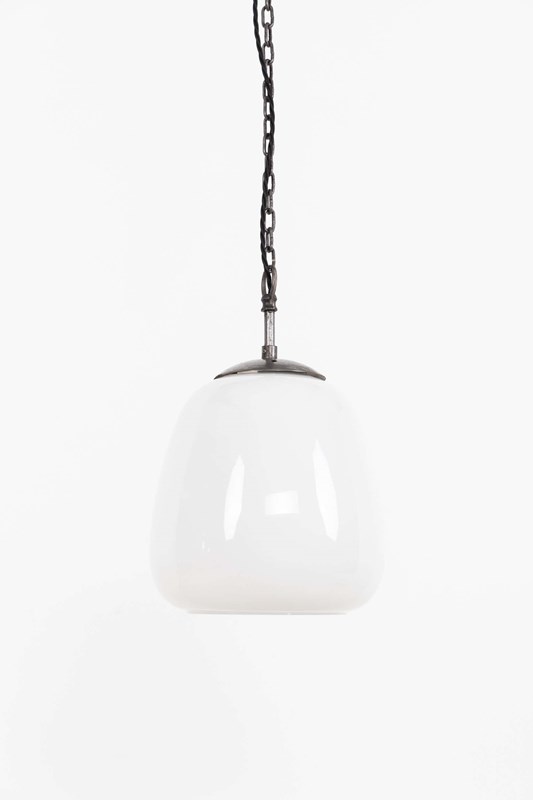 Hand blown and rolled opaque opened bottom glass shade with original chrome-plated brass monks cap gallery. 52cm length of chain and ceiling hook included.