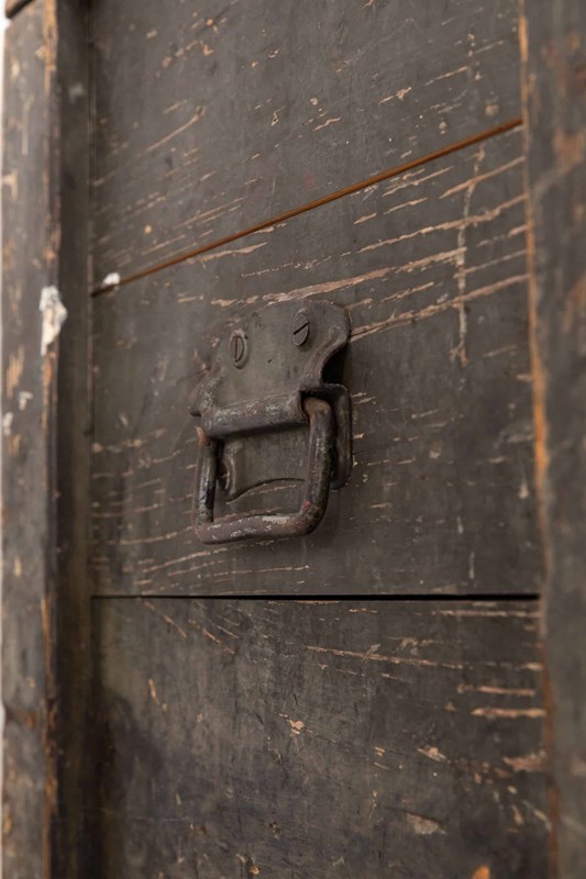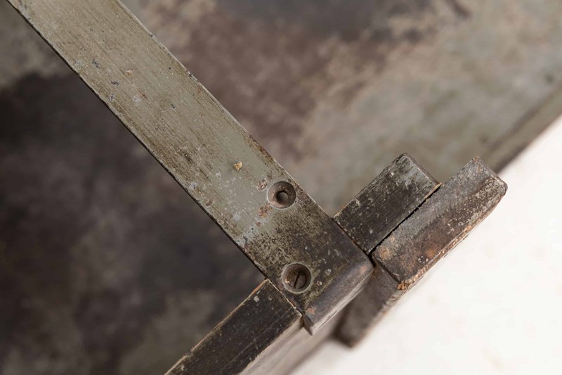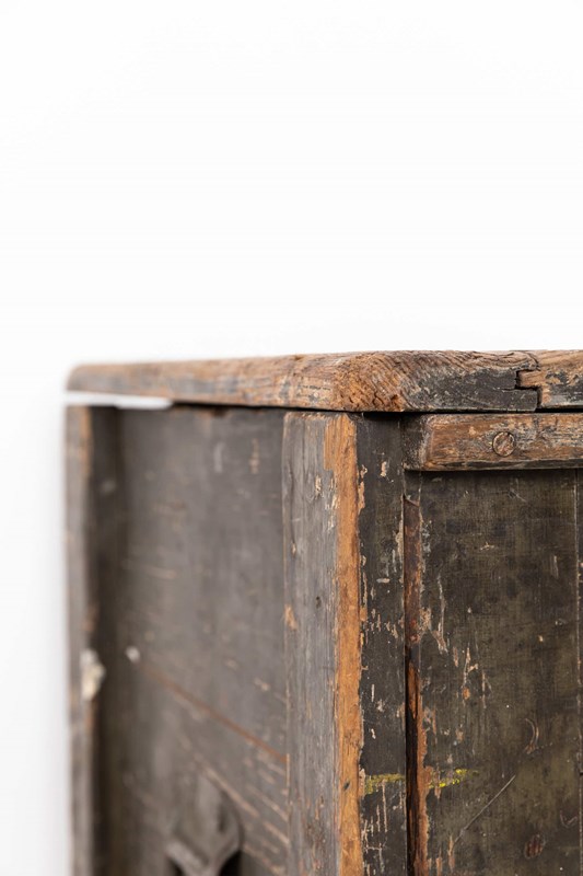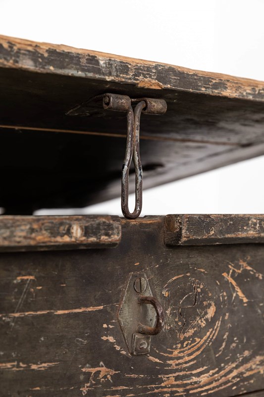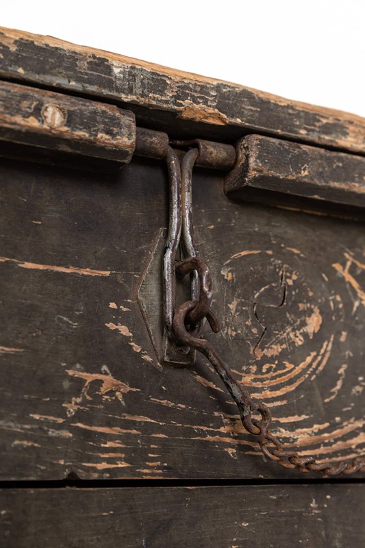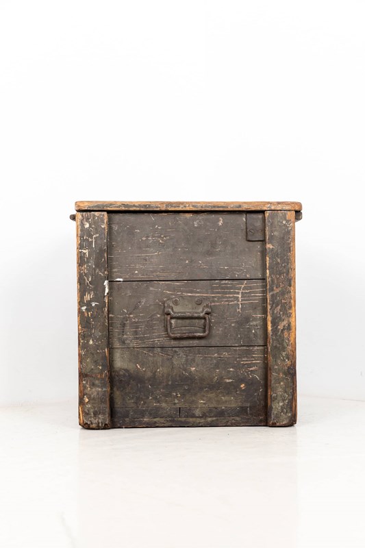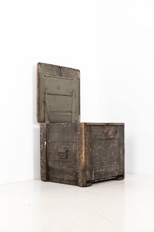 Clearly designed and made for a single purpose, although we're stumped as to what that is! The wood has picked up a beautiful patina over its lifetime, with the interior lined in steel. Top opens as well as front flap secured by a nice little chain detail.