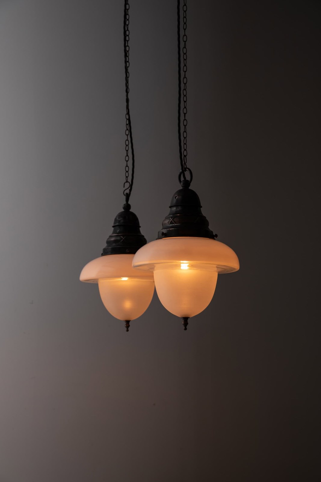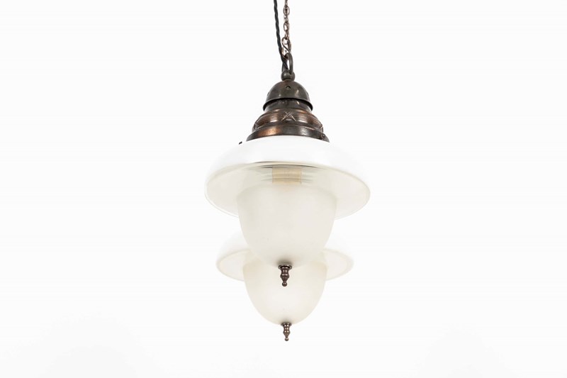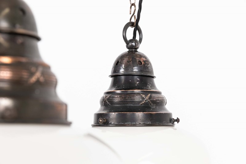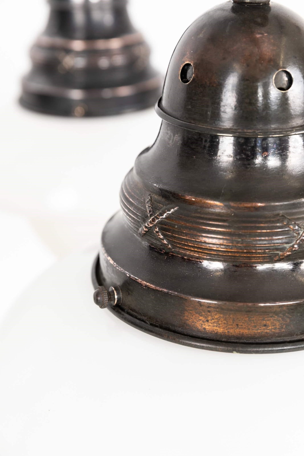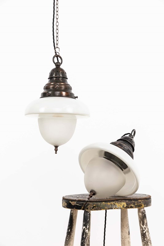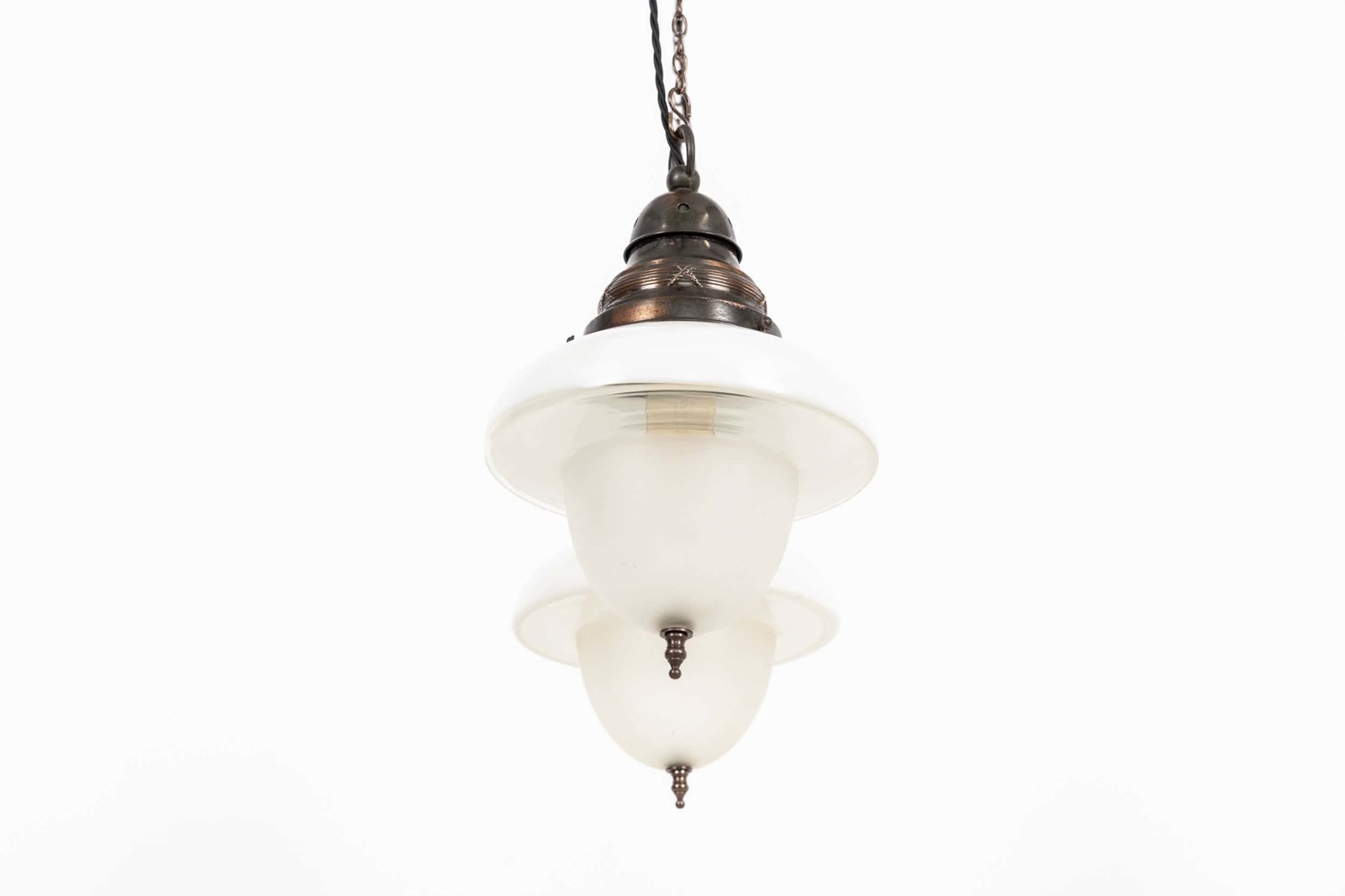 Each light features a frosted bowl beneath clear and opaline glass sections, both topped with their original period copper galleries. Price is for the pair.