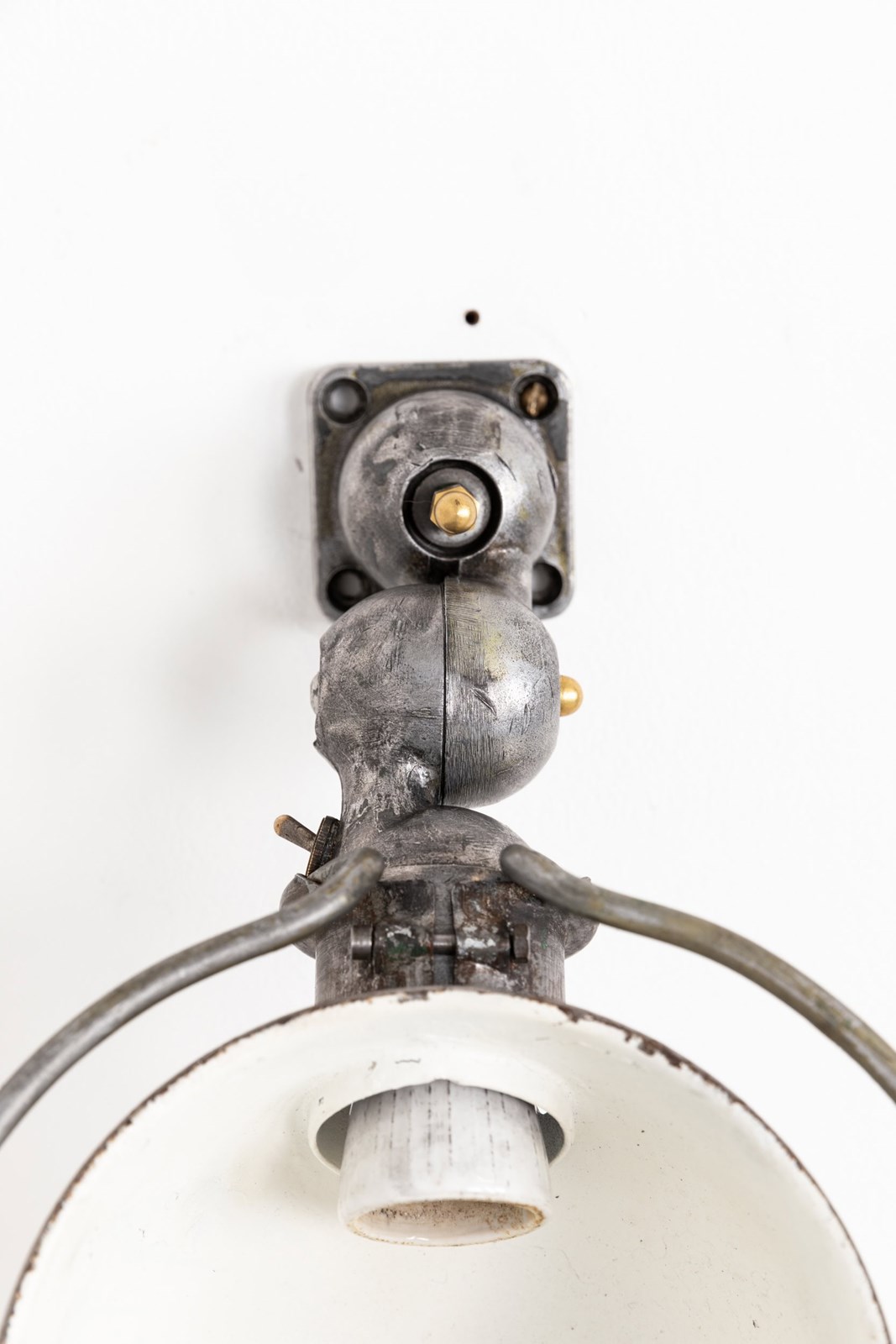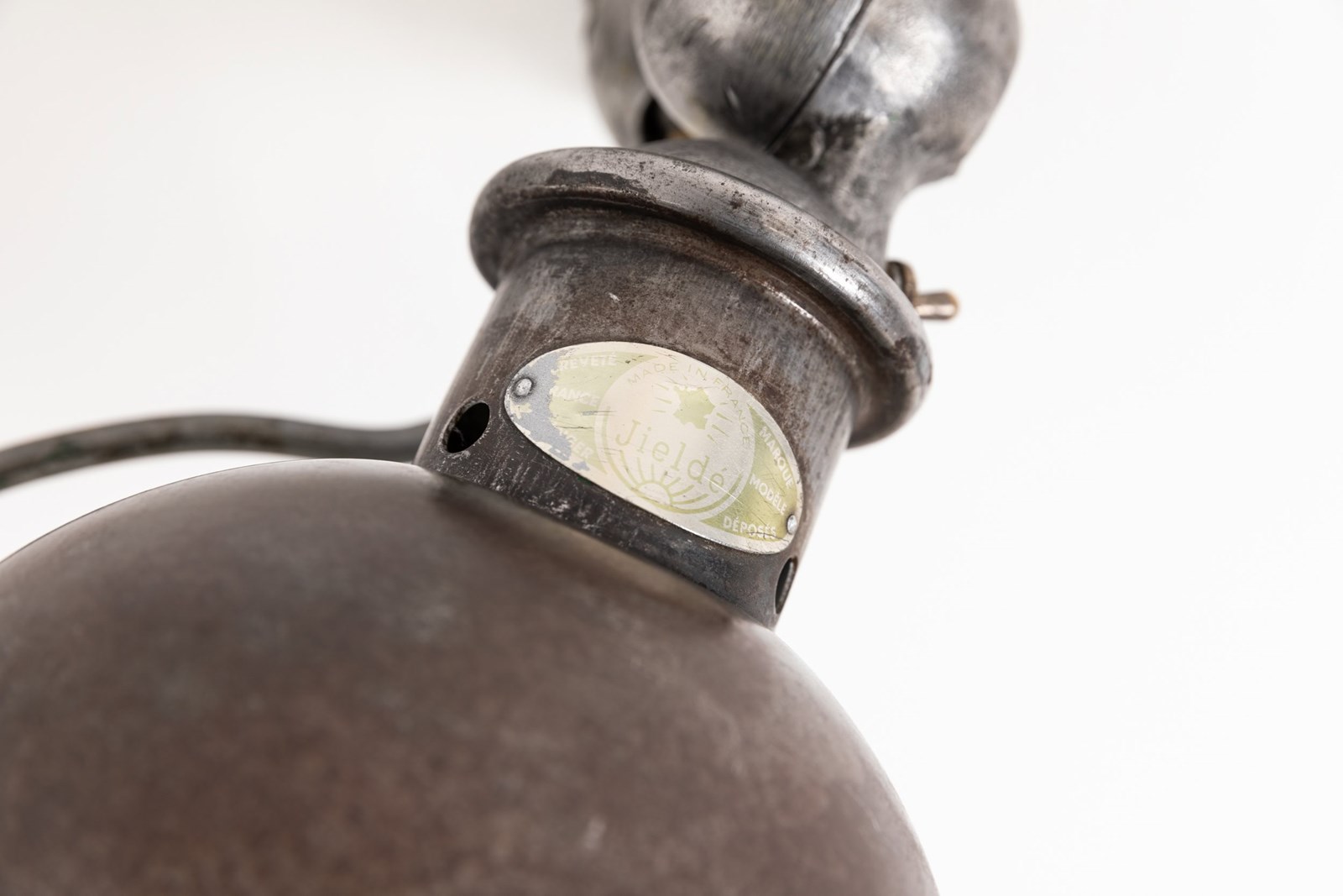 Designed for use on workshop machinery in demanding industrial environments, the Jieldé lamp was engineered for absolute simplicity, reliability and ease of repair. This example retains its original printed maker’s plate and the characteristic heavy‑duty toggle switch. The paint has been stripped back, leaving factory marks and natural tarnish visible across the metal, details that underline its authentic industrial character.