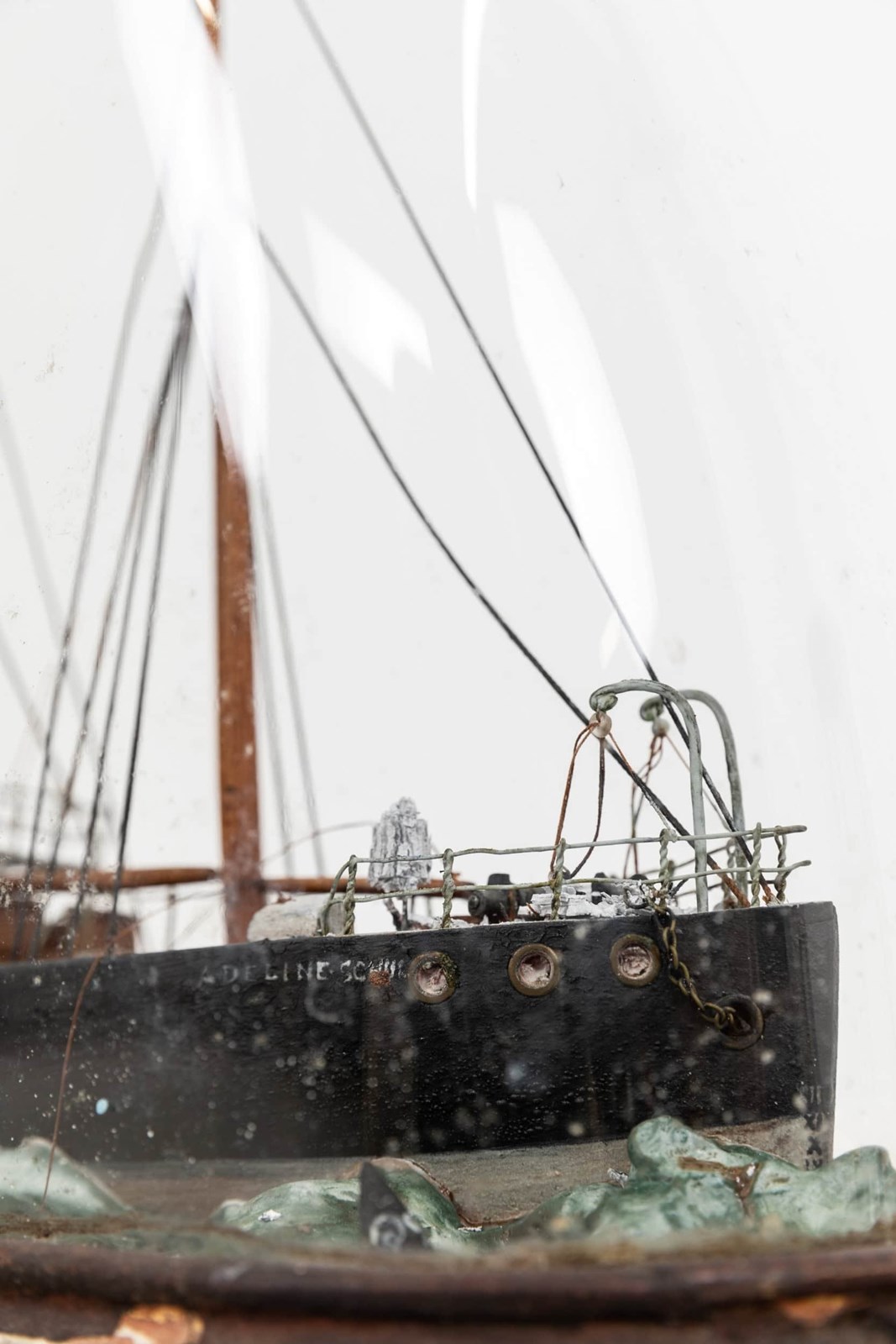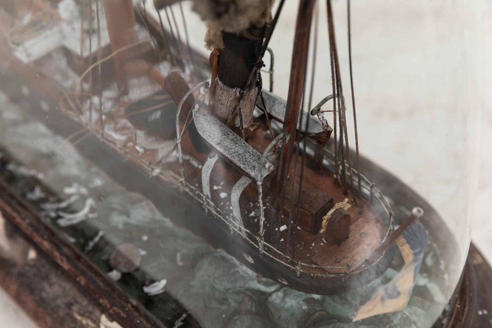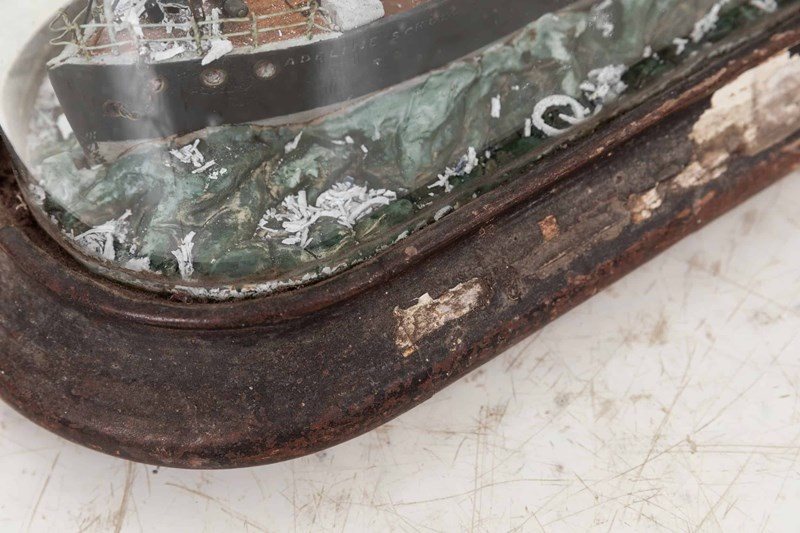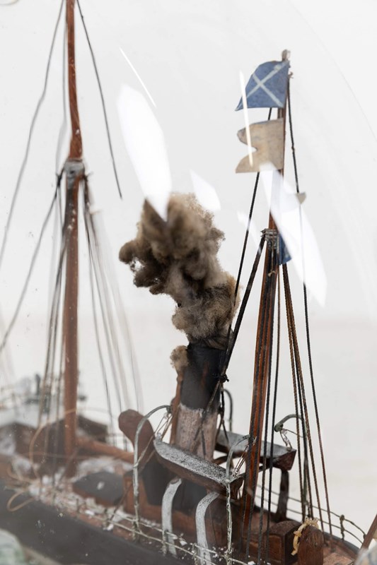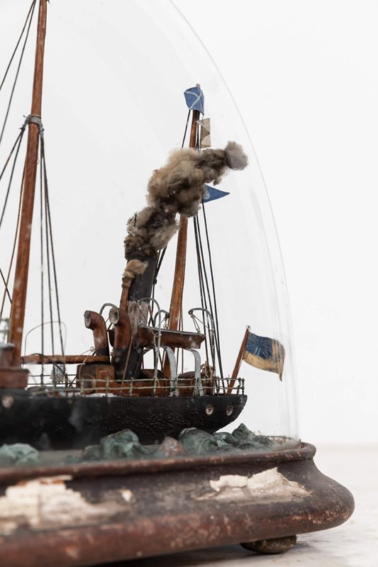 Presented in original condition, under its hand blown glass dome. This example captures the transitional era of maritime design, pairing two fully rigged masts with a central smokestack to evoke the moment when sail and steam worked side by side. The black hull, detailed deck fittings, and cotton‑plume “steam” bring the vessel to life, while the sculpted wave base adds a sense of movement.