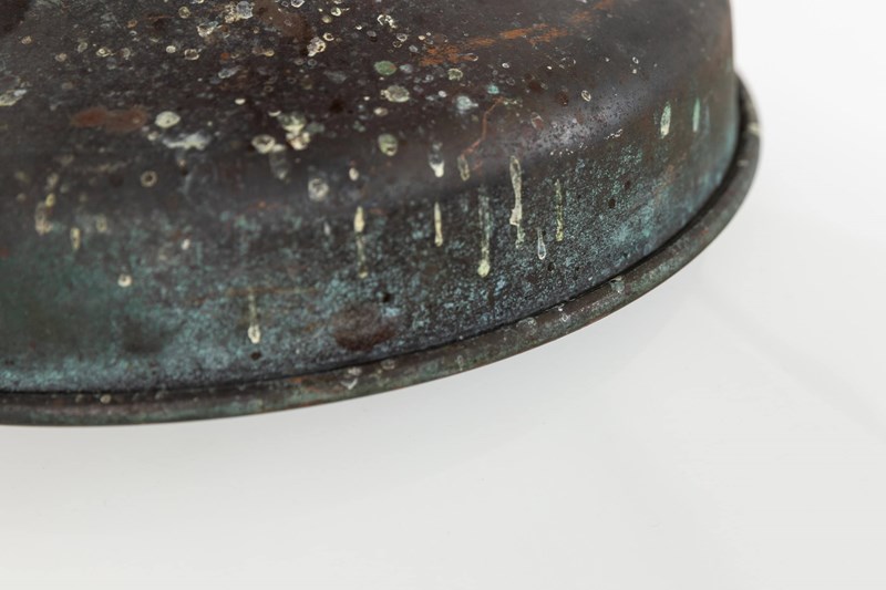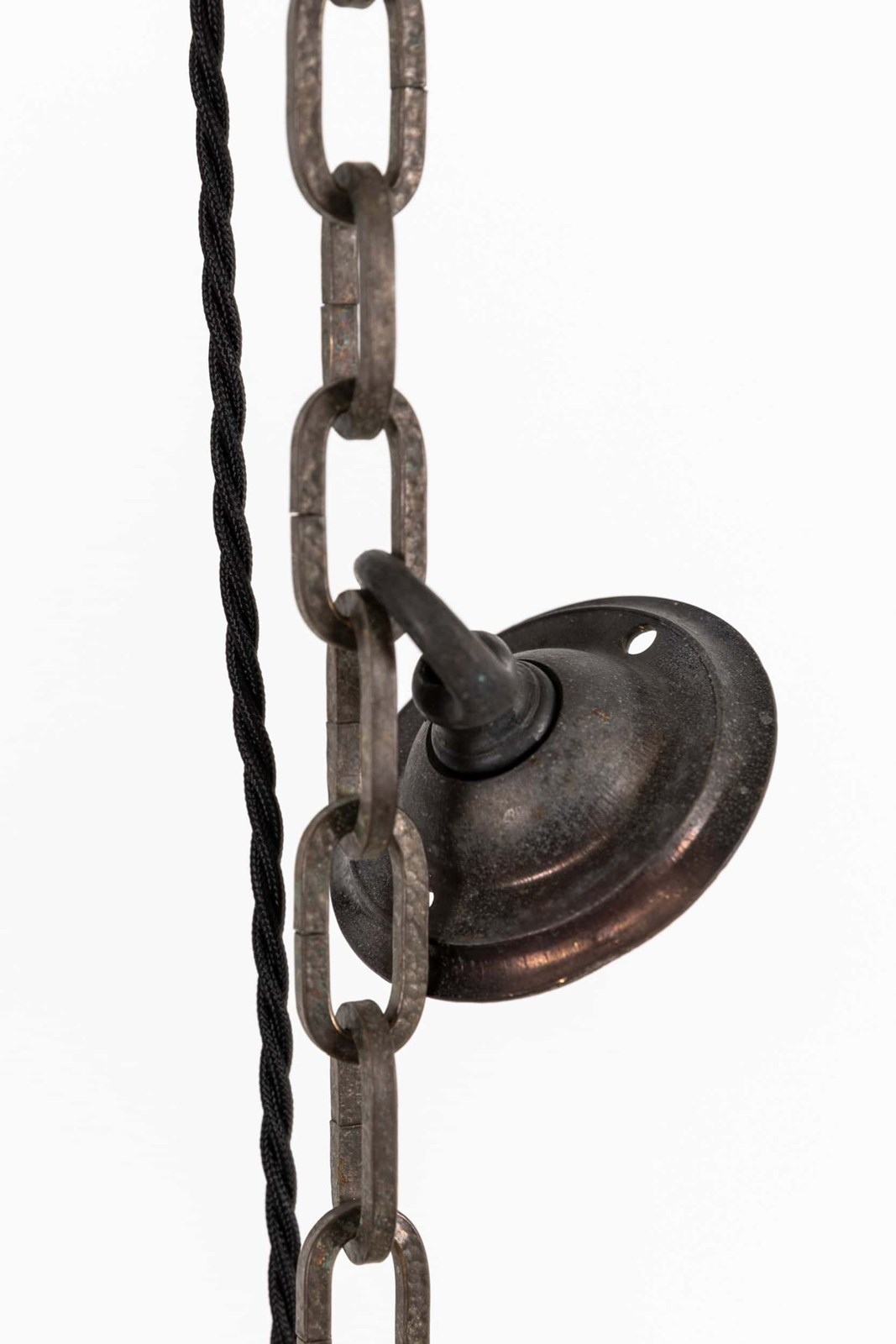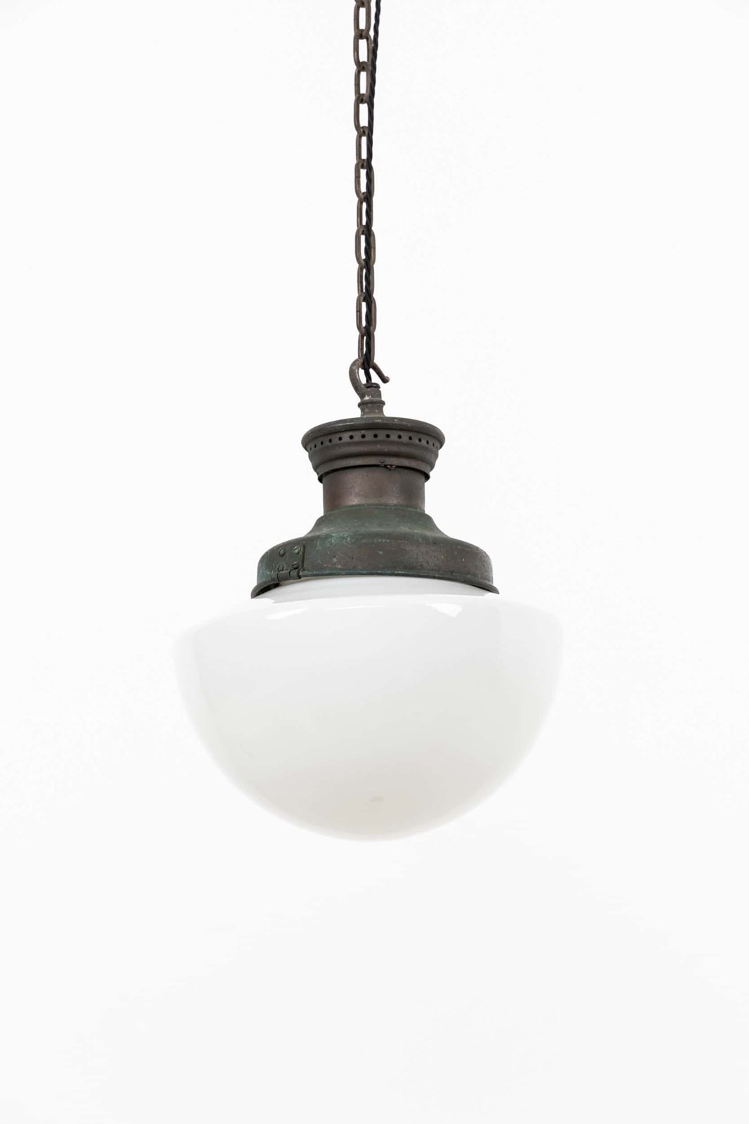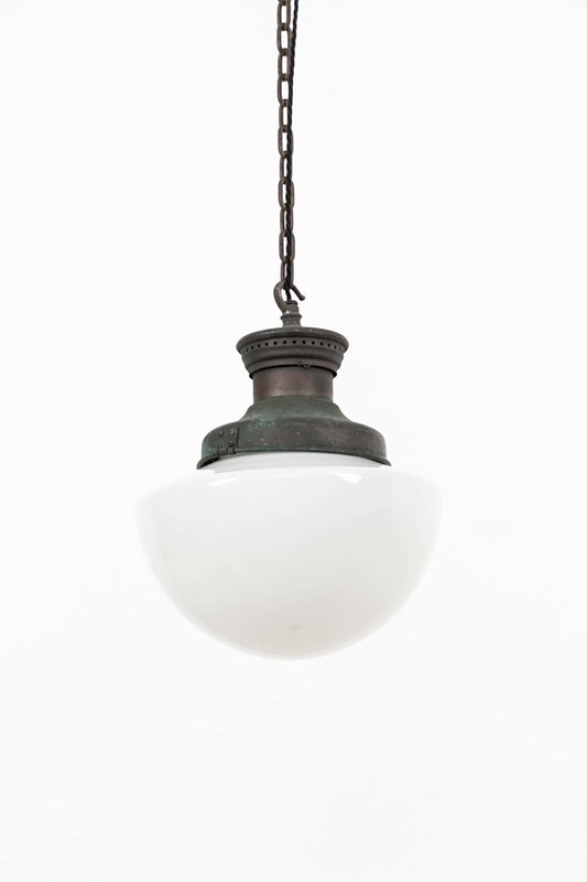 Beautifully formed semi-spherical opaline glass pendant lamp with copper gallery. c.1930