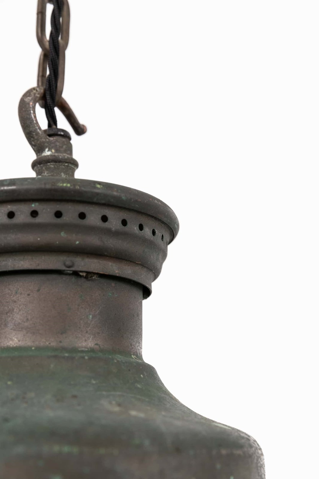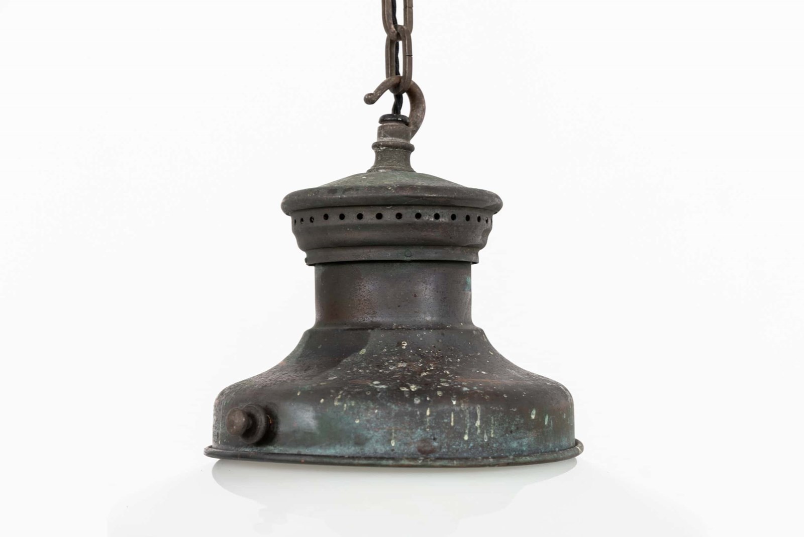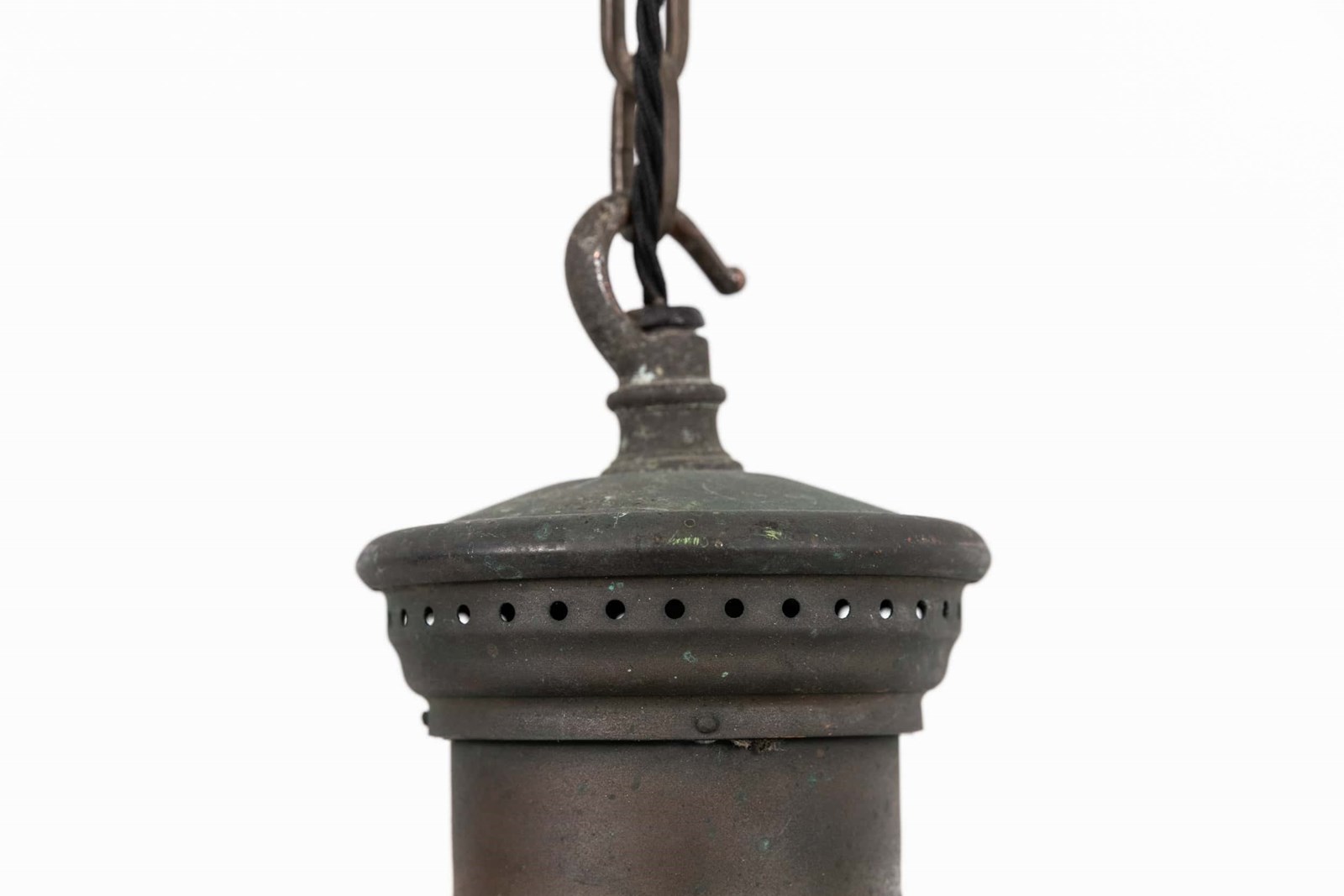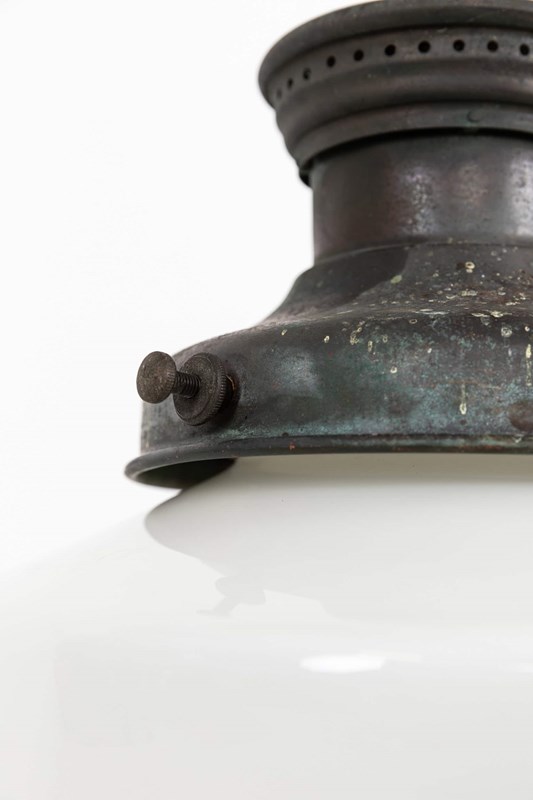 Moulded opaline glass shade, this shape of lamp were often found in churches and chapels up and down the country. Complete with original heavy duty hinged copper gallery which has a wonderful original patina.