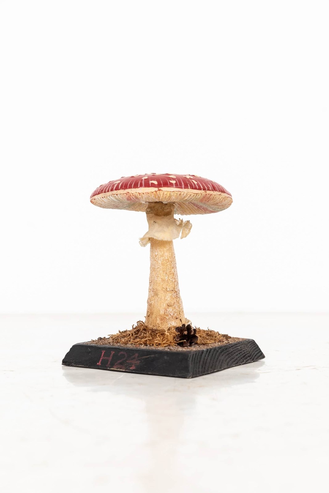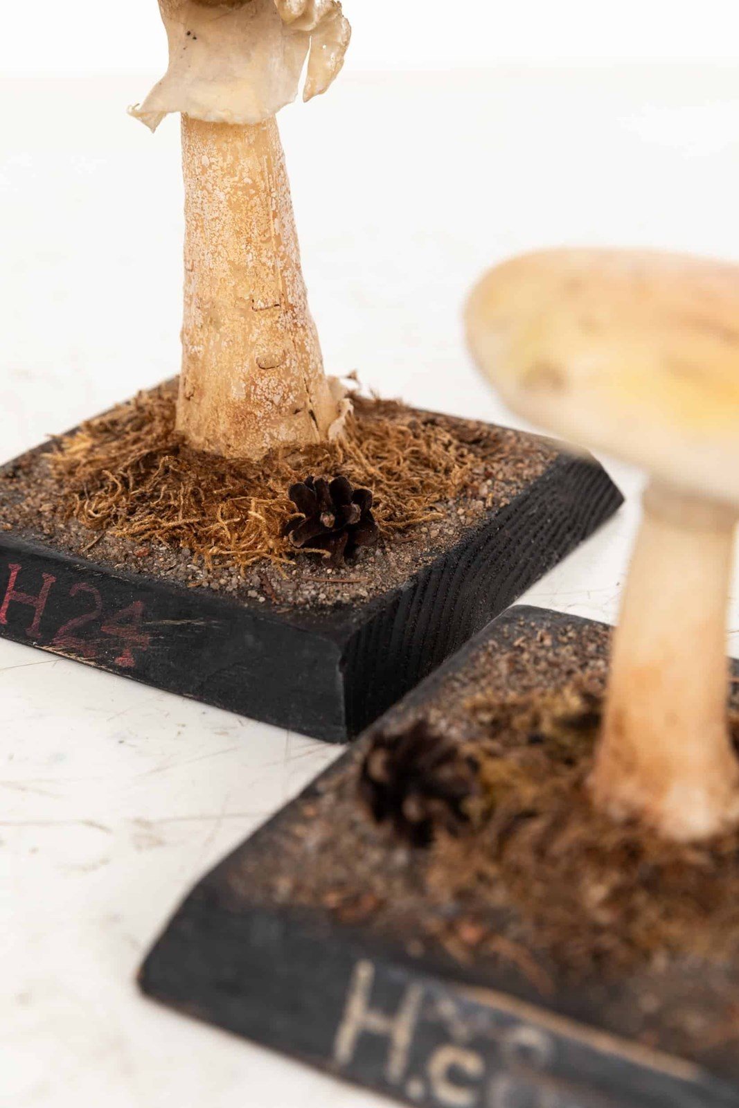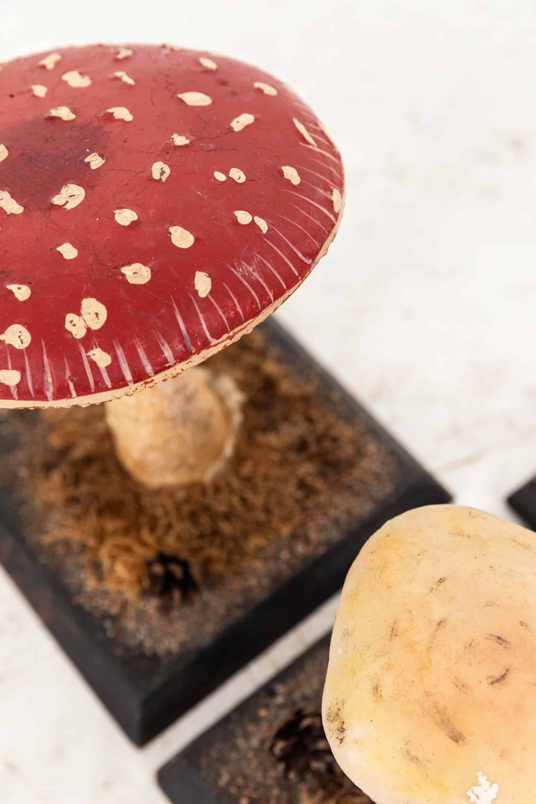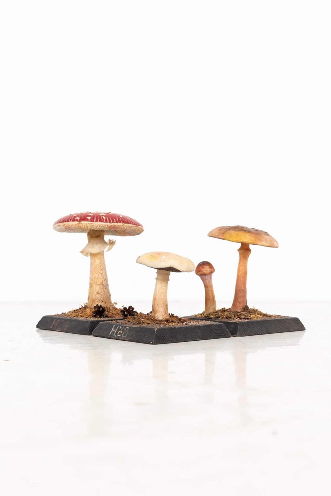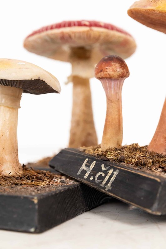 Cast in resin and mounted on ebonised wooden blocks, each specimen sits within a finely modelled forest‑floor tableau. The mushrooms are exceptionally well rendered, with crisp detailing and accurate form. The wooden mounts retain their original colour‑coded numbers, used to teach which species were poisonous.