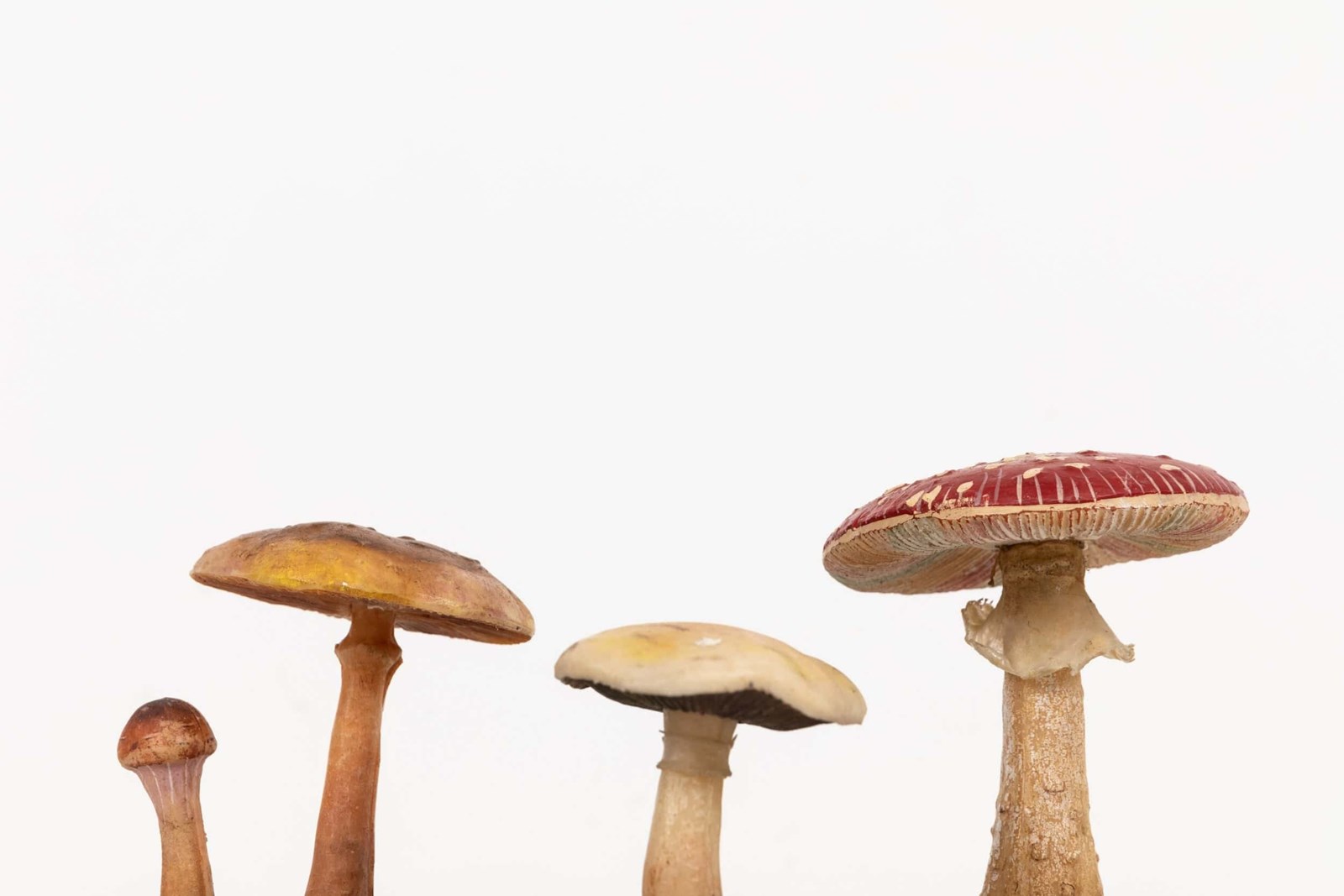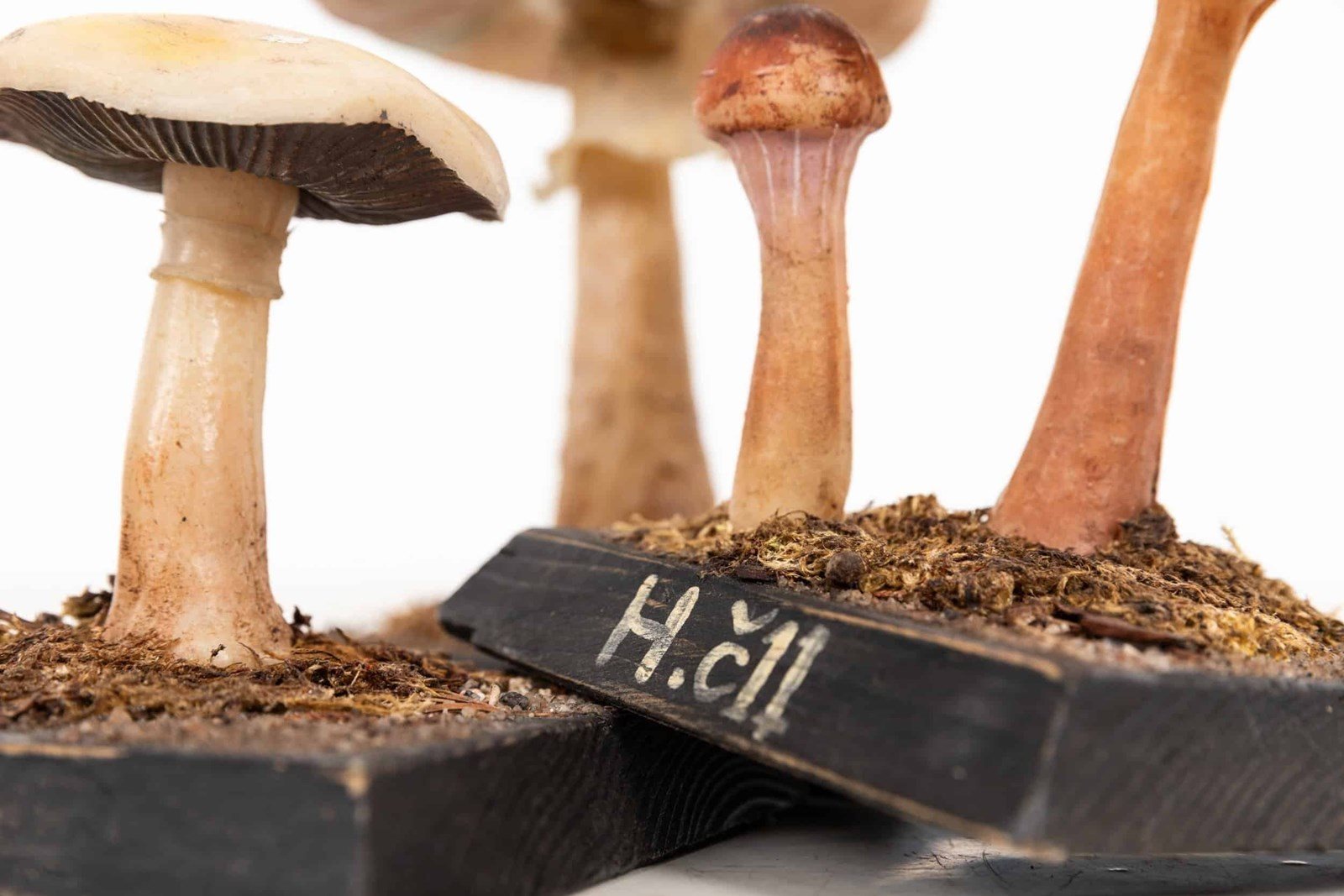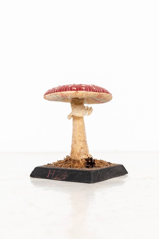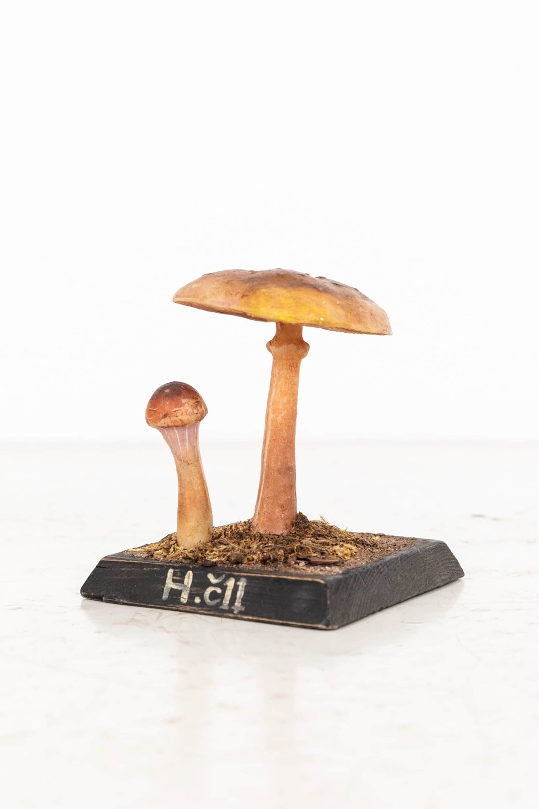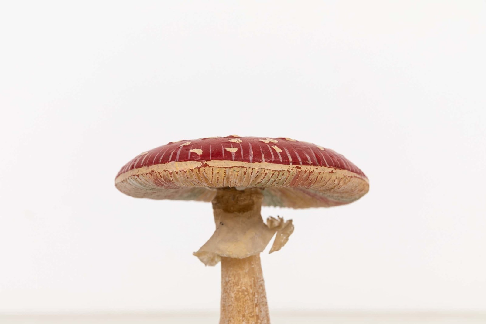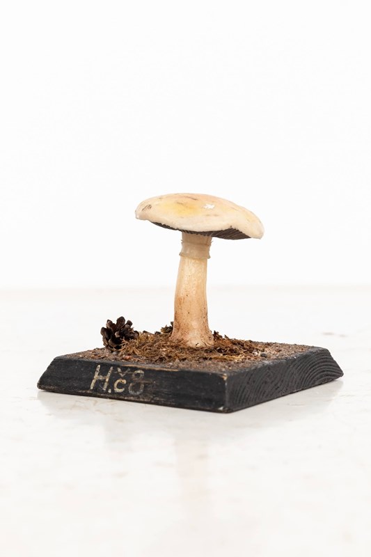 Cast in resin and mounted on ebonised wooden blocks, each specimen sits within a finely modelled forest‑floor tableau. The mushrooms are exceptionally well rendered, with crisp detailing and accurate form. The wooden mounts retain their original colour‑coded numbers, used to teach which species were poisonous.