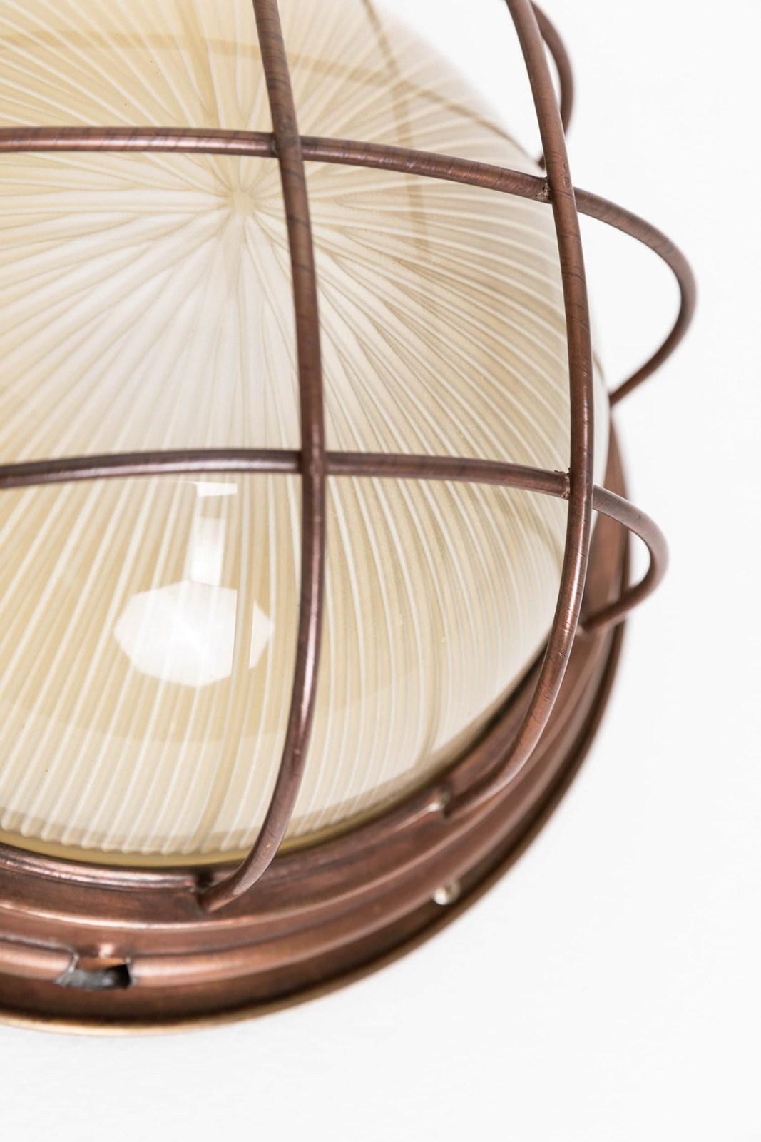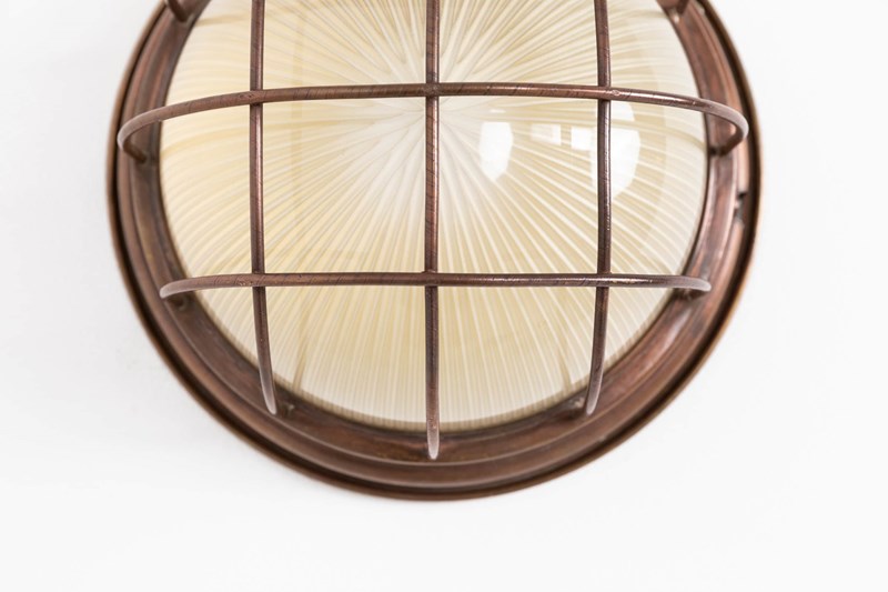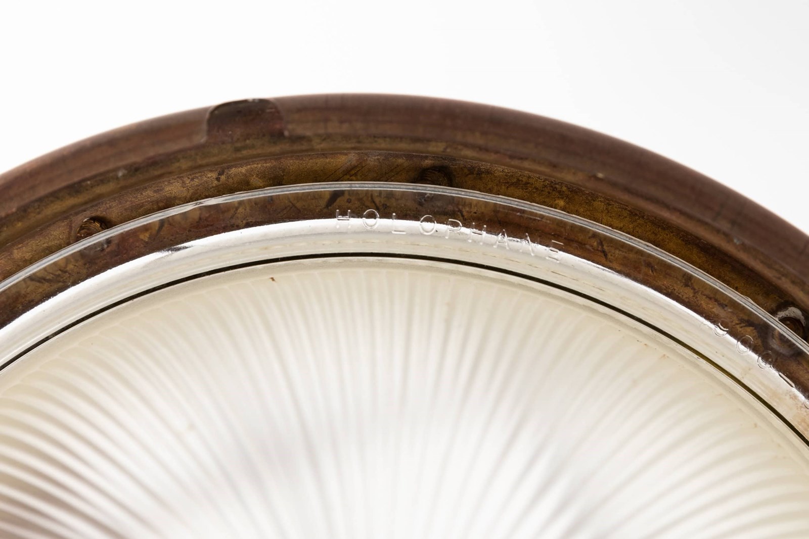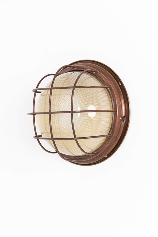 Prismatic glass bowl, stamped inside Holophane, set in its original caged copper flush fitting for either wall or ceiling mounting.