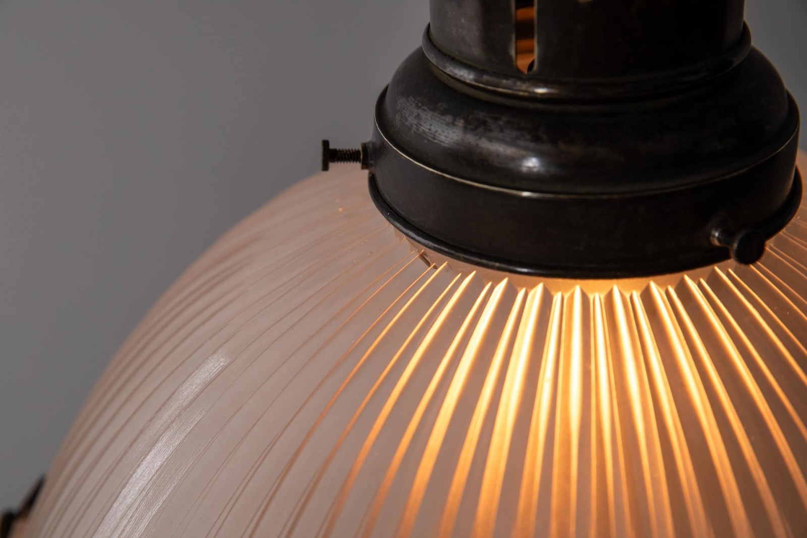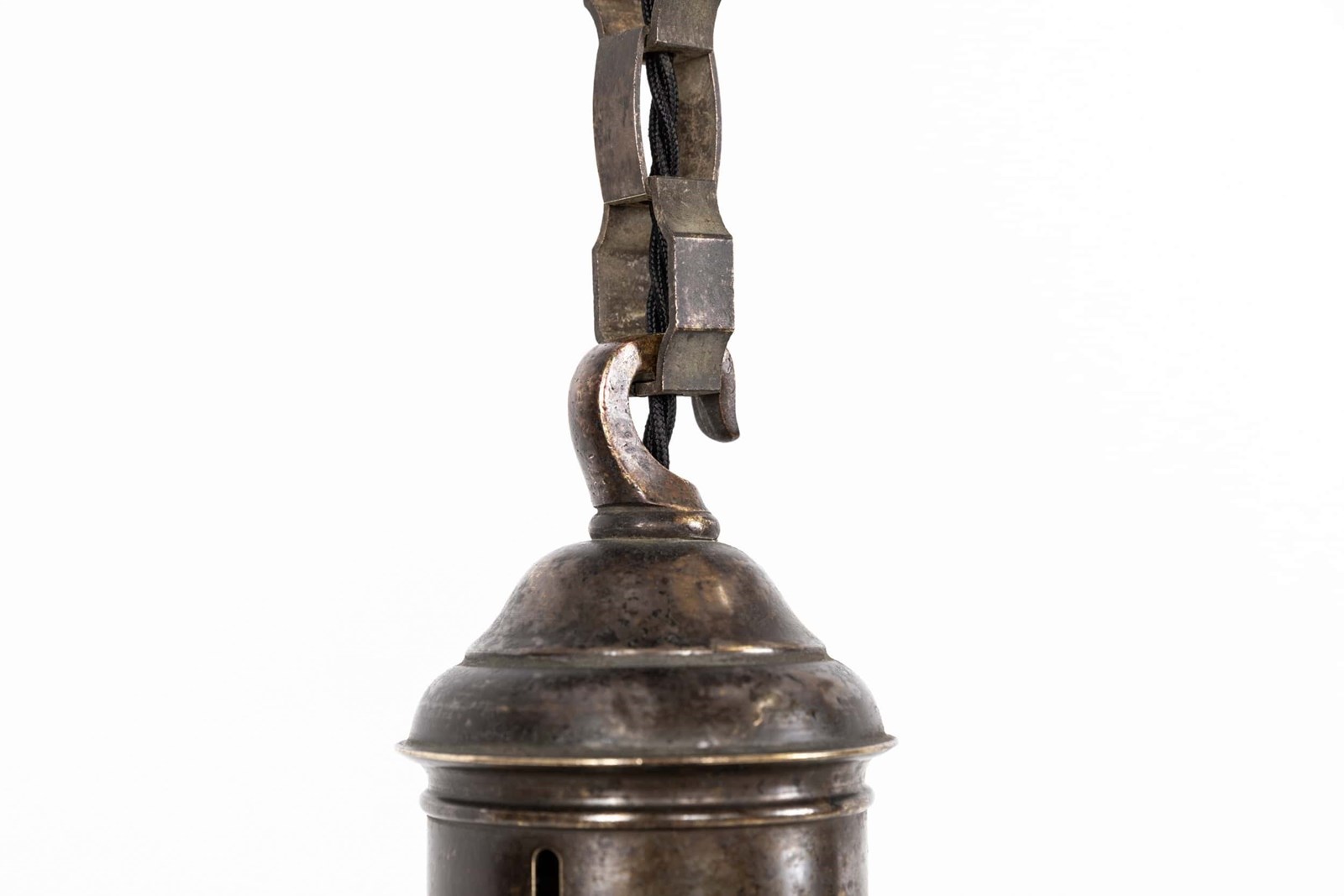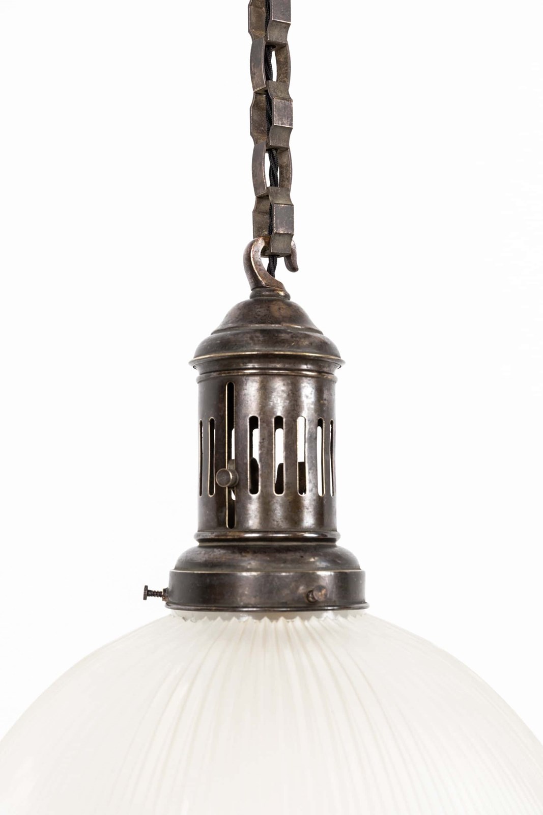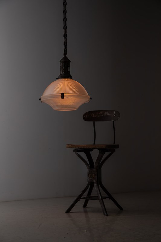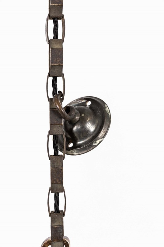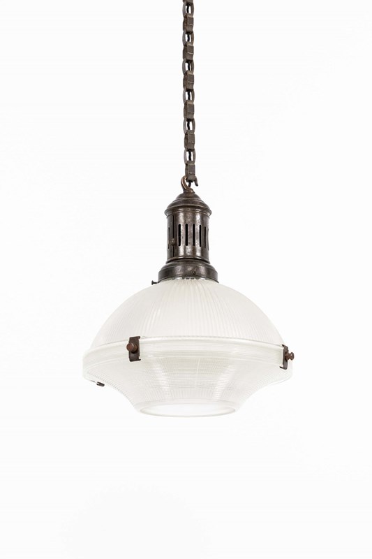 Two-part prismatic glass shades, held together with brass clips and supported by its original elongated gallery and chunky chain. Glass stamped with the makers mark.