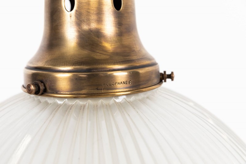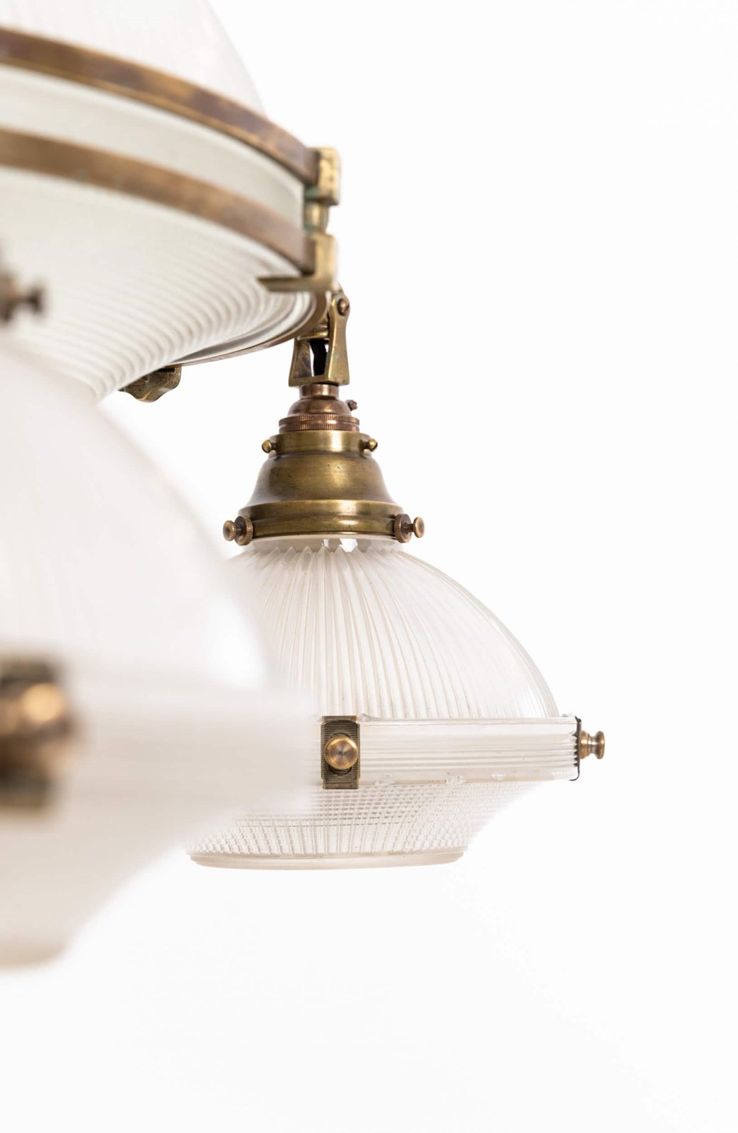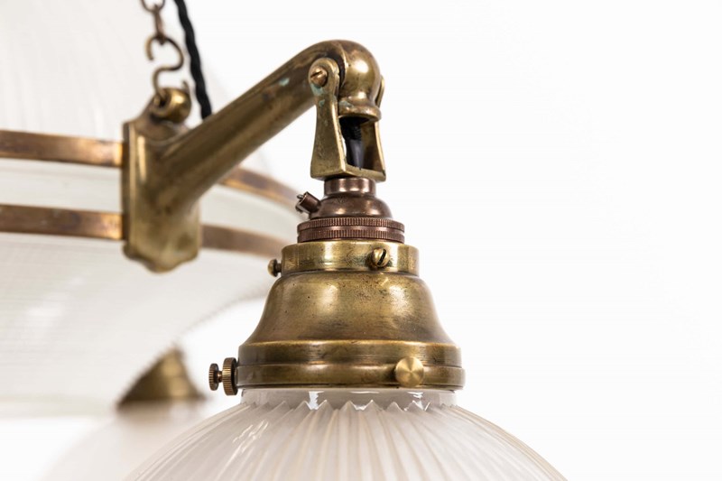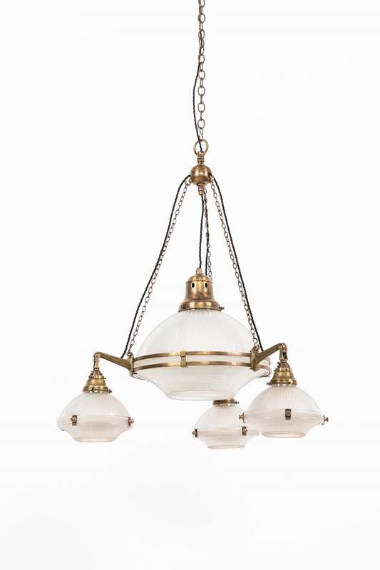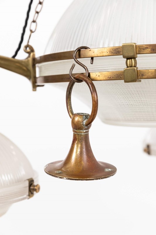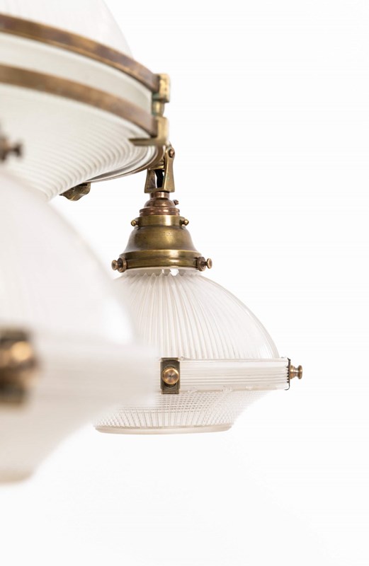 Featuring a large 14" prismatic inner shade with three 8" Holophane glass perimeter shades, evenly spaced around a dual-banded brass ring. All glass components are stamped Holophane.