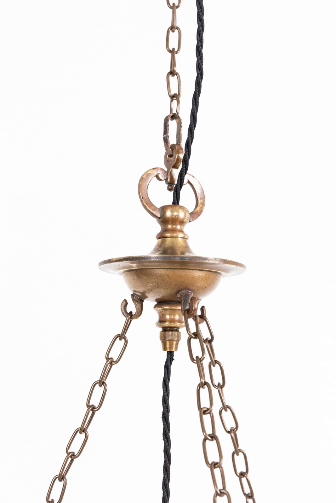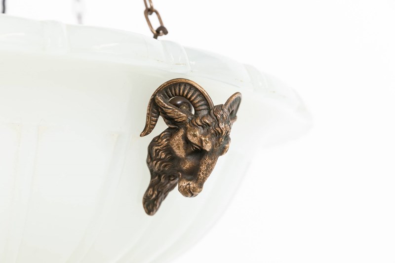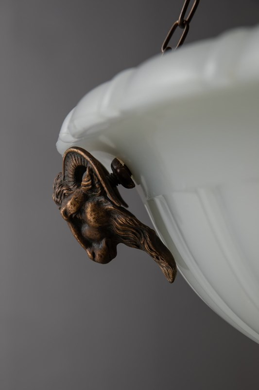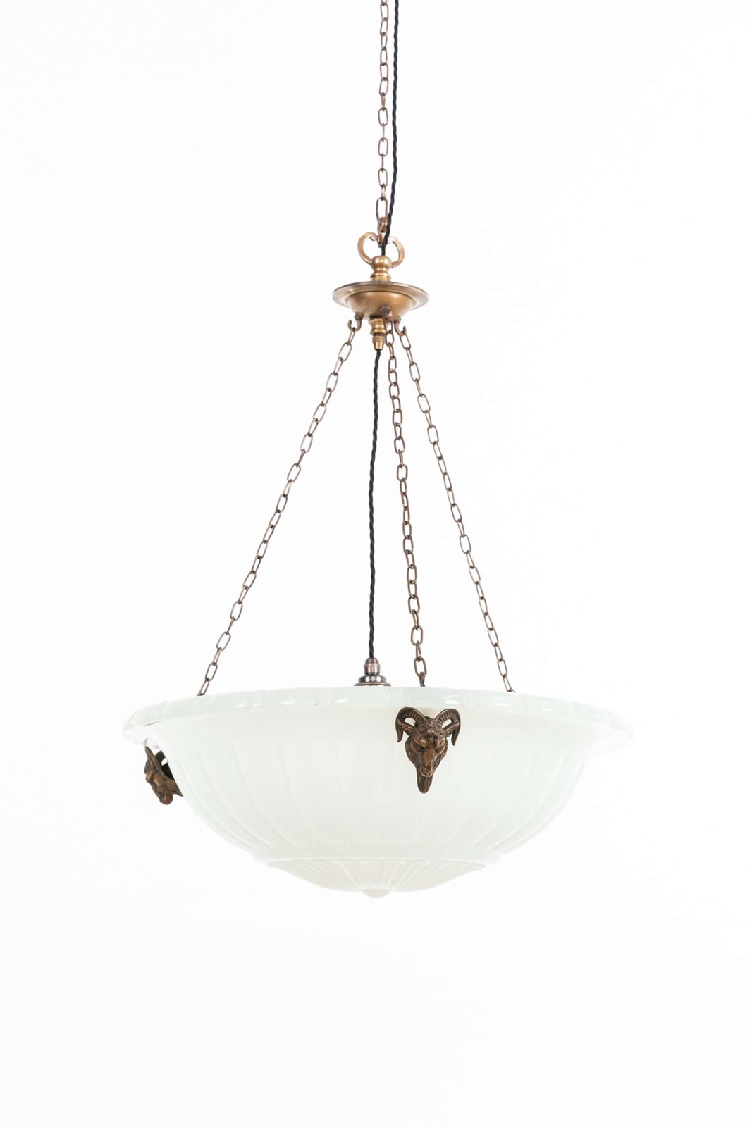 Heavy duty pressed milk glass of fluted design, it retains its original brass ram’s head mounts with beautifully detailed casting. Complete with hanger, chains and a ceiling hook. Chains can be shortened to suit ceiling height.