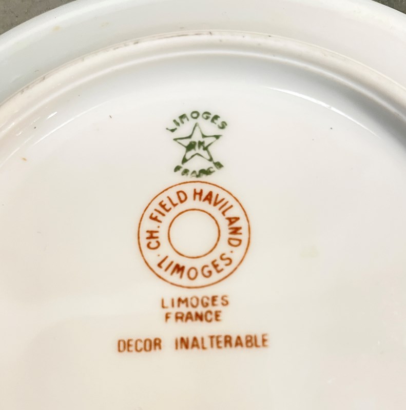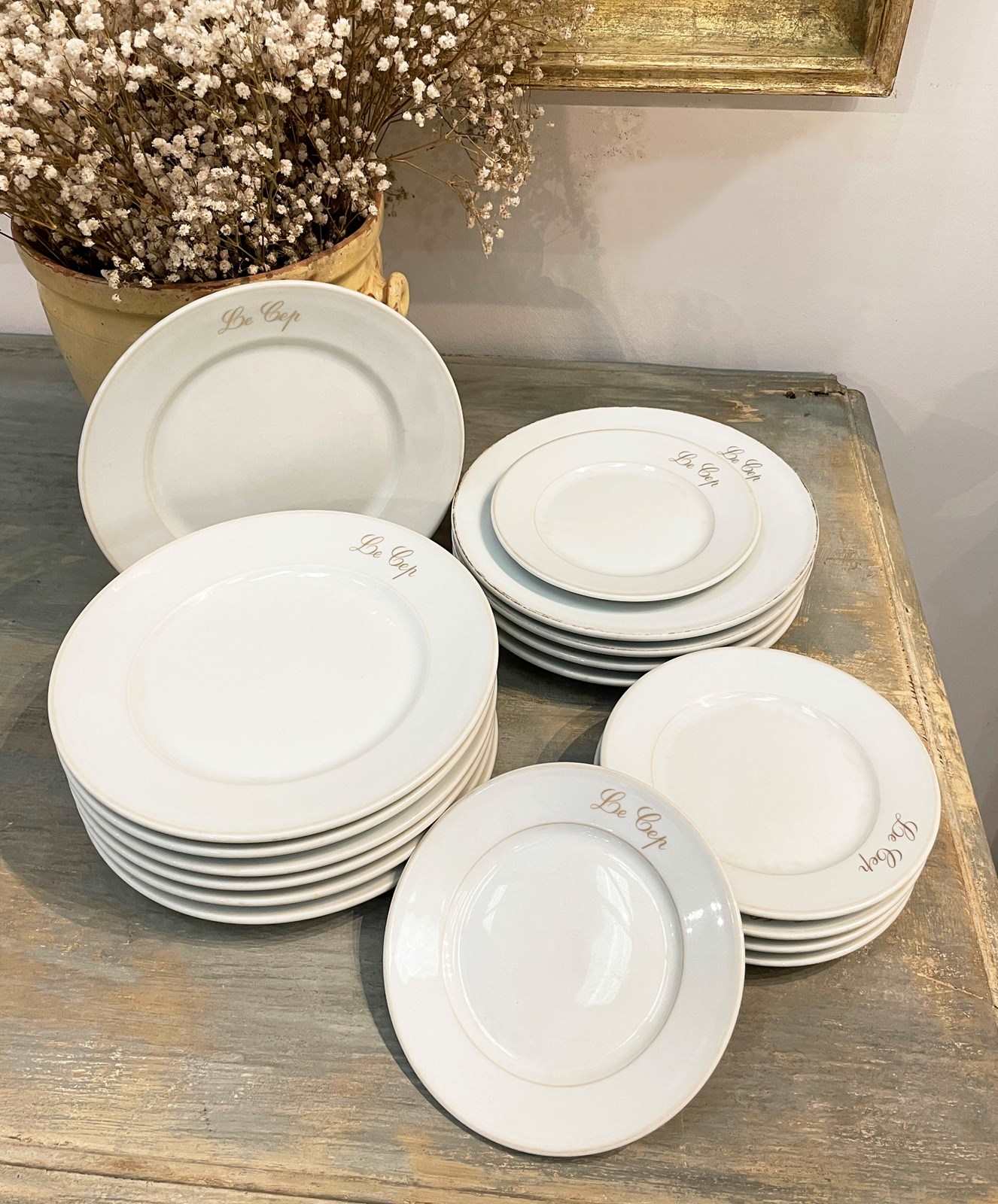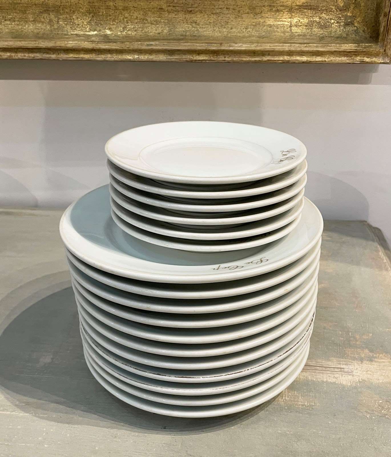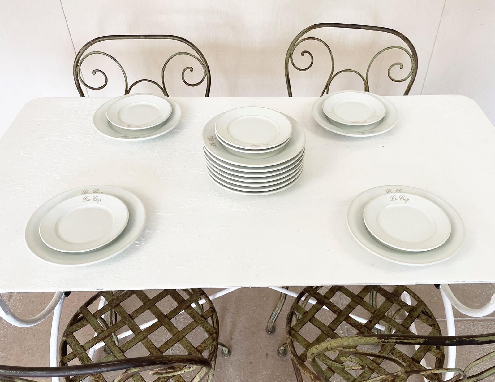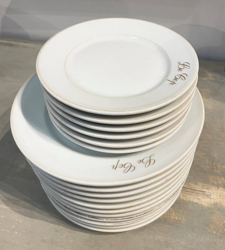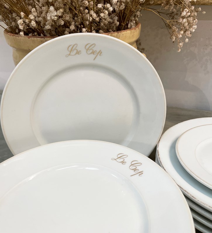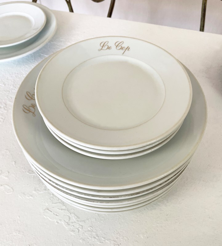 Lovely old French white restaurant plates from 'Le Cep' restaurant - made by the famous French pottery 'Limoges'. There are 6 small side plates and 11 large dinner plates. All are very sturdy and in good condition and all have the name of the restaurant on them in gold. Circa 1920.
