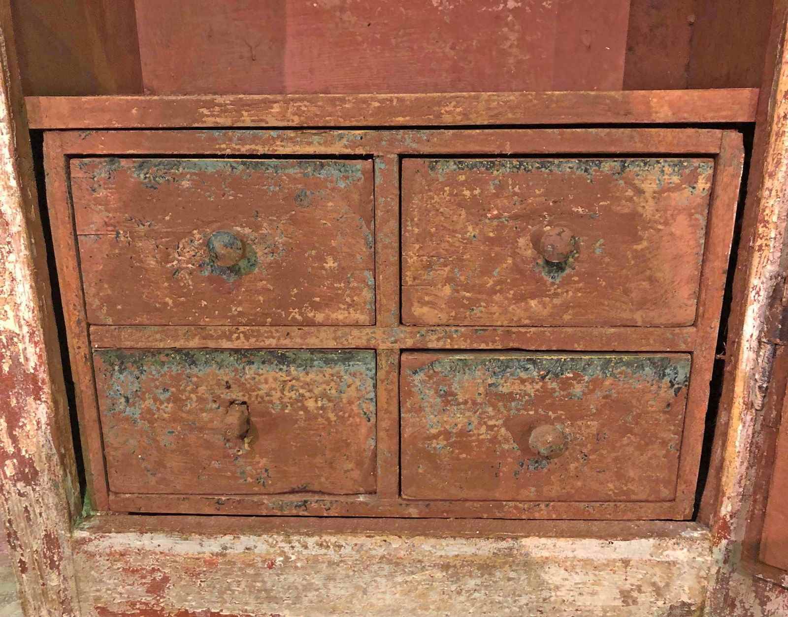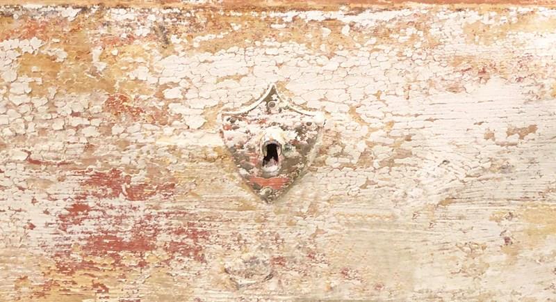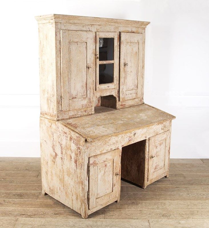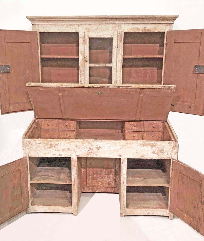 A quirky piece this! 18th century Italian Secretaire or bureau in 2 parts. It obviously has not been touched for years - layers of old paint still clinging on to it. Masses of storage in cupboards and small drawers - even a cupboard at the very back of the knee hole for valuables! Perfect for the lovers of authentic and rare furniture. If you like 'Shabby Chic' here it is - in abundance! Circa 1780.