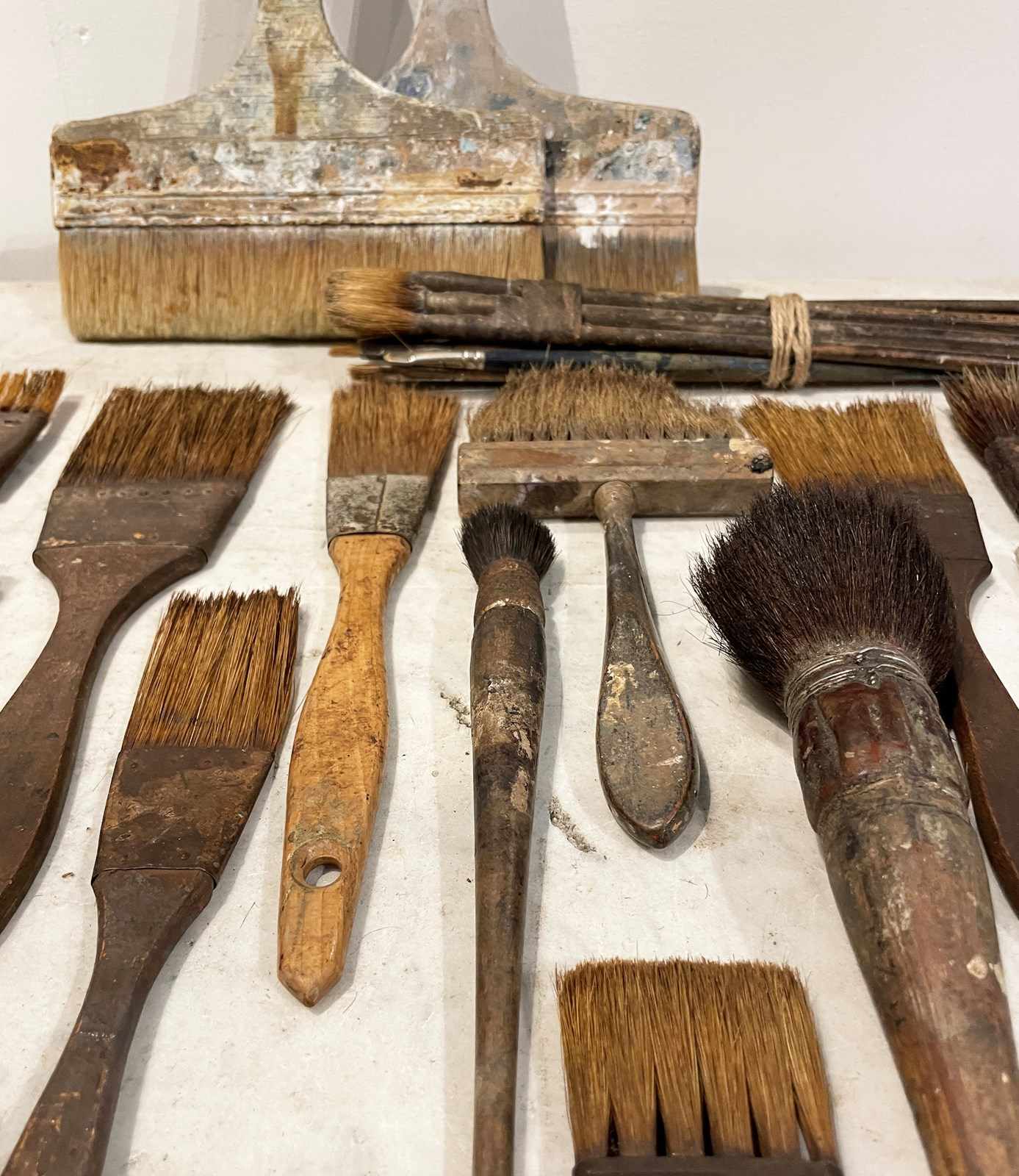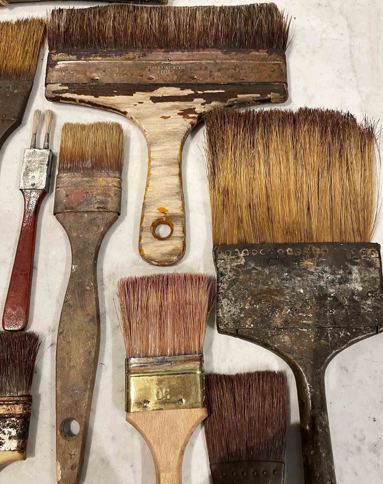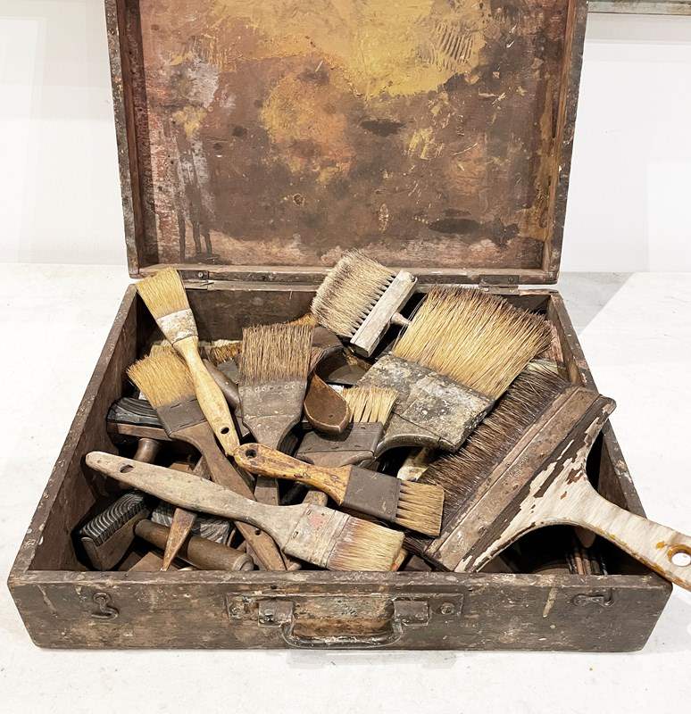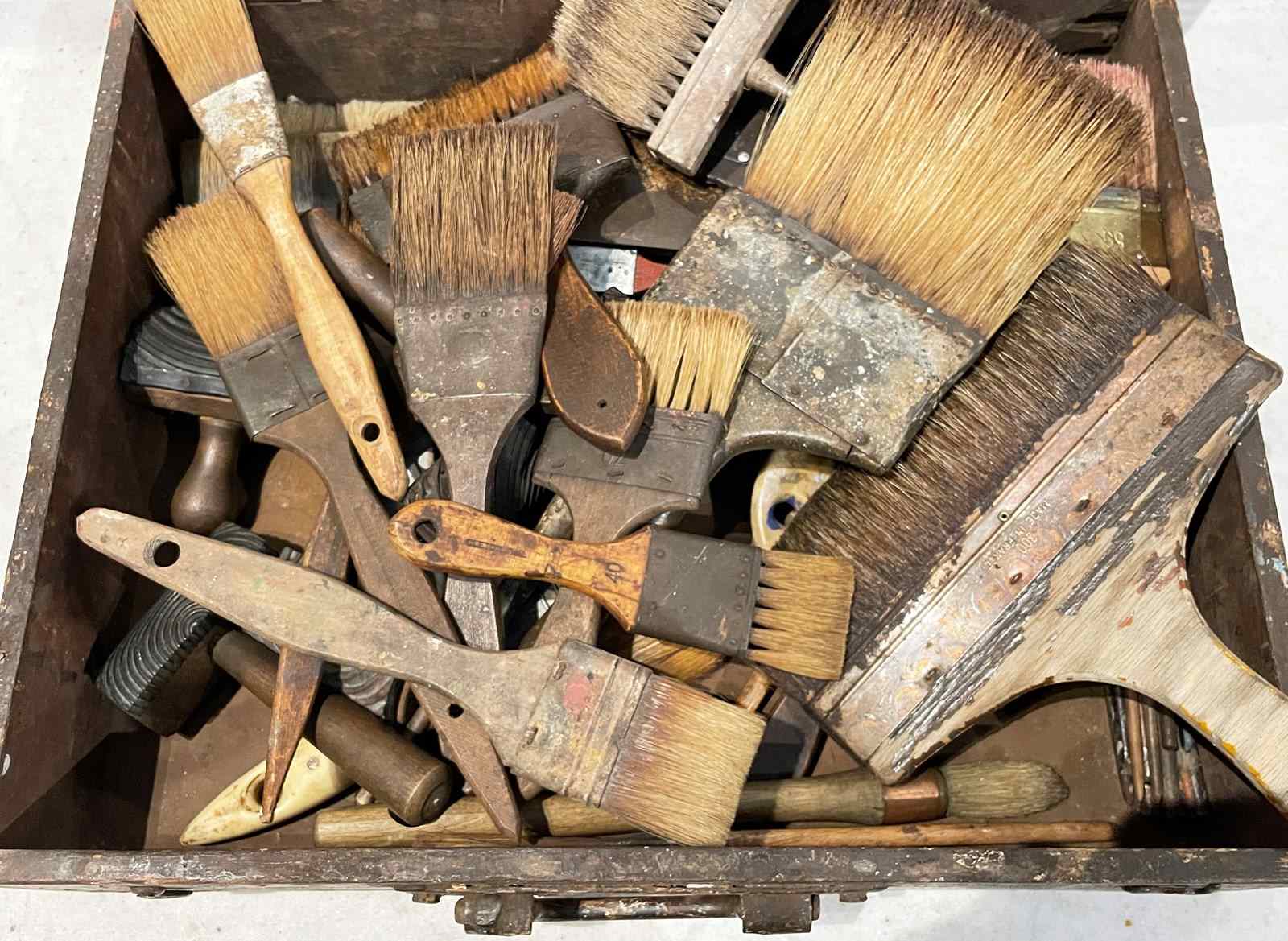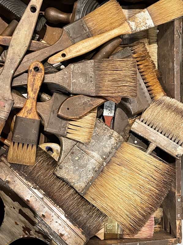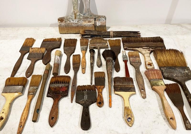 A fascinating collection of French Painters' Brushes in their original wooden Box. Mainly specialty brushes and gadgets for special effects on walls and furniture. This amazing collection gives us an insight into the range of special effects that the original owner of this collection would have been capable of creating. In total there are 25 brushes and a bundle of long artist's brushes -plus some interesting items such as iron 'combs' in a variety of sizes and rubber 'stamps' etc - Circa 1890