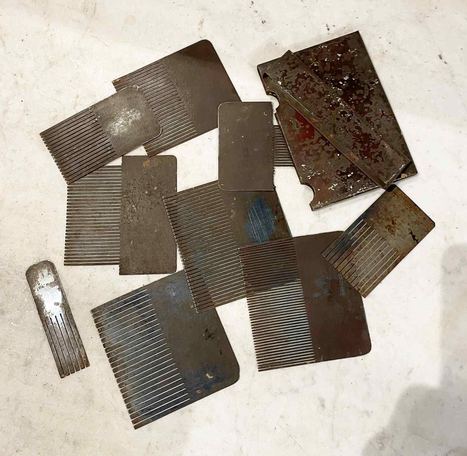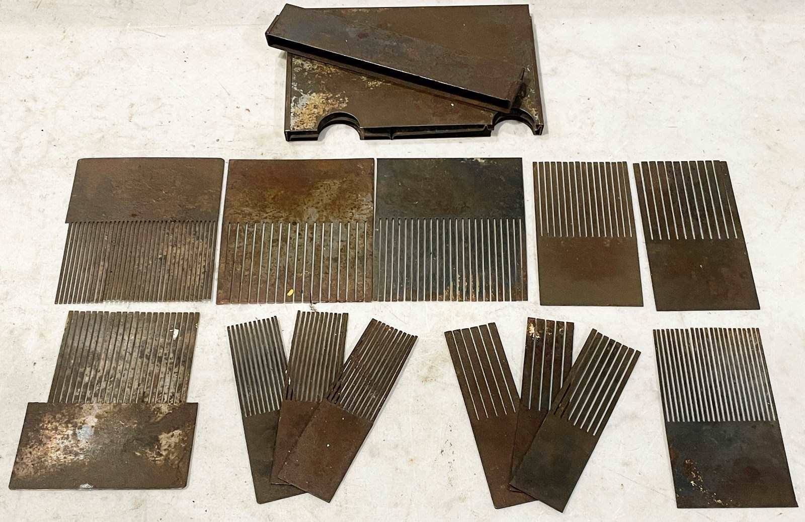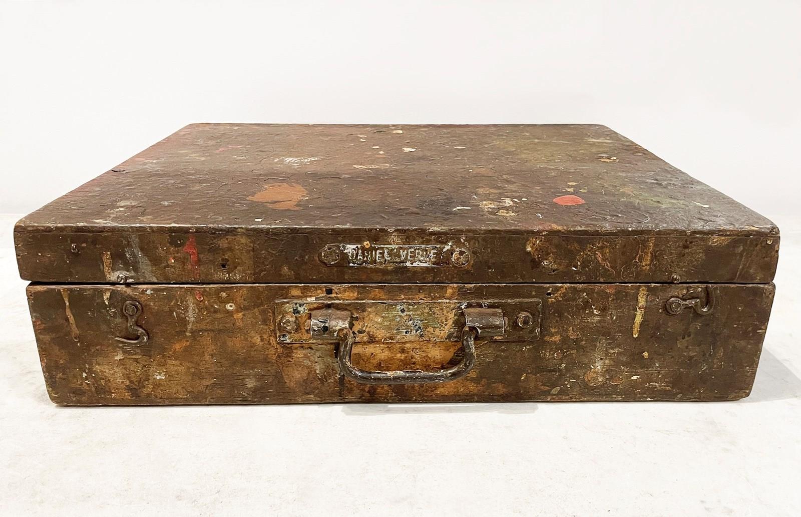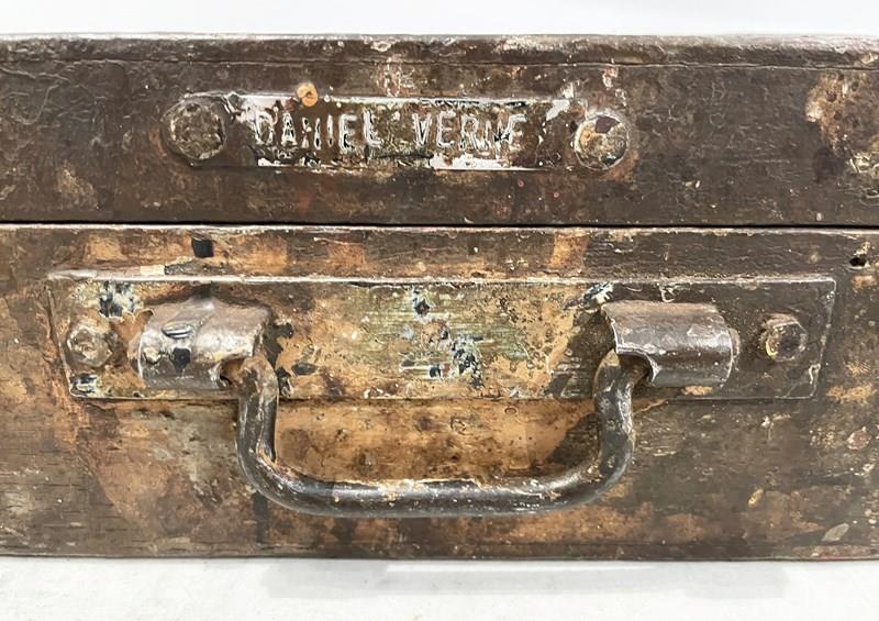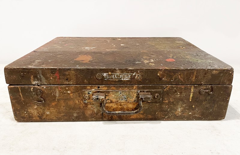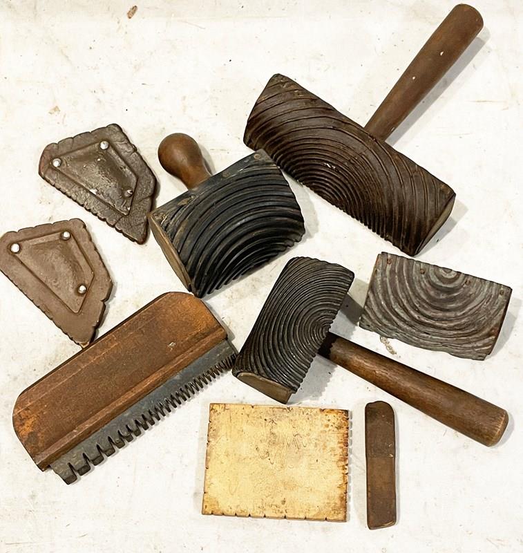 A fascinating collection of French Painters' Brushes in their original wooden Box. Mainly specialty brushes and gadgets for special effects on walls and furniture. This amazing collection gives us an insight into the range of special effects that the original owner of this collection would have been capable of creating. In total there are 25 brushes and a bundle of long artist's brushes -plus some interesting items such as iron 'combs' in a variety of sizes and rubber 'stamps' etc - Circa 1890