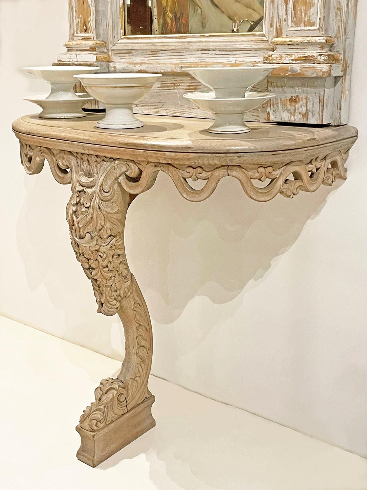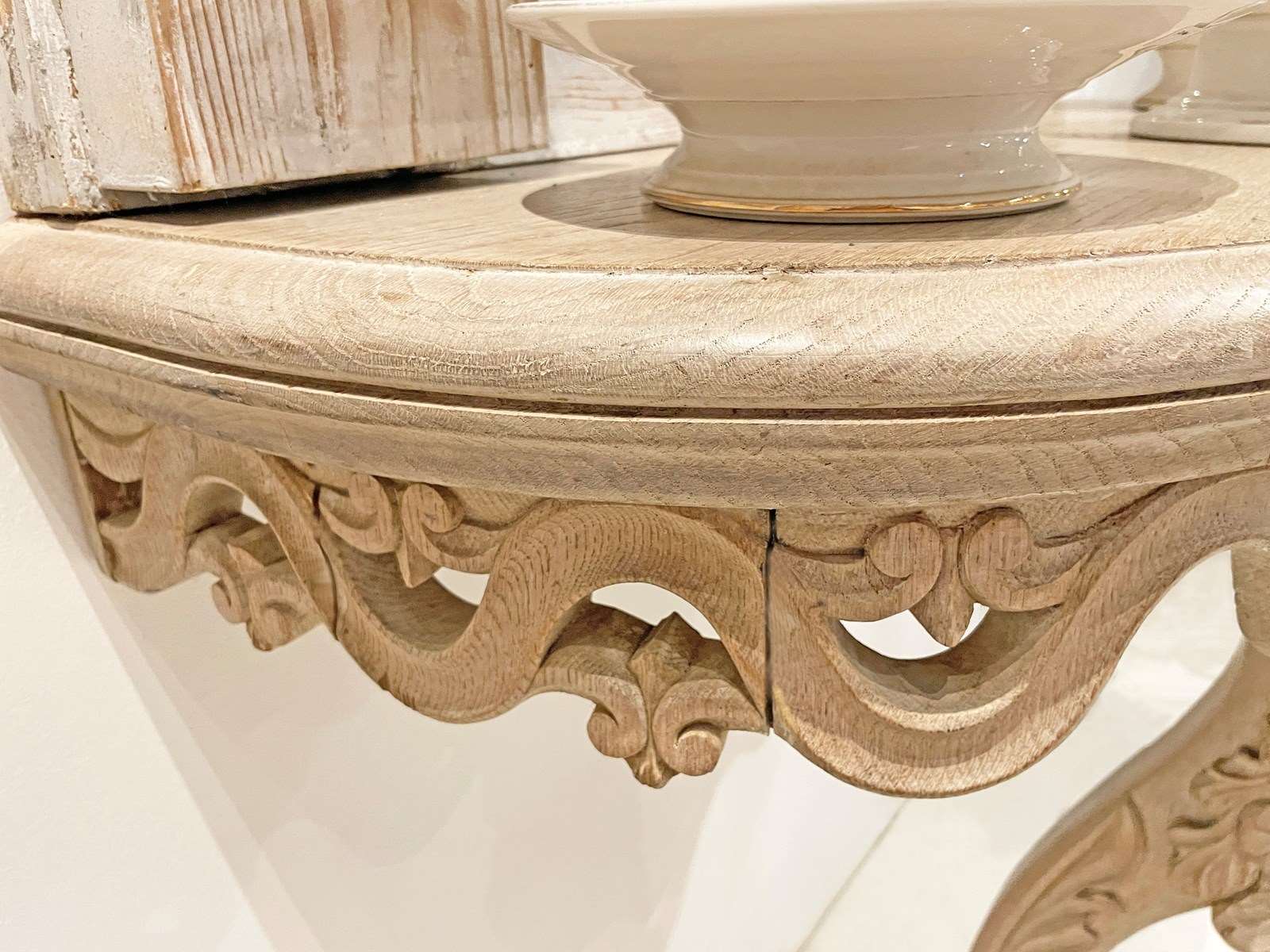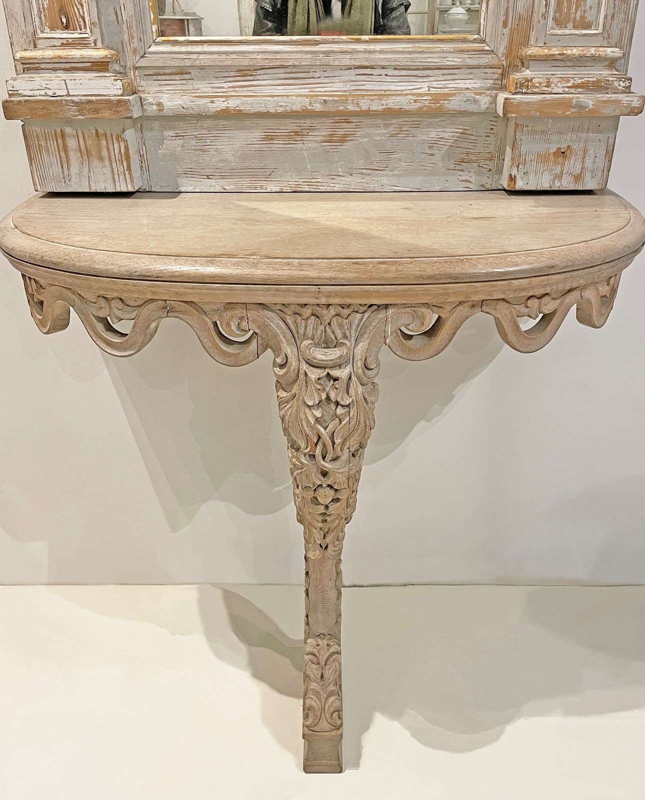 An early 19th century Italian pine Console with deeply carved frieze and support. A simple demi-lune shape with one central leg. A very pretty piece, ideal for a hall or end of a corridor - and perfect to hang a mirror above. Circa 1820