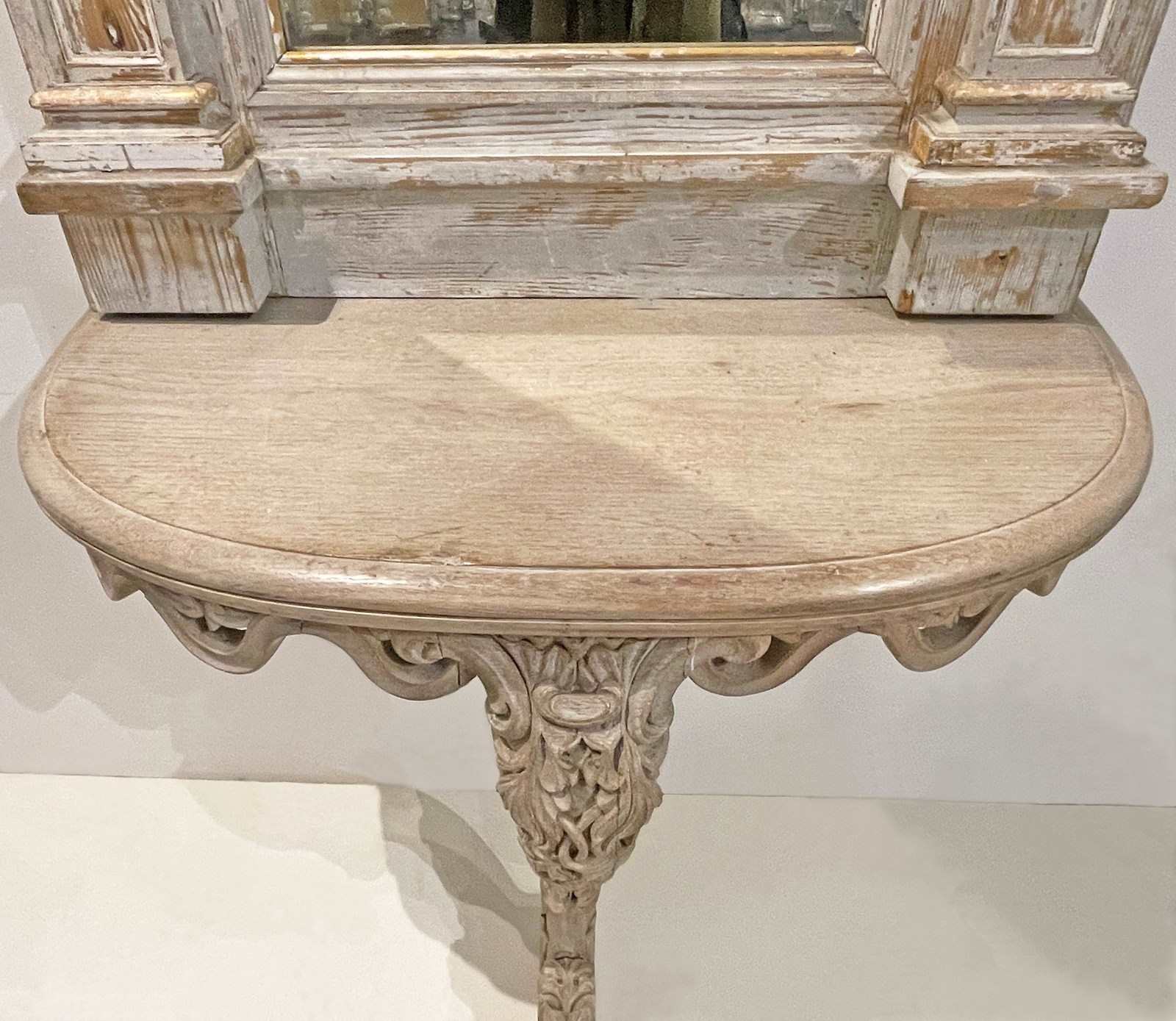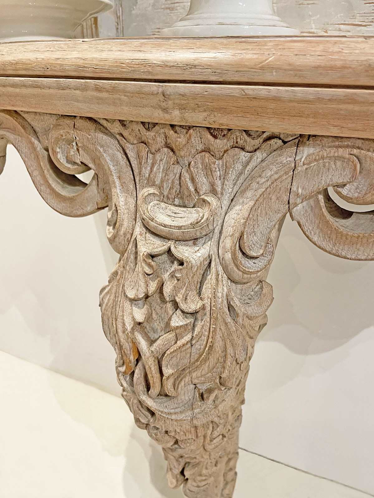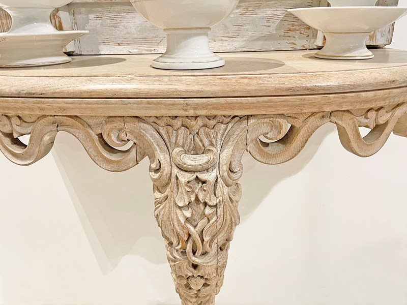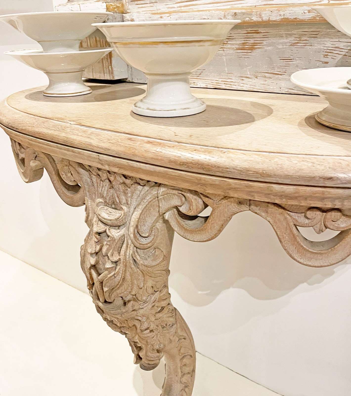 An early 19th century Italian pine Console with deeply carved frieze and support. A simple demi-lune shape with one central leg. A very pretty piece, ideal for a hall or end of a corridor - and perfect to hang a mirror above. Circa 1820