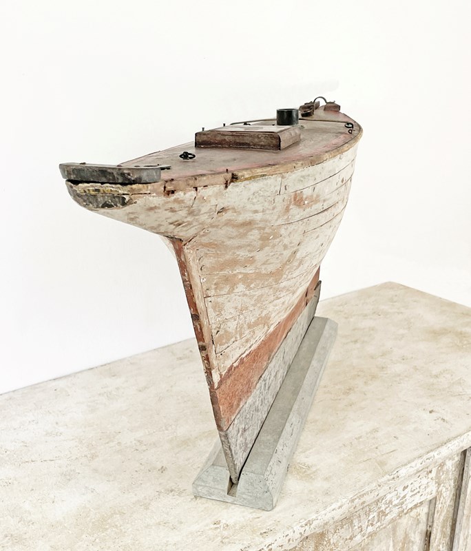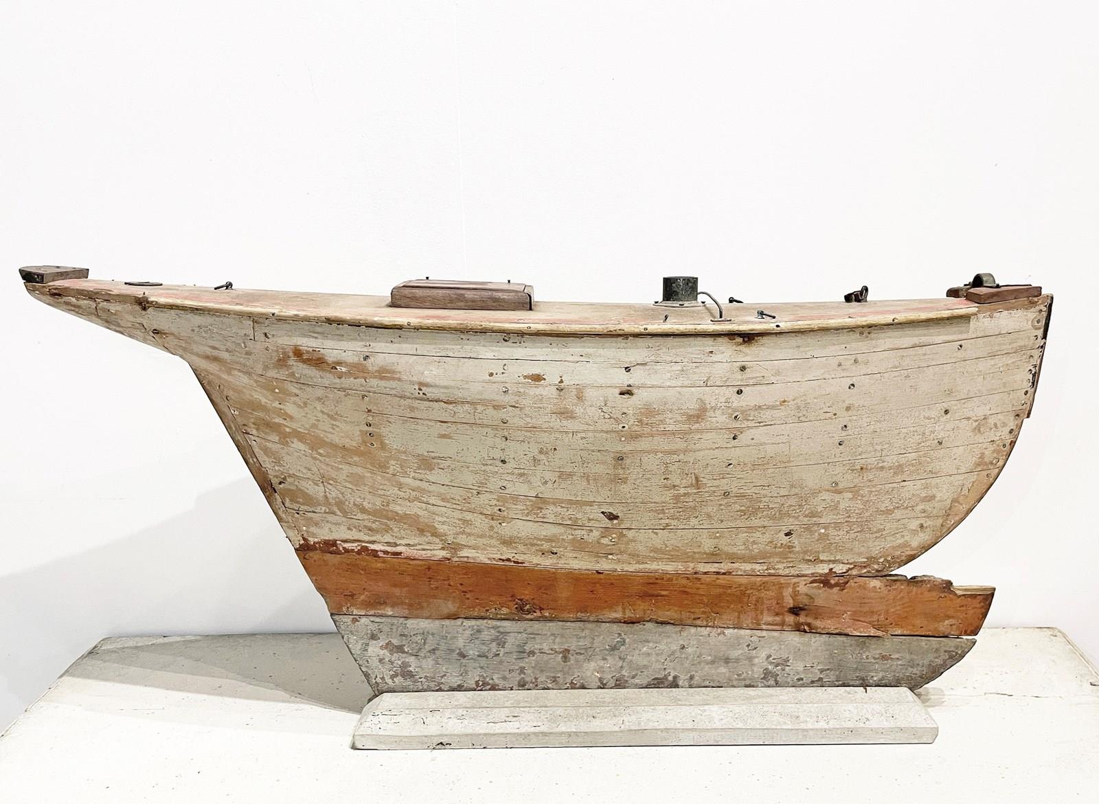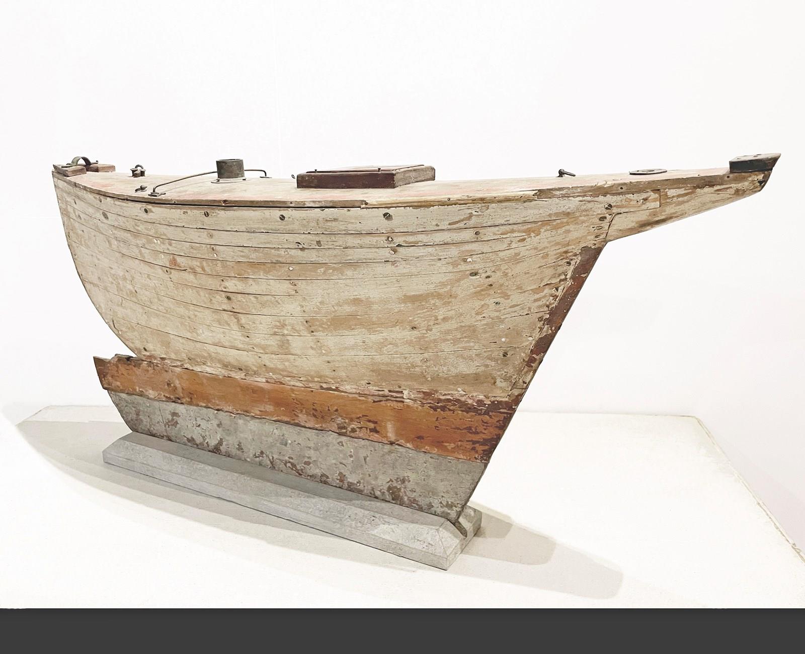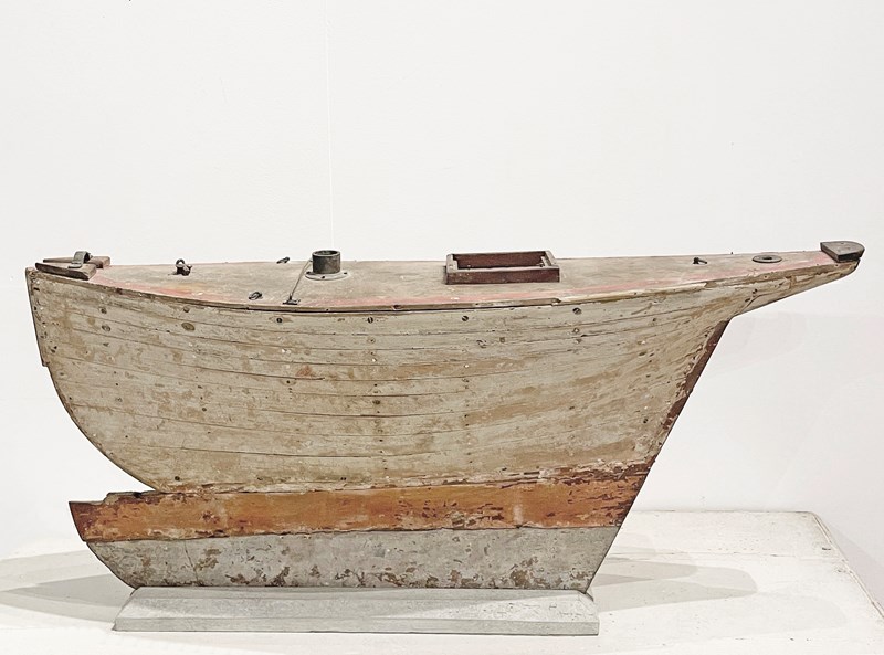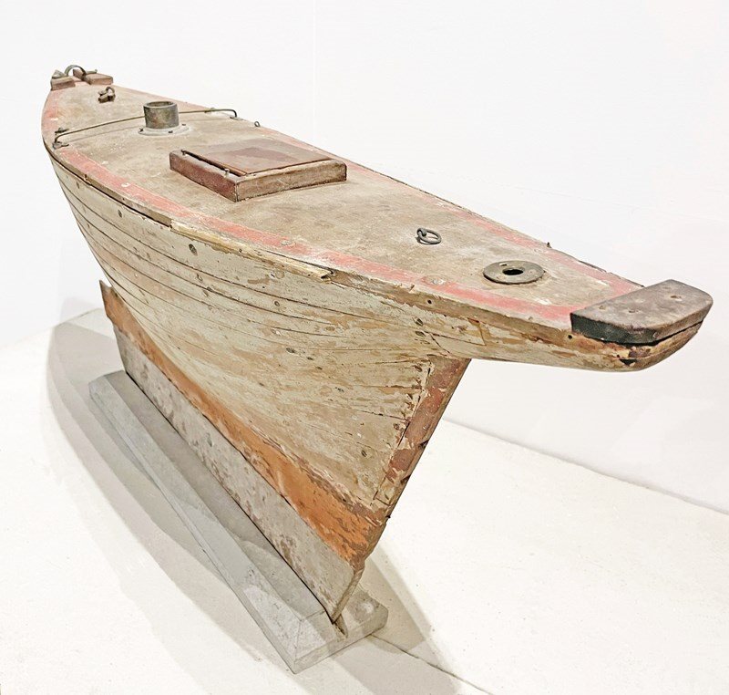 An English, late 19th c handmade 'Hull' of a Pond Sail Boat on a stand - evoking a charming image of gatherings of Edwardian men arriving around a lake or a pond with their precious Sail Boats - ready for the challenge! Now these lovely Hulls are much loved collectors items - and this one is a rare beauty. No sails available but the elegant and simple shape of the 'Hull' on its own is almost more appealing and evocative...circa 1900