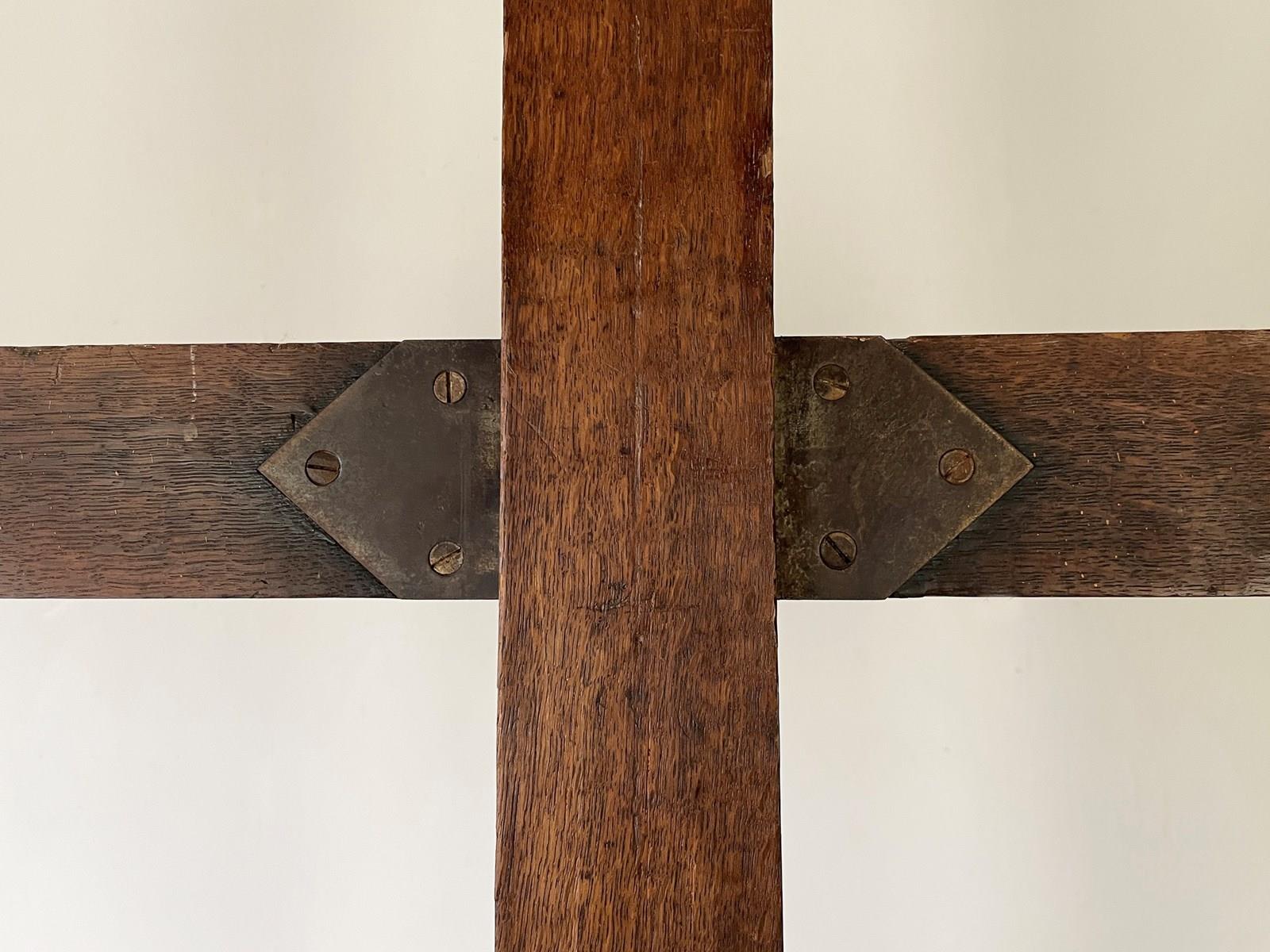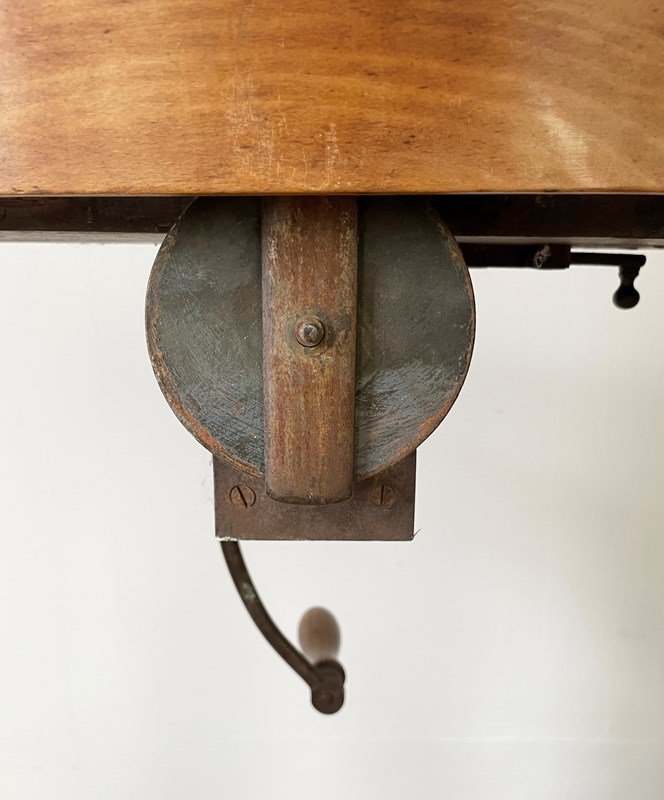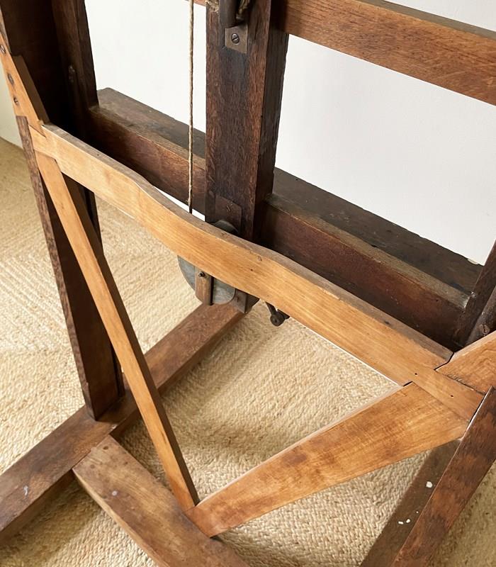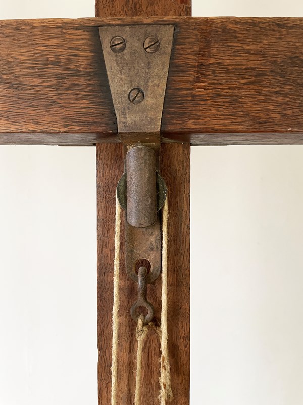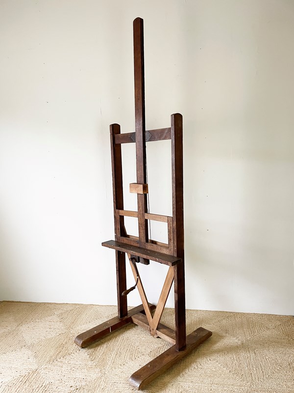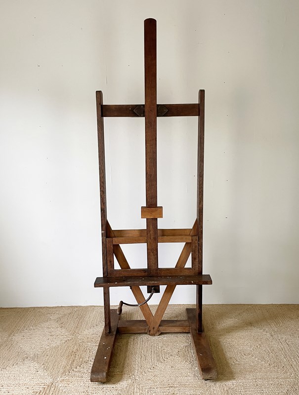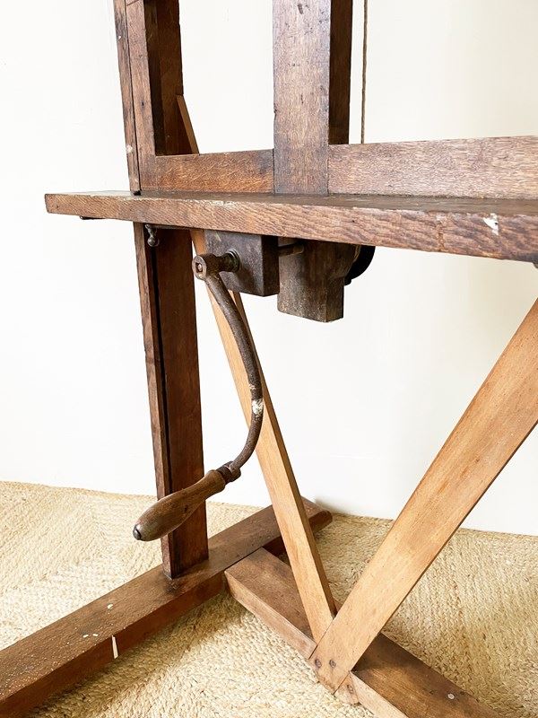 A large 19th Century French artist's easel constructed in oak. With wind-up handle and various other gadgetry for positioning a painting. This was obviously a much loved tool for a working artist, evident by it's aged and used condition after many years of use. Now looking for a new master/mistress to continue it's important supporting role in an aspiring artist's life and career. Circa 1860.