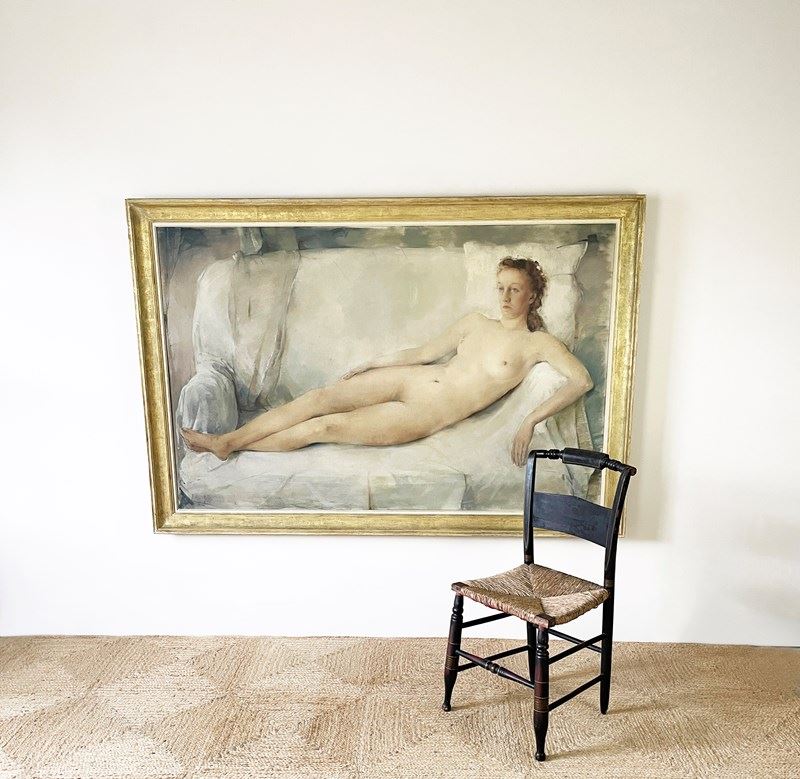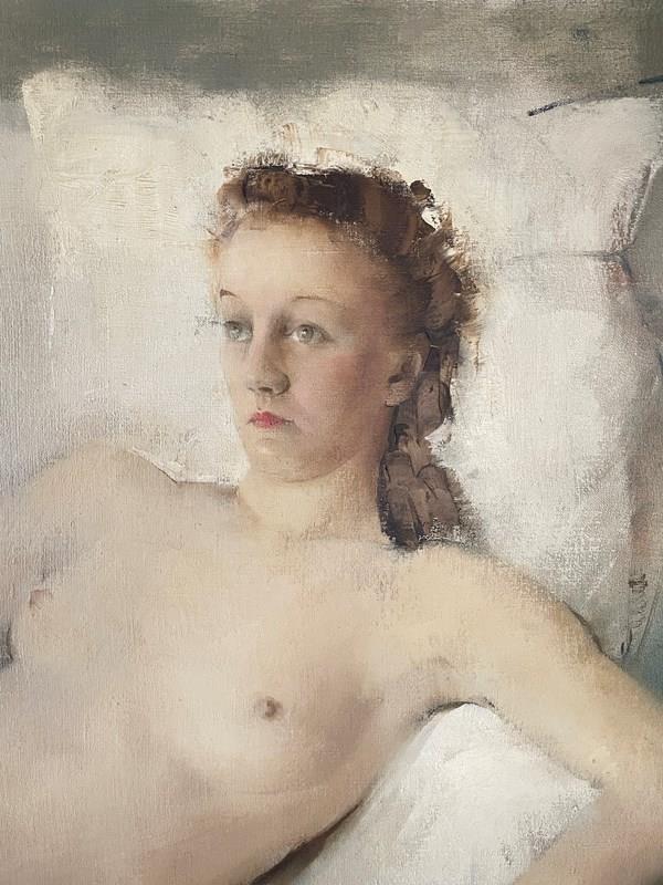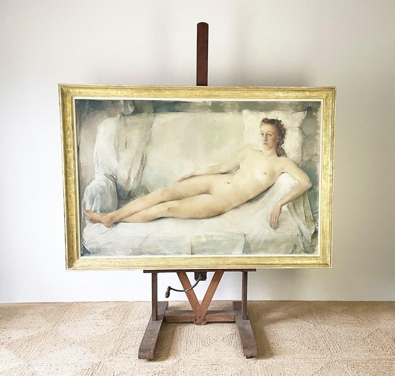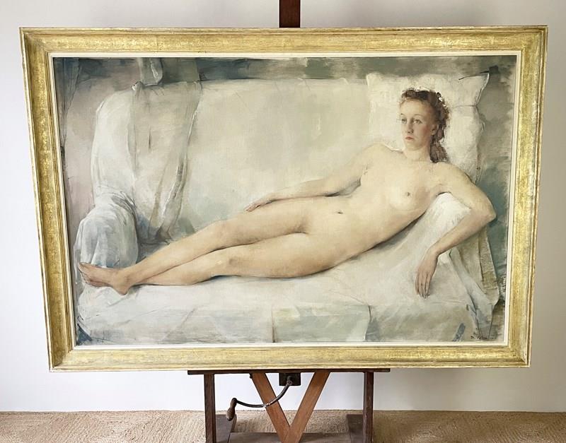 A large and impressive mid-20th Century nude oil on canvas painting by the Belgian artist, Maurice Felbier 1903 - 1991. The artist has used a pallet of soft and subtle colours capturing the gently, relaxed mood of his reclining model. Maurice Felbier was born in Antwerp in 1903. He became a talented painter and woodcarver. He was educated at the Academy 1919-1922 This large Nude painting is signed and dated 1943.