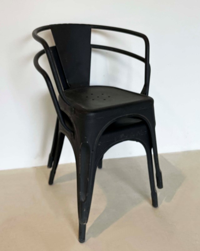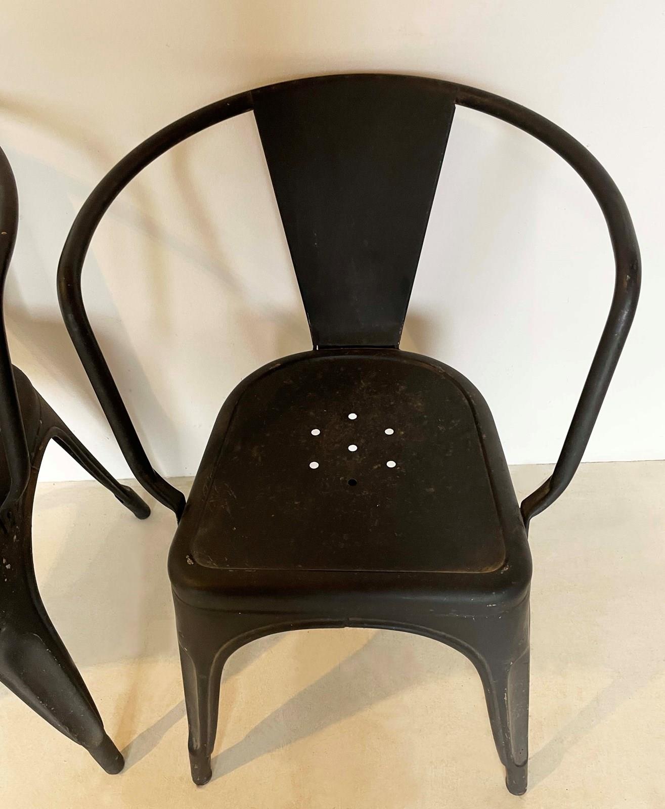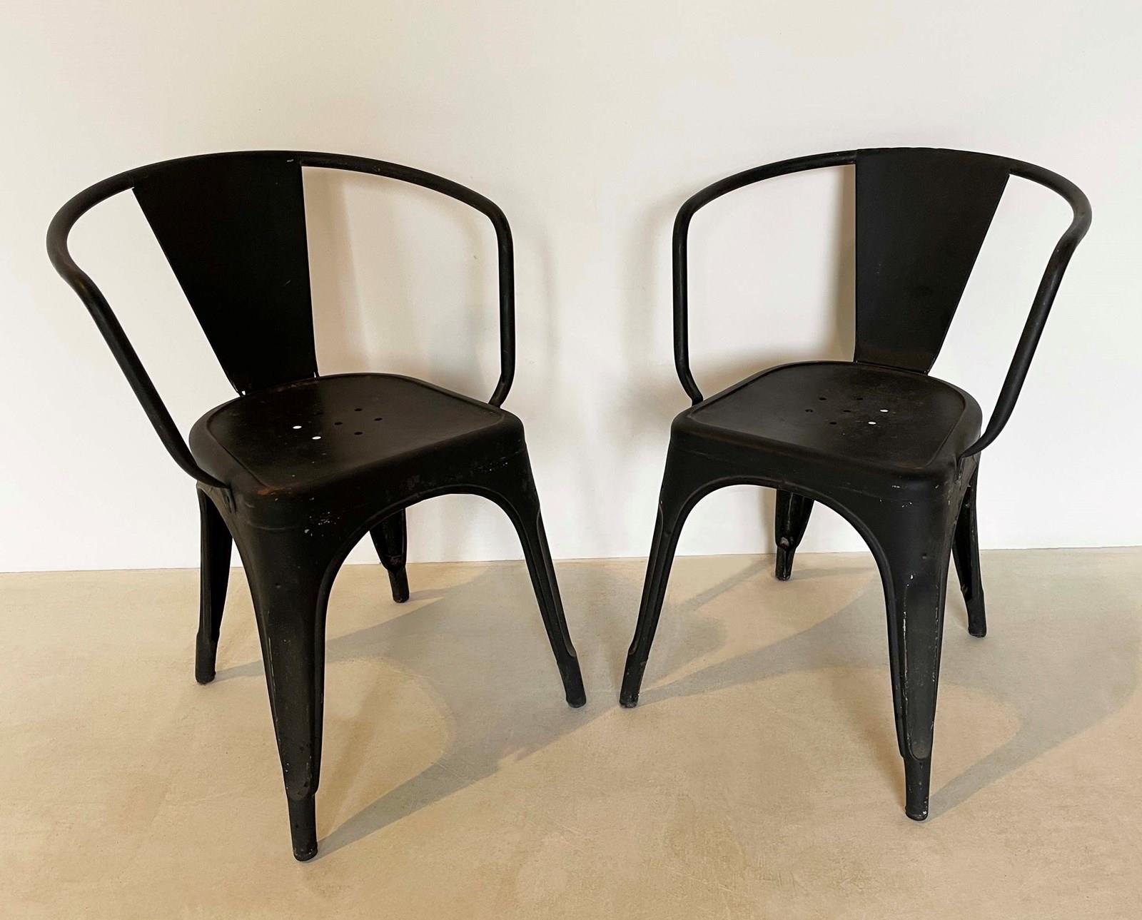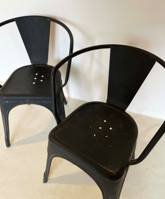 A nice pair of French 'Tolix' Armchairs suitable for indoor or outdoor use - perforated seats allow the rain to pass through. The Tolix factory specialized in pressed iron furniture in the 1940's and their furniture became very popular...and still is - this pair is painted a matt black. Circa 1940